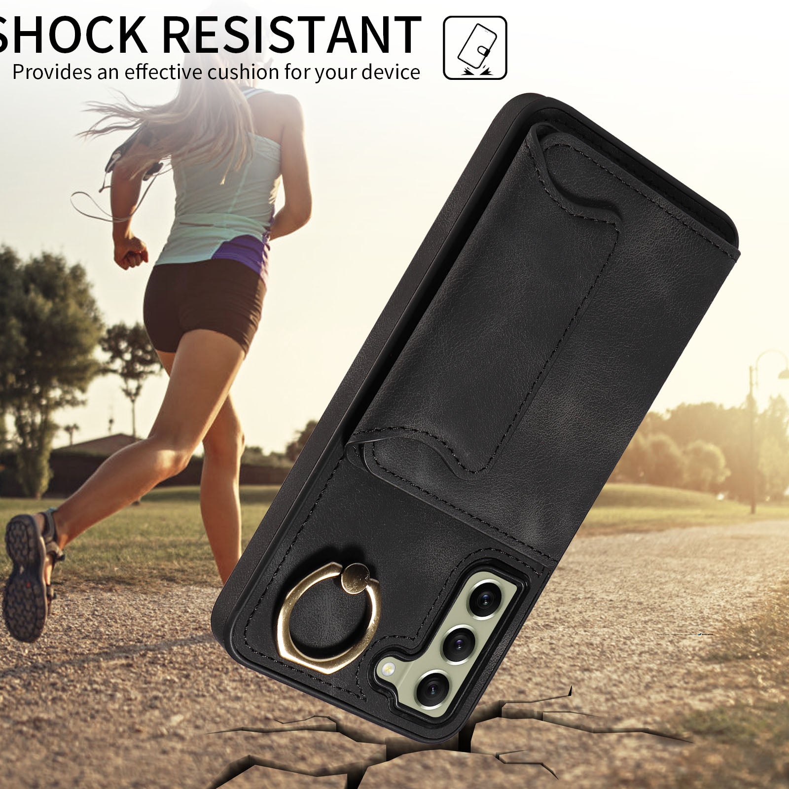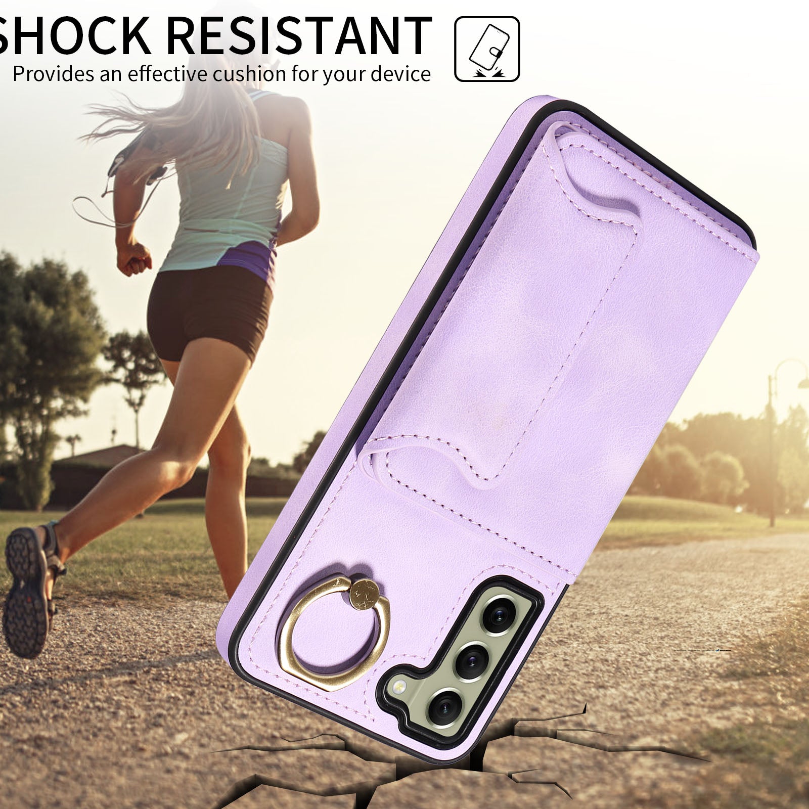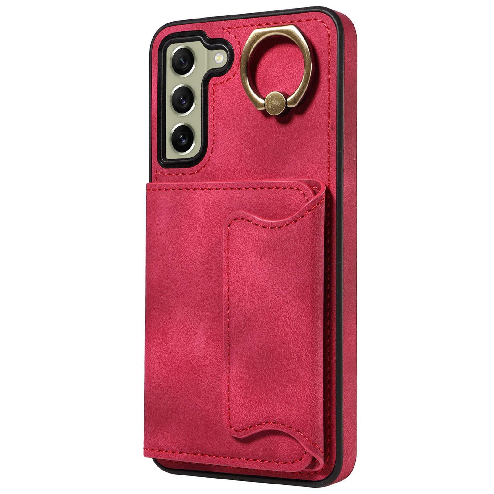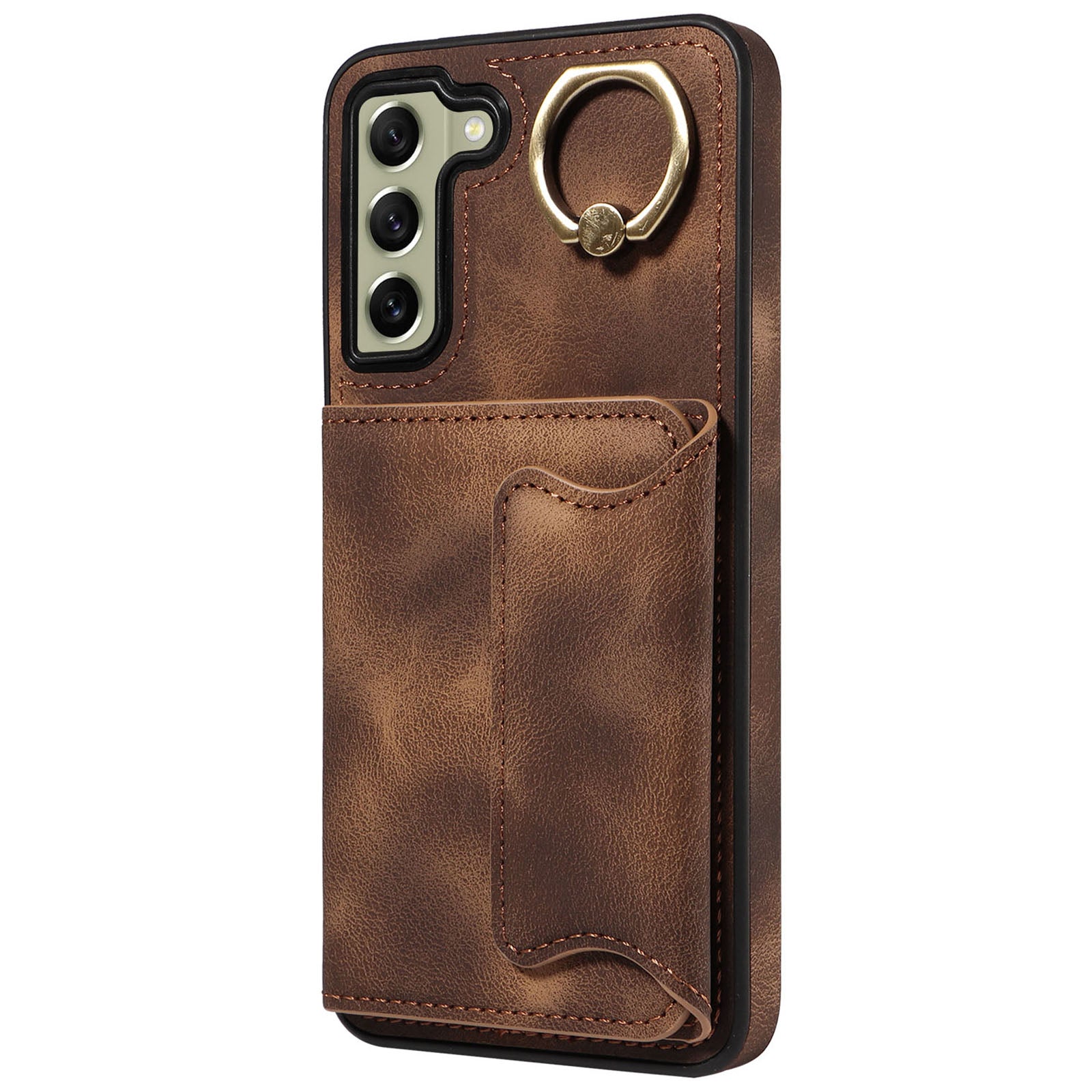 001 For Samsung Galaxy S21 FE 5G PU Leather+TPU Cover Card Holder Phone Case with Ring Kickstand