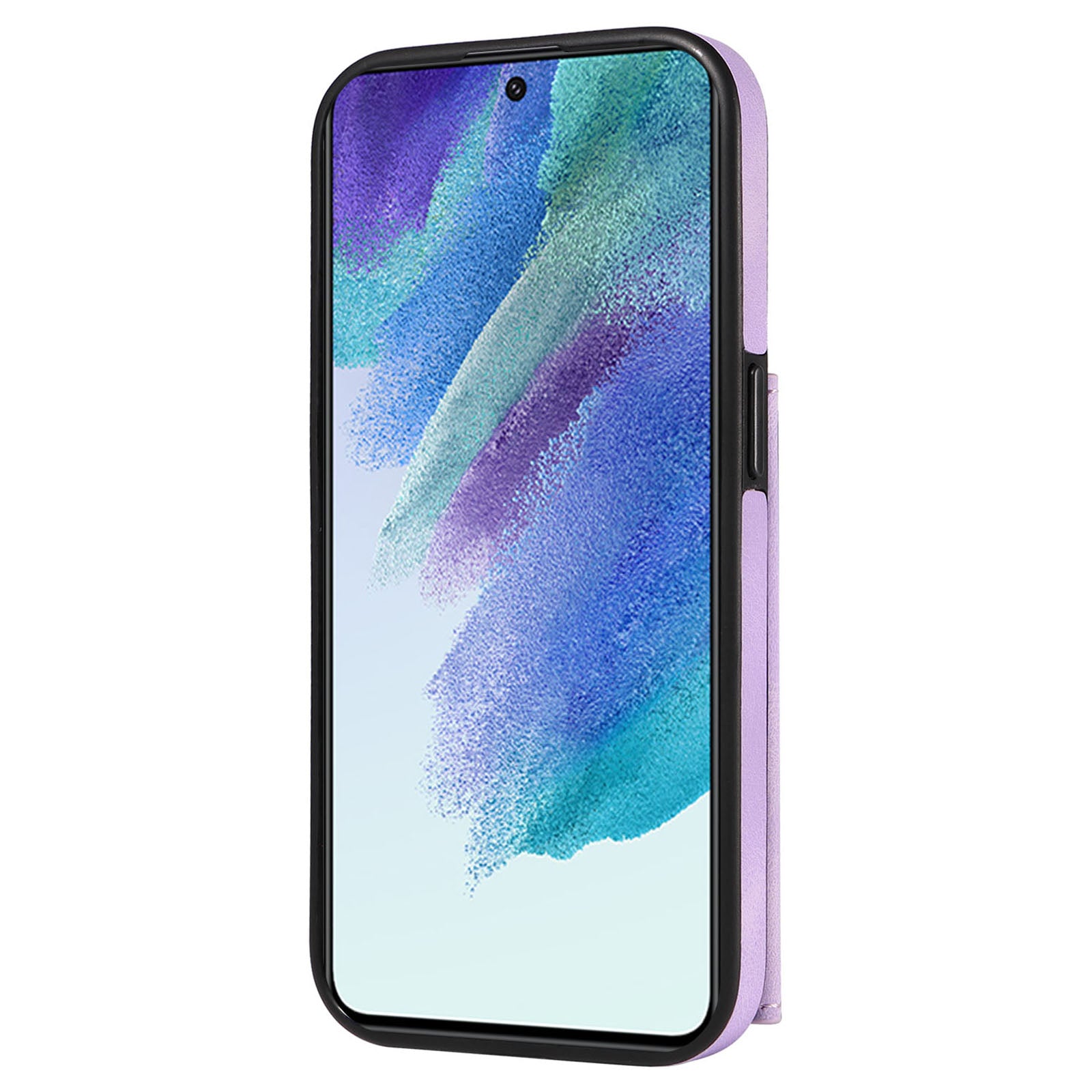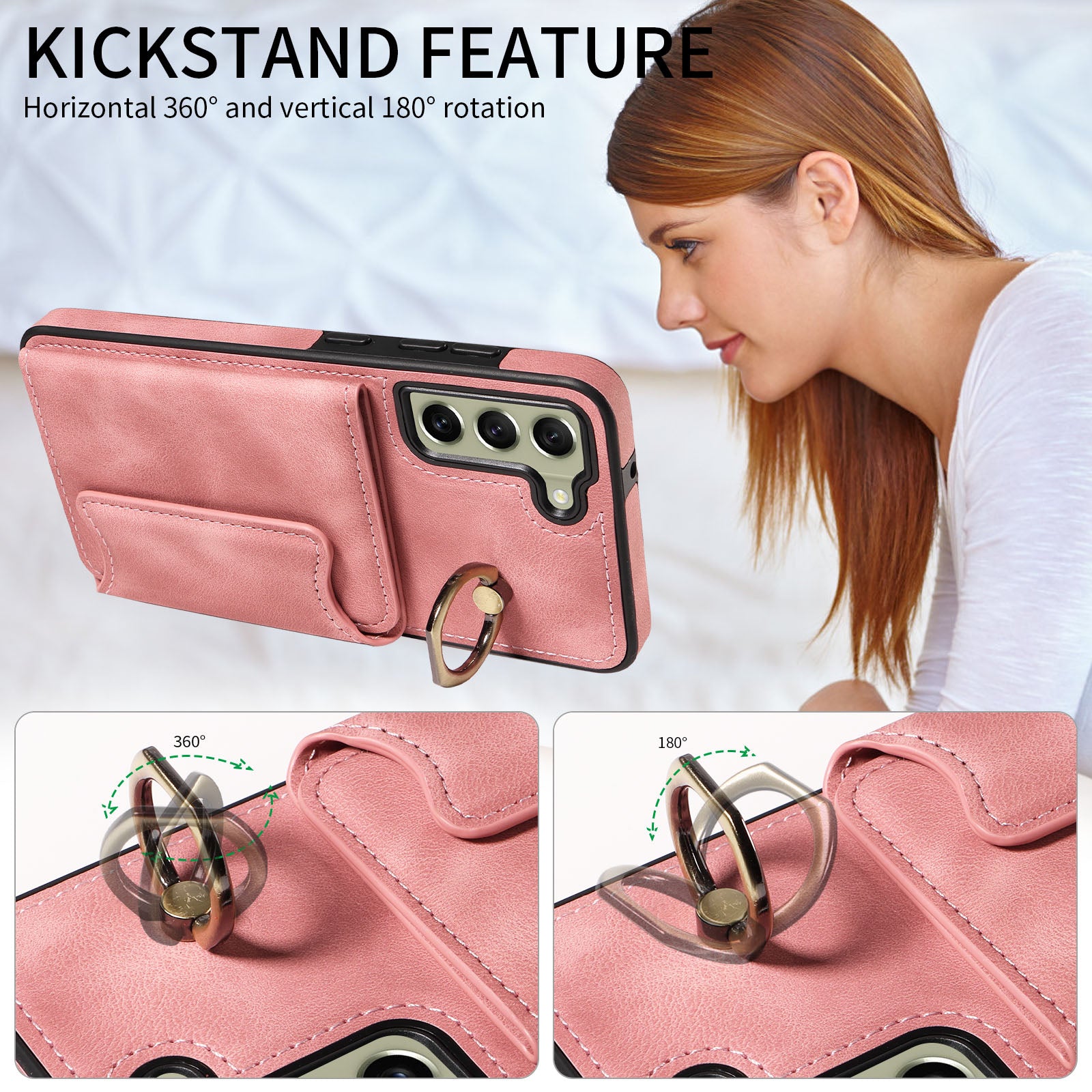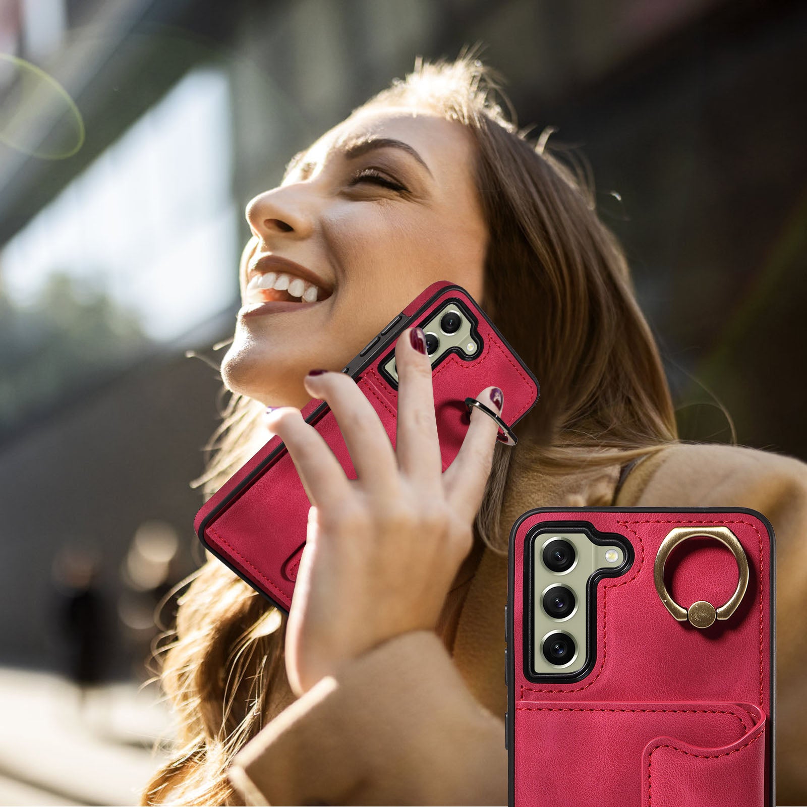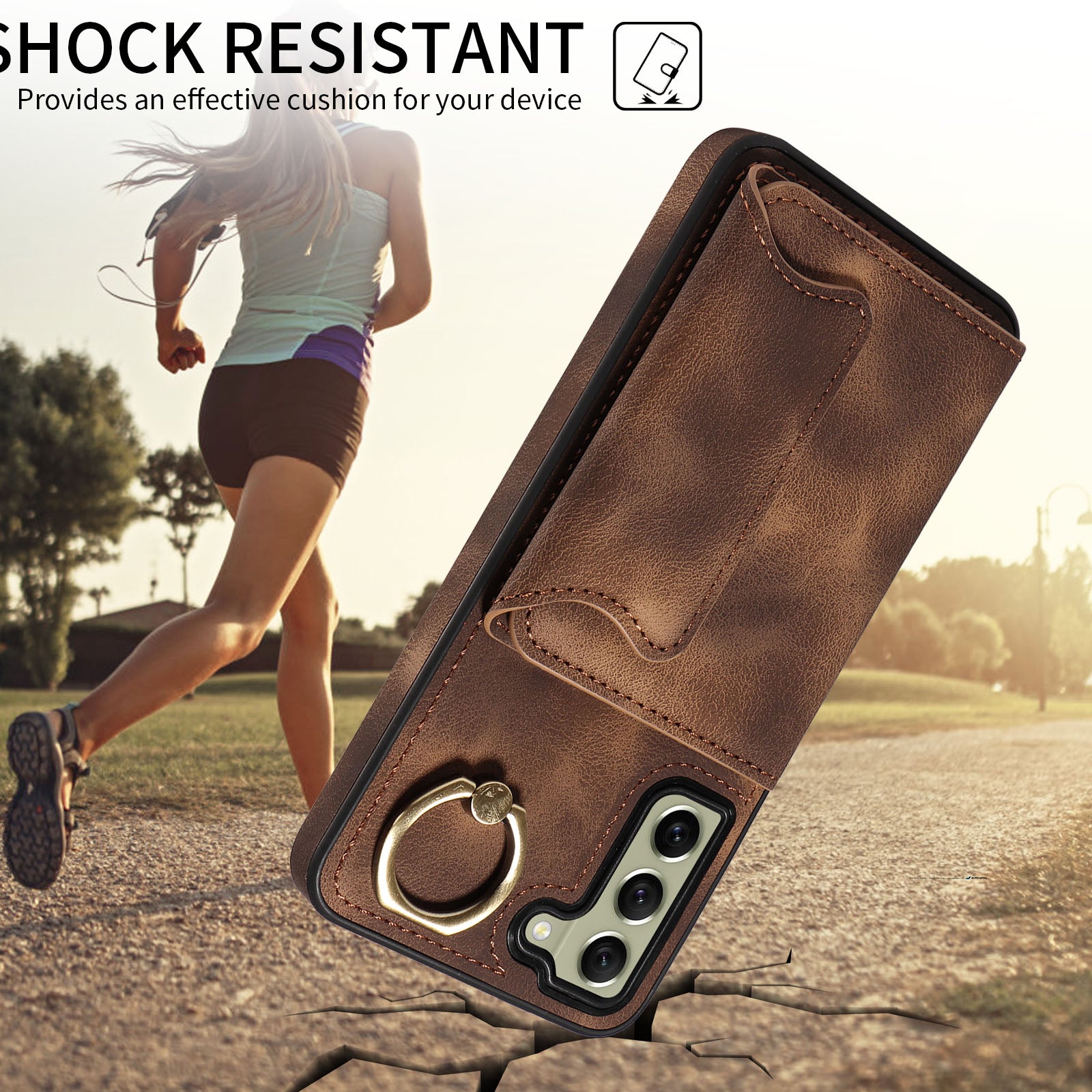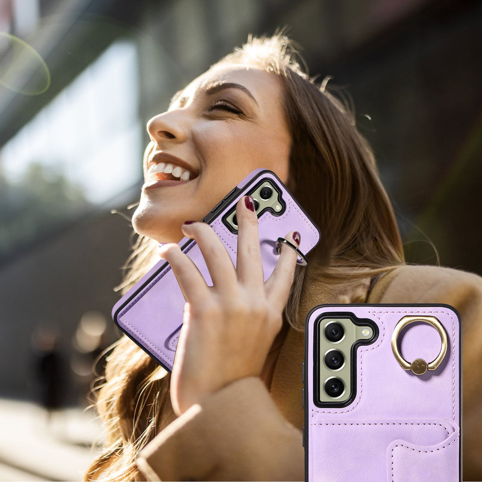 001 For Samsung Galaxy S21 FE 5G PU Leather+TPU Cover Card Holder Phone Case with Ring Kickstand