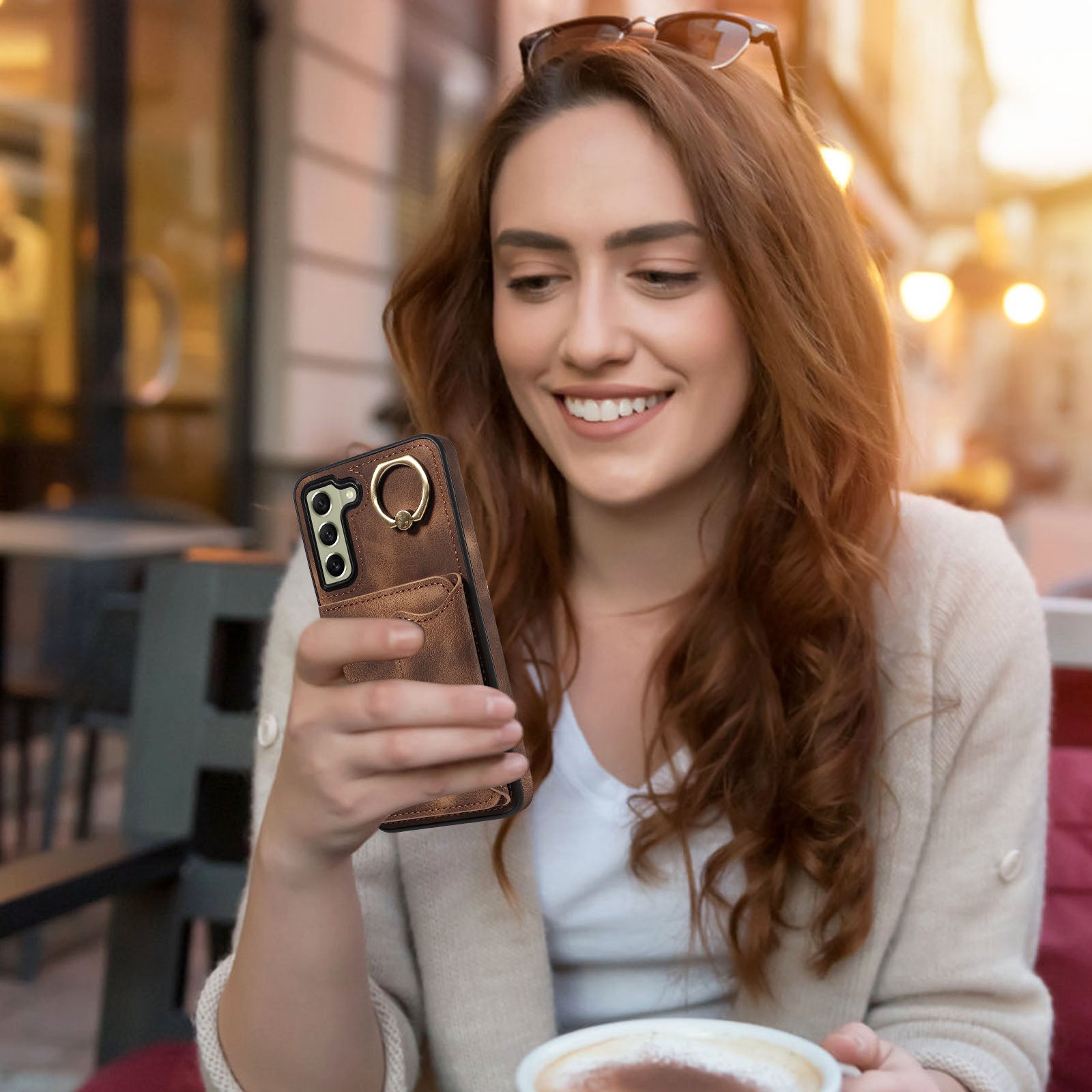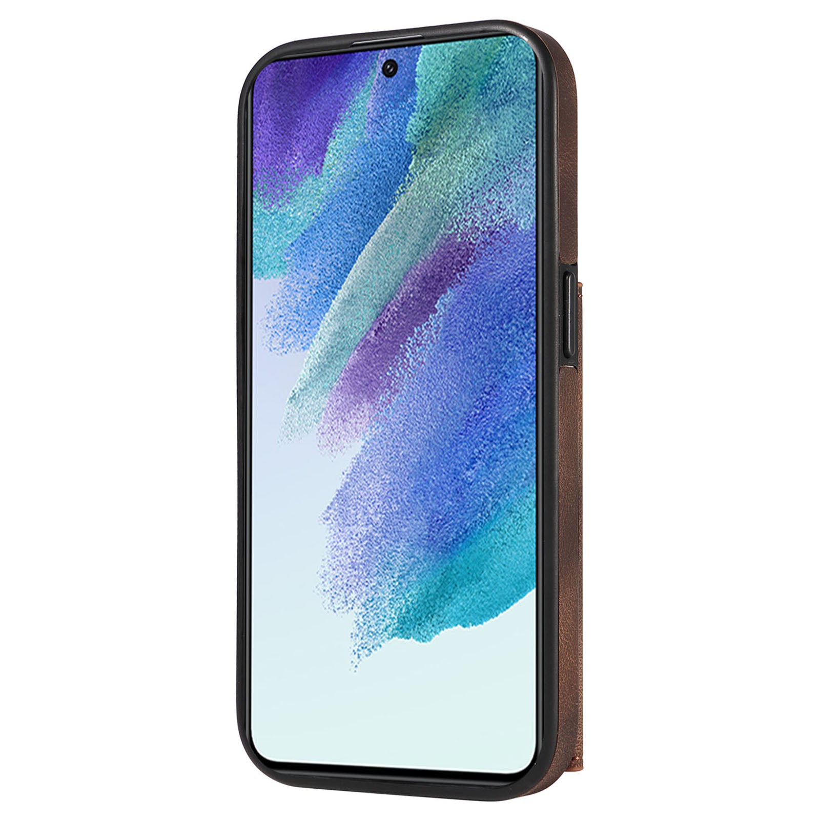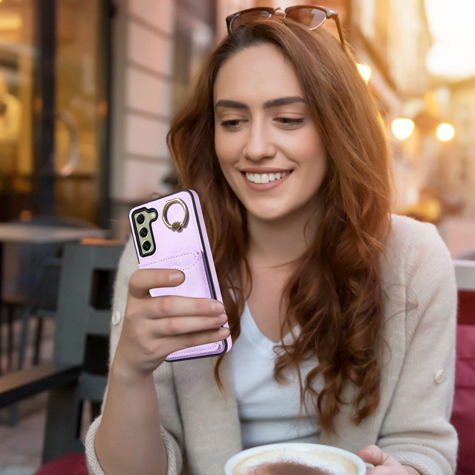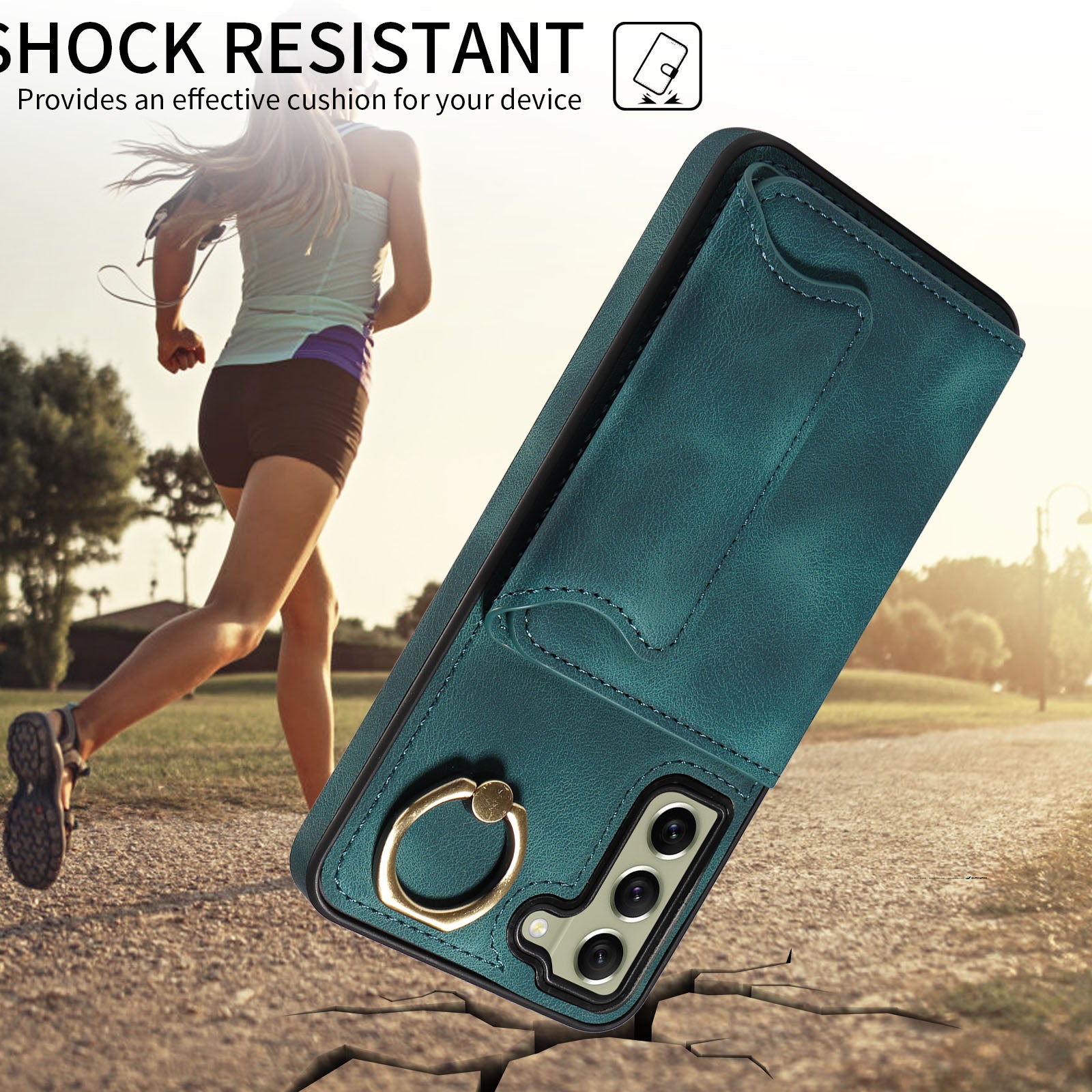 001 For Samsung Galaxy S21 FE 5G PU Leather+TPU Cover Card Holder Phone Case with Ring Kickstand