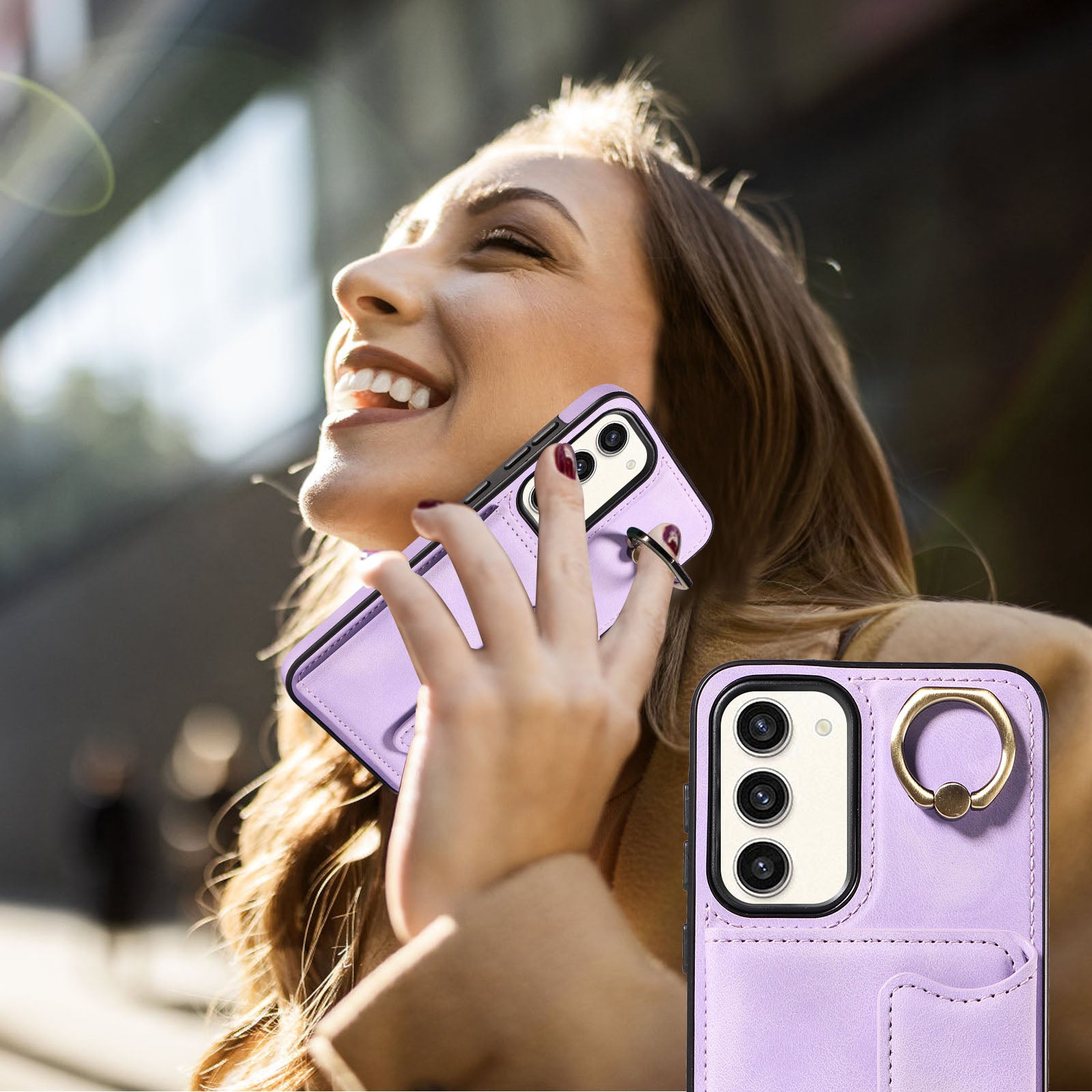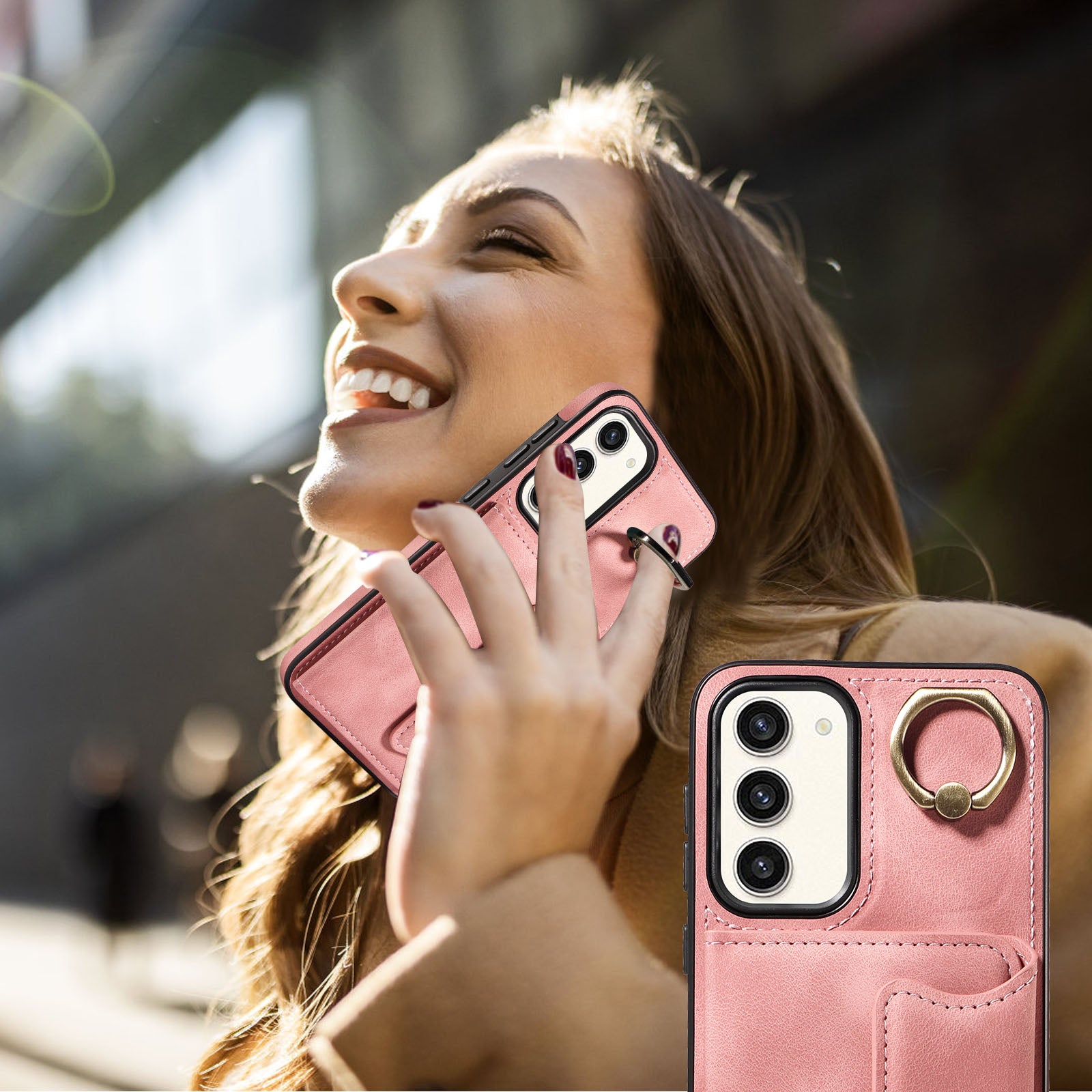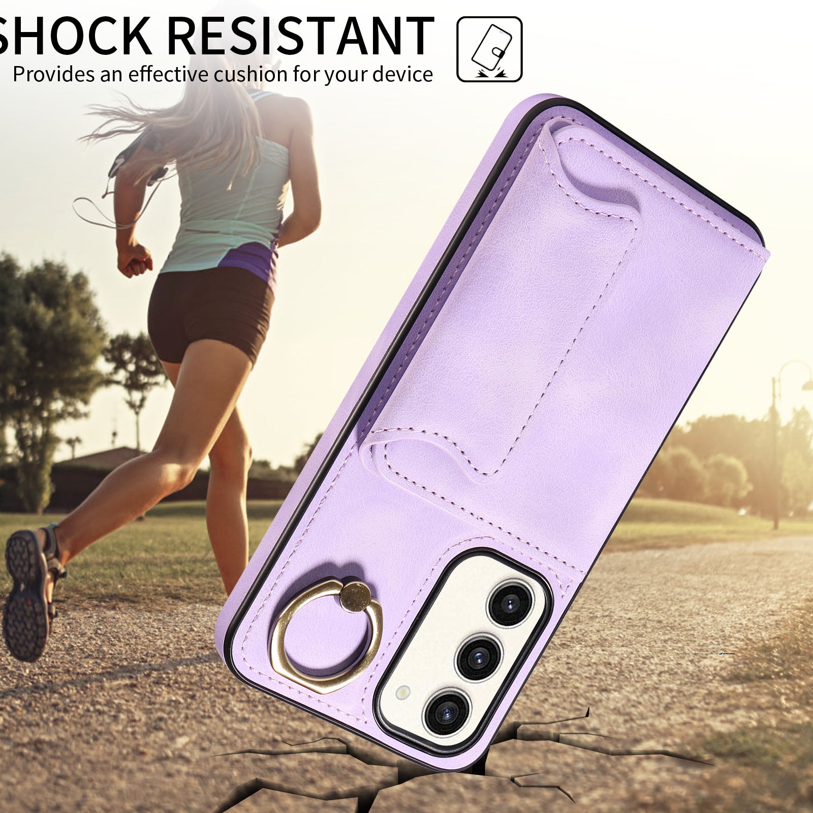 001 For Samsung Galaxy S23+ Card Holder Back Cover Ring Kickstand PU Leather Coated TPU Phone Case