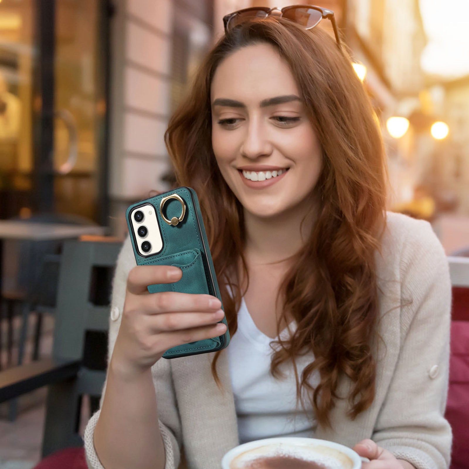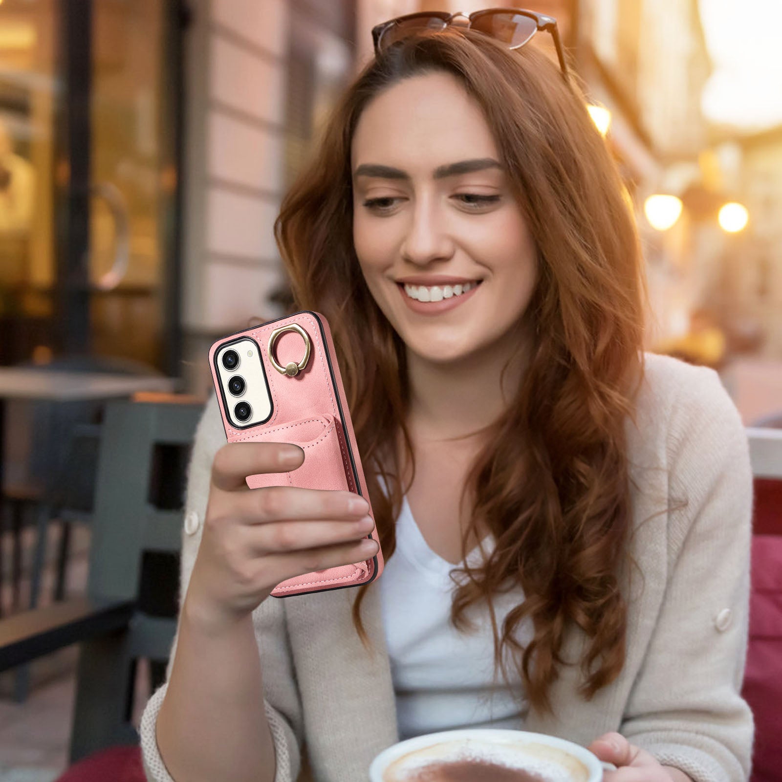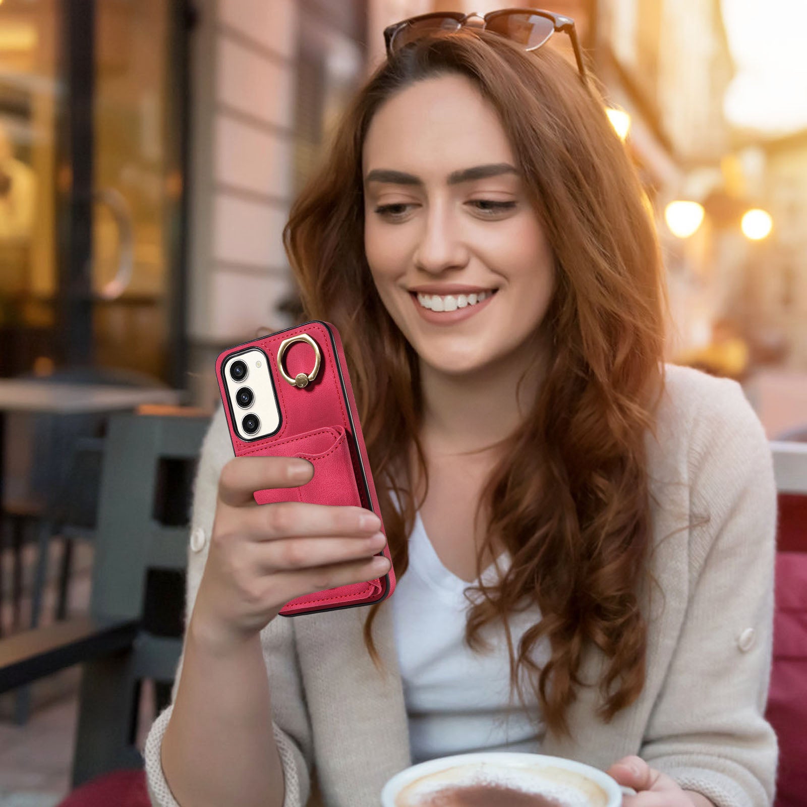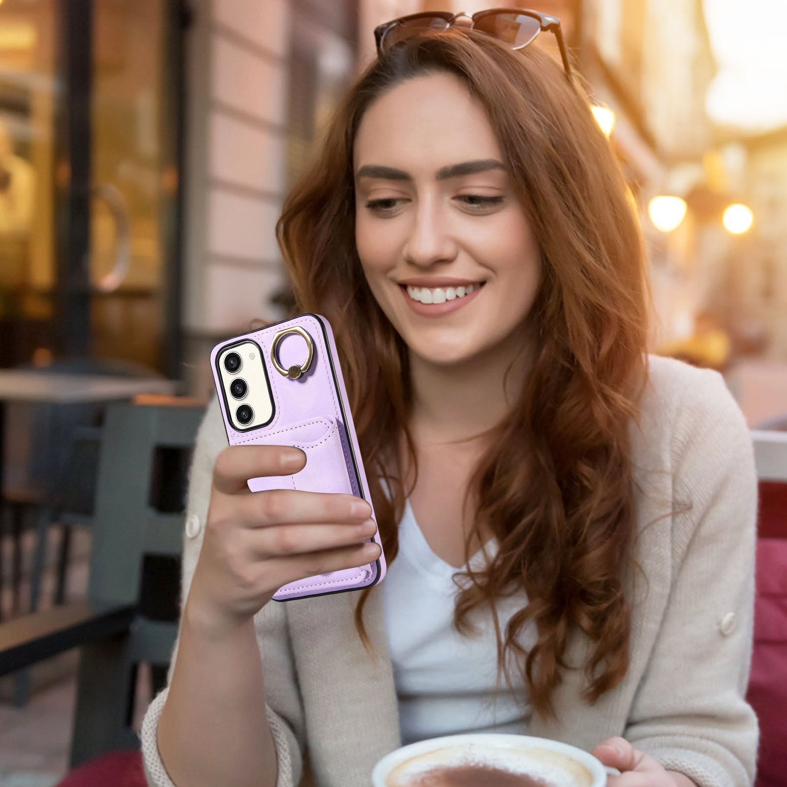 001 For Samsung Galaxy S23+ Card Holder Back Cover Ring Kickstand PU Leather Coated TPU Phone Case