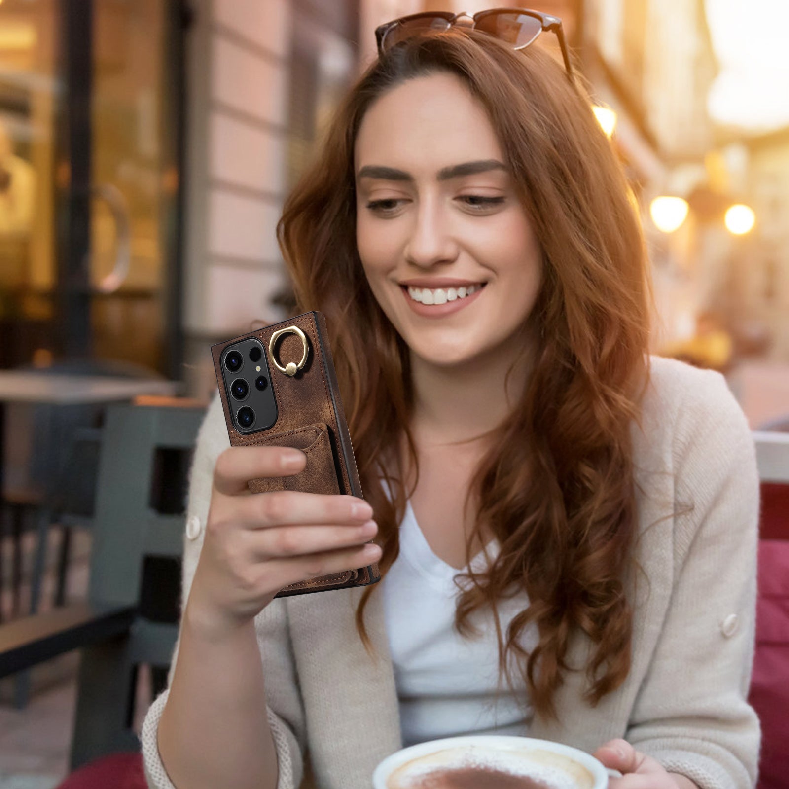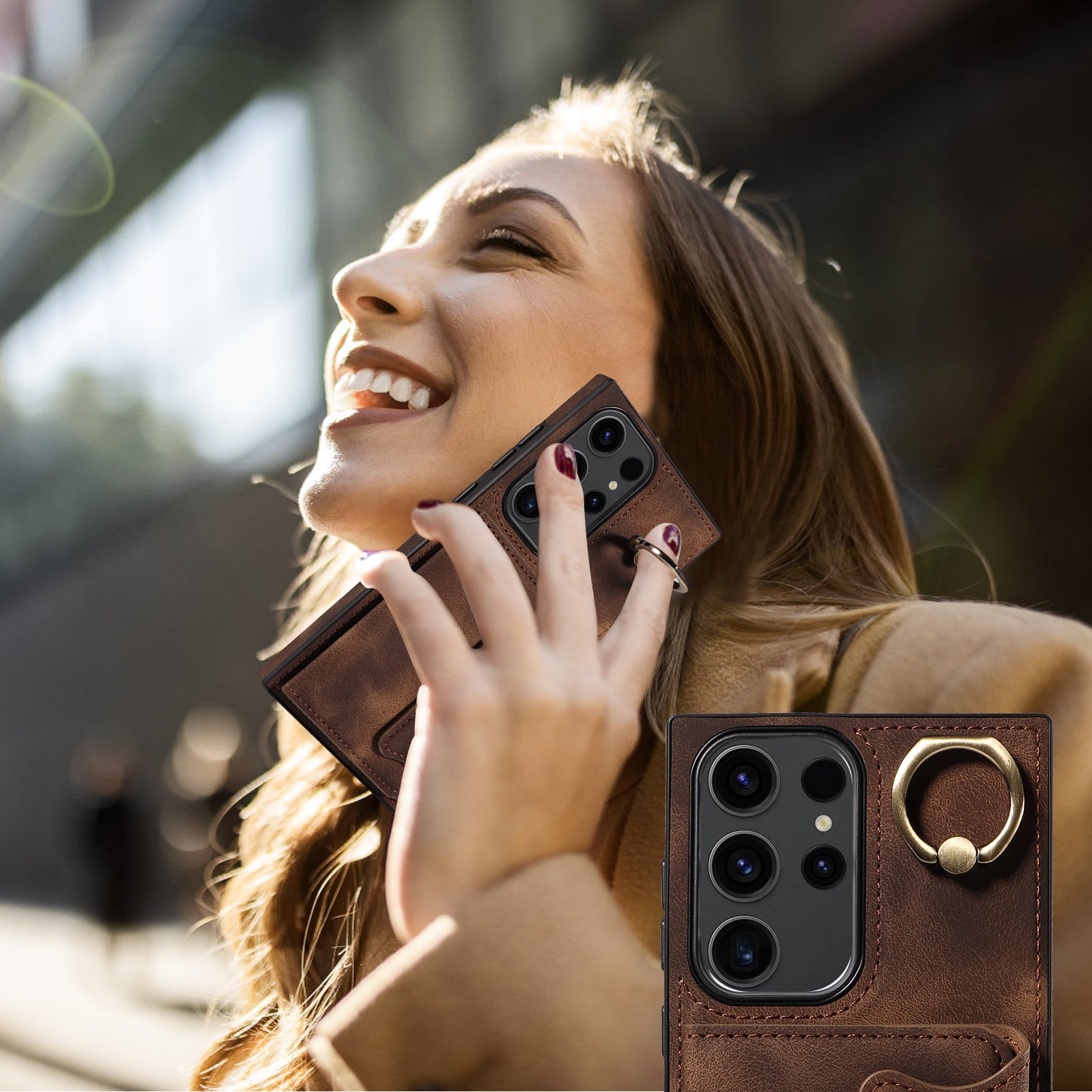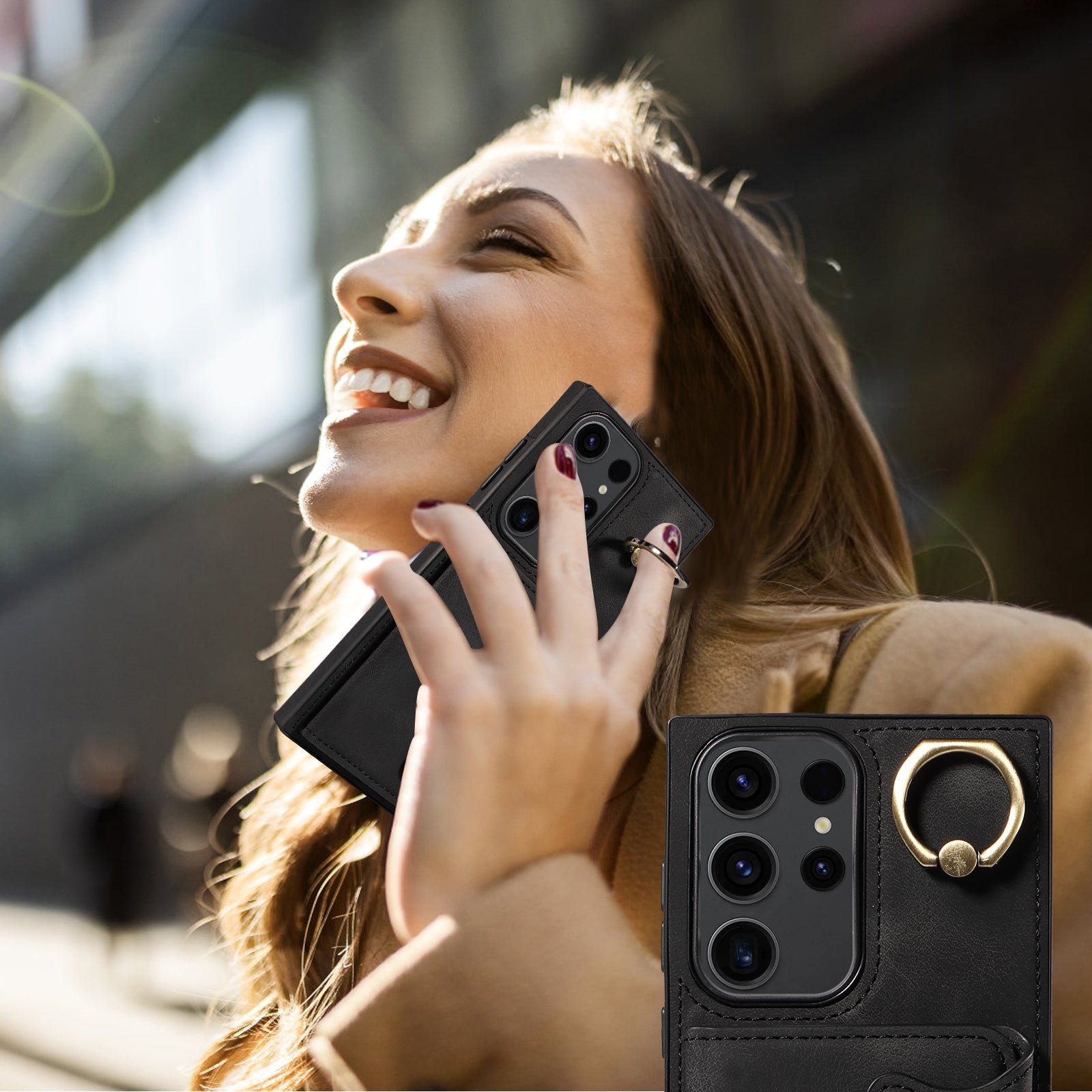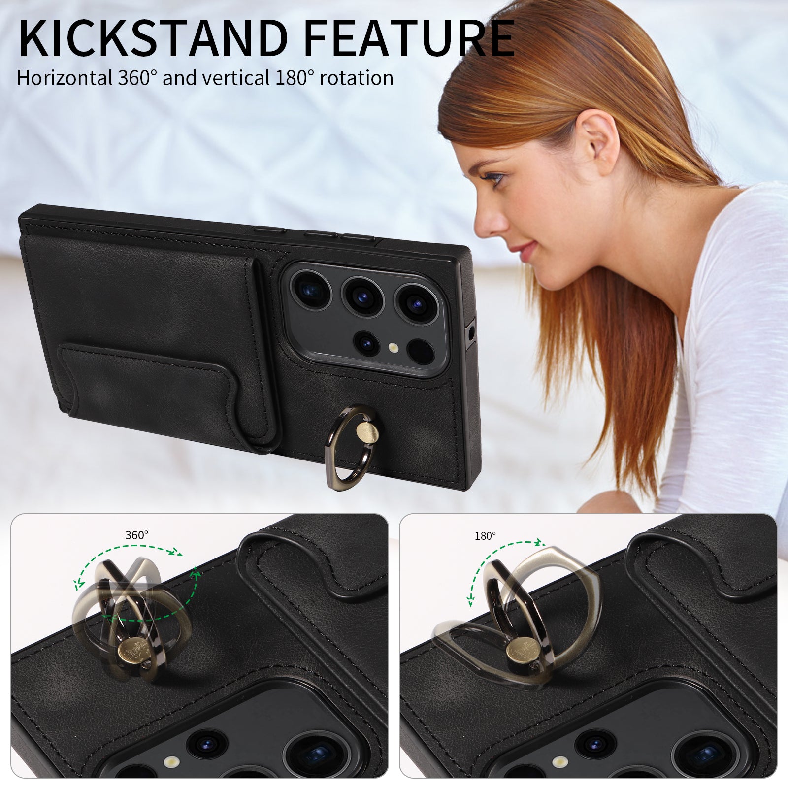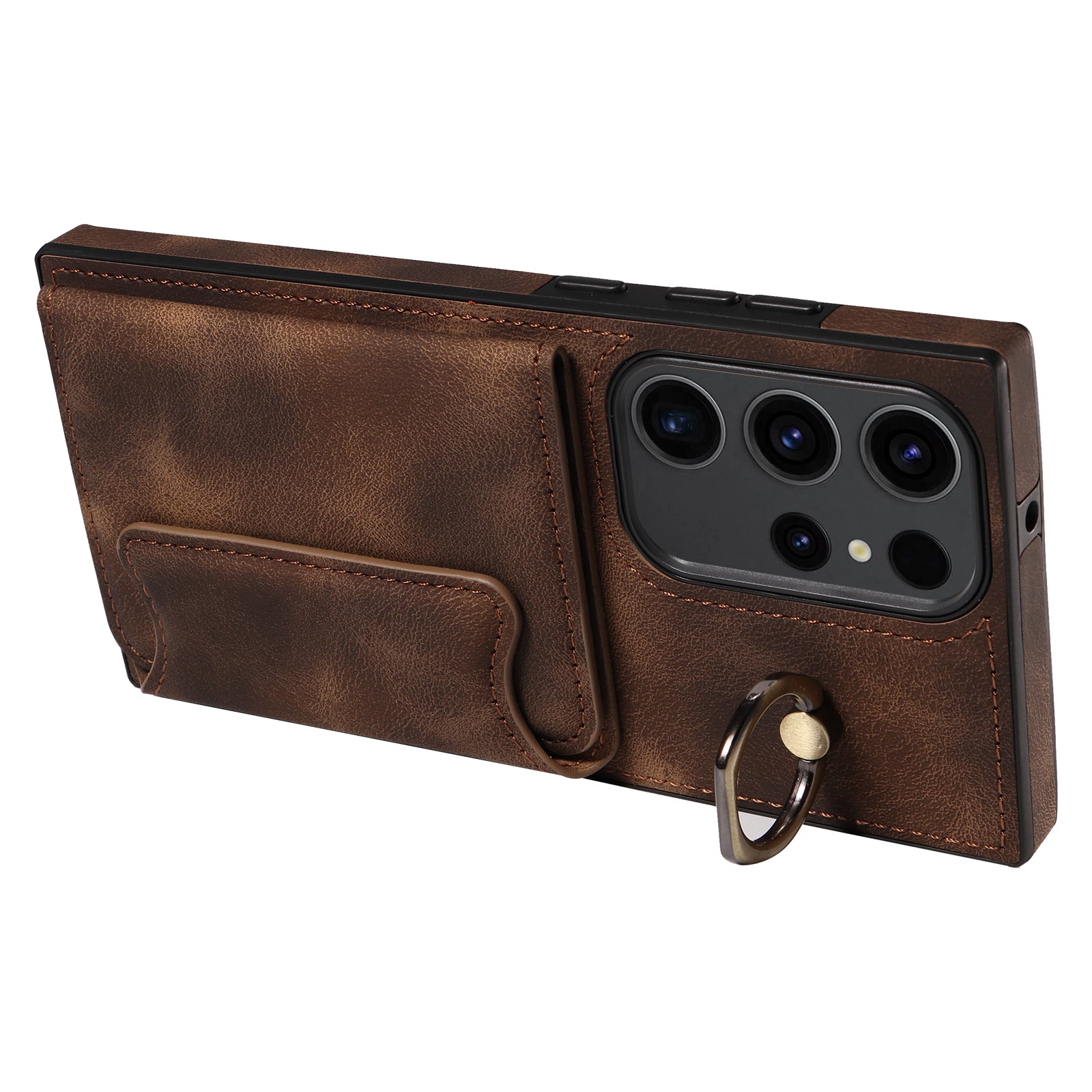 001 For Samsung Galaxy S23 Ultra PU Leather+TPU Card Holder Phone Case Ring Kickstand Skin-touch Cover