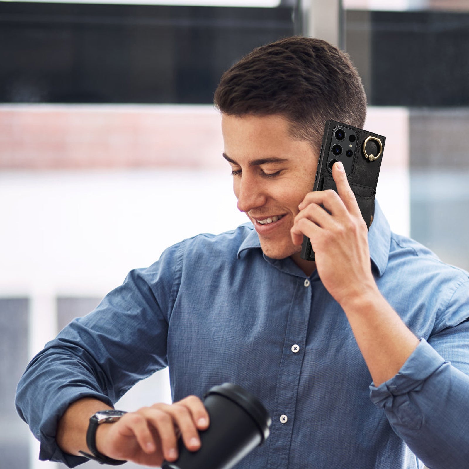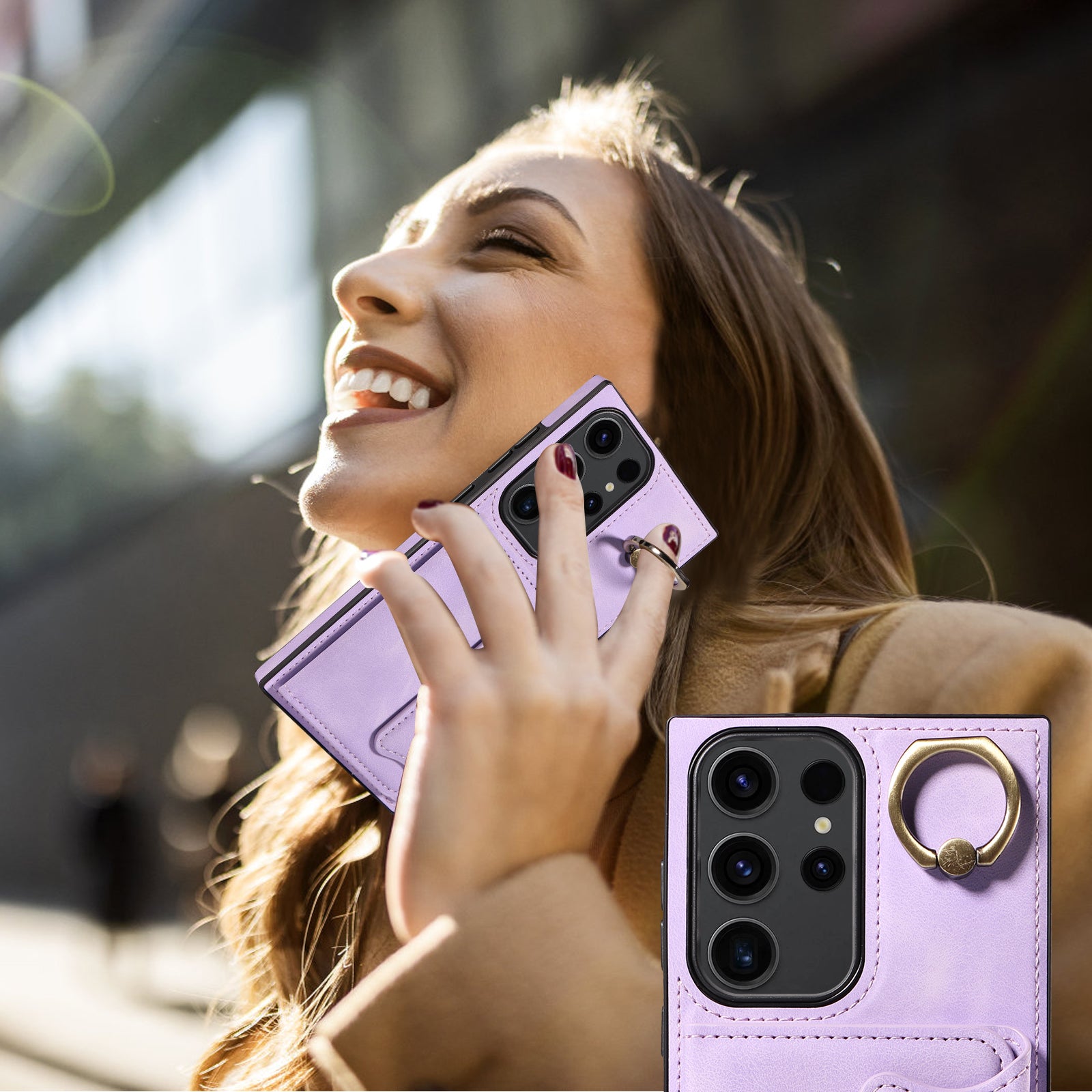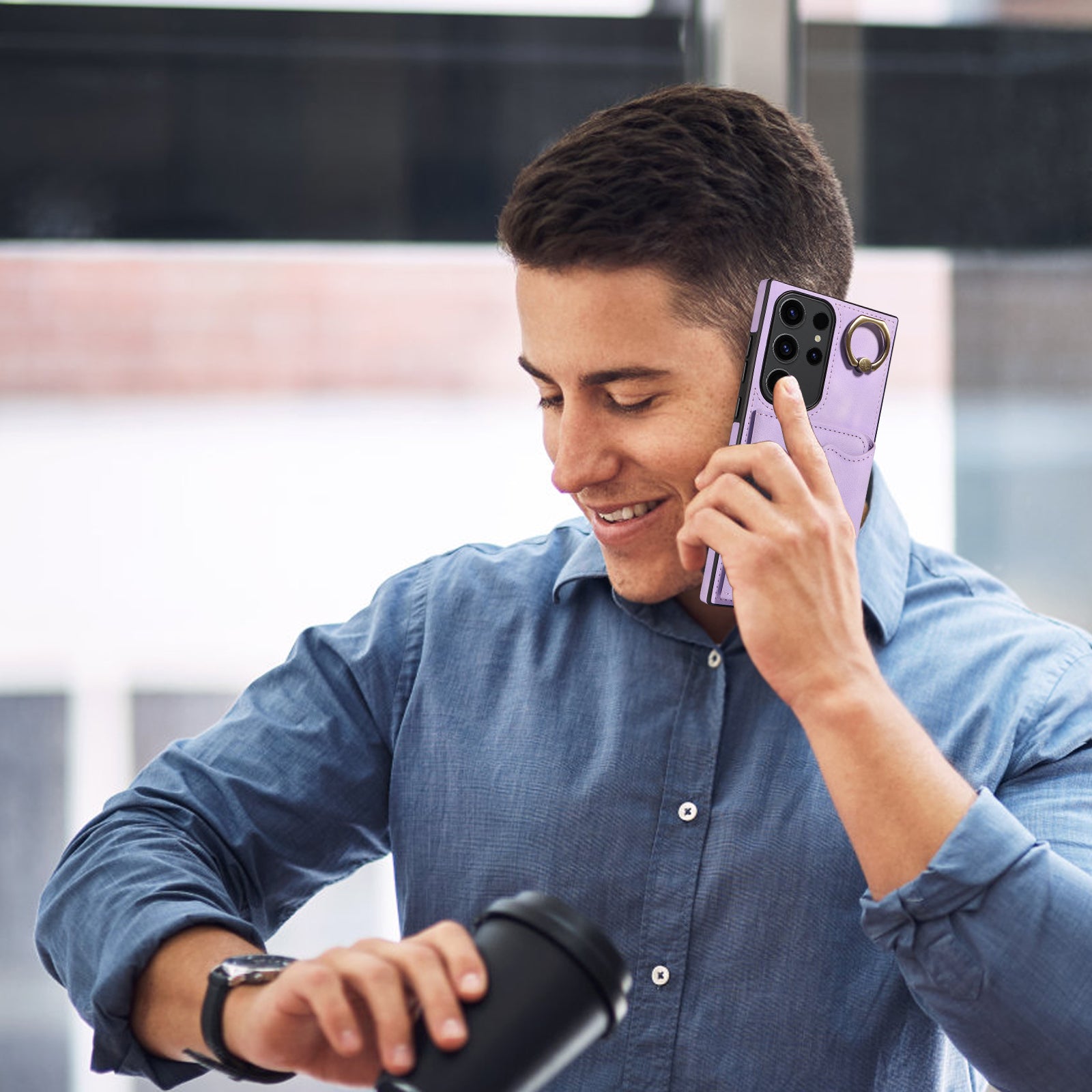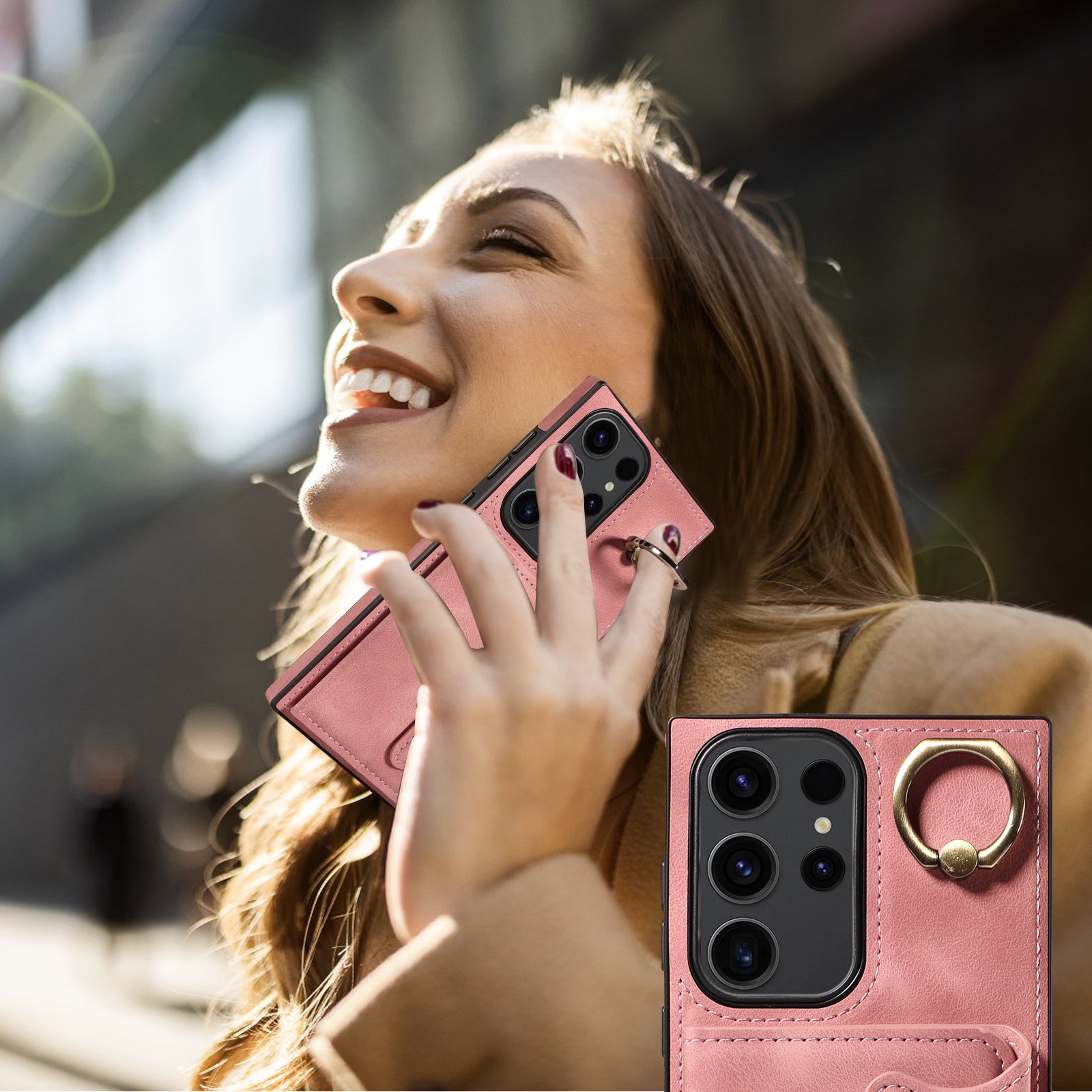 001 For Samsung Galaxy S23 Ultra PU Leather+TPU Card Holder Phone Case Ring Kickstand Skin-touch Cover