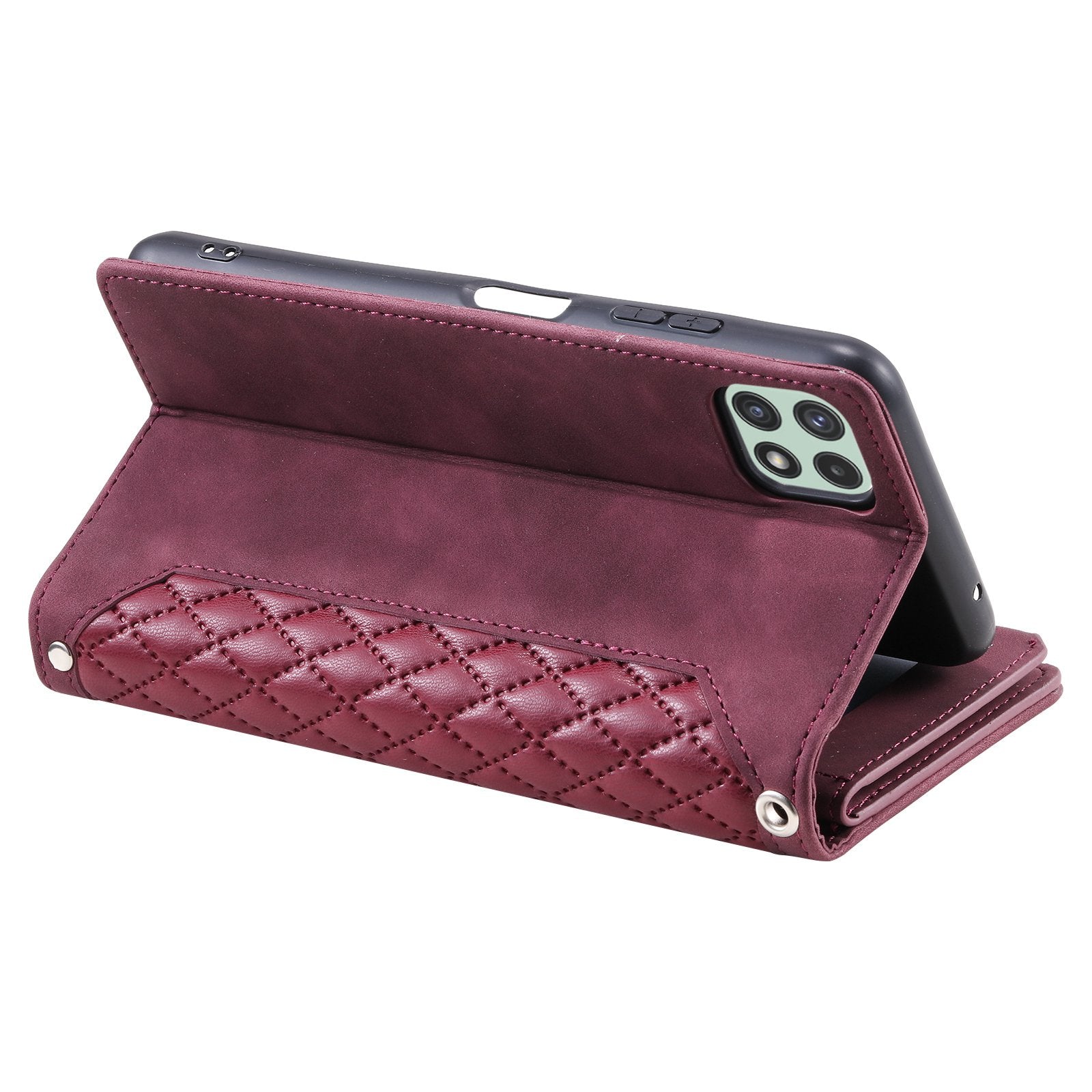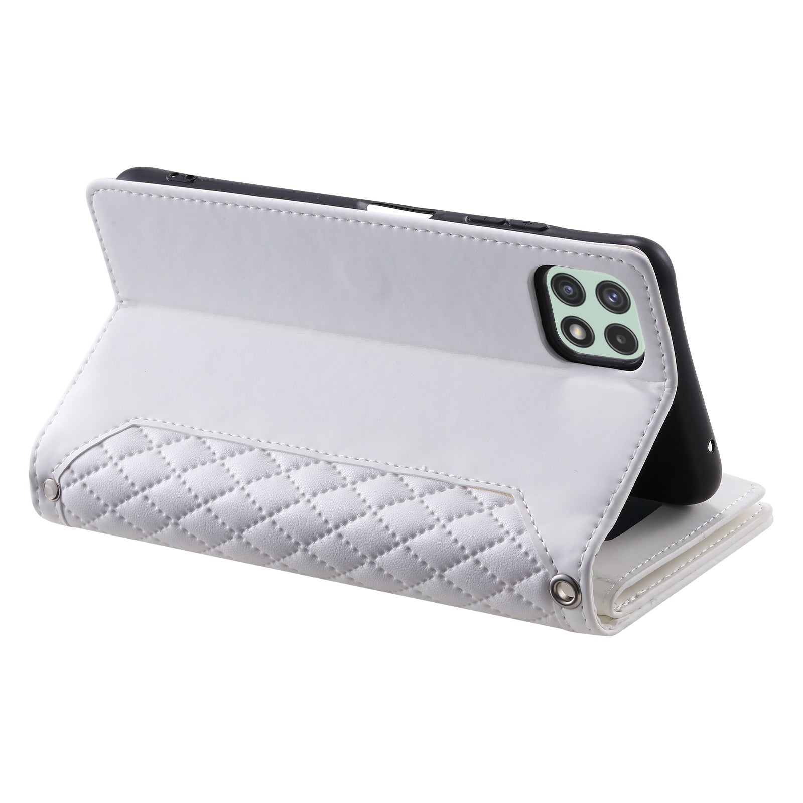 005 Phone Case Pouch for Samsung Galaxy A22 5G (EU Version), Anti-scratch Rhombus Grid Textured PU Leather Zipper Pocket Stand Wallet Phone Case with Multiple Card Slots and Handy Strap