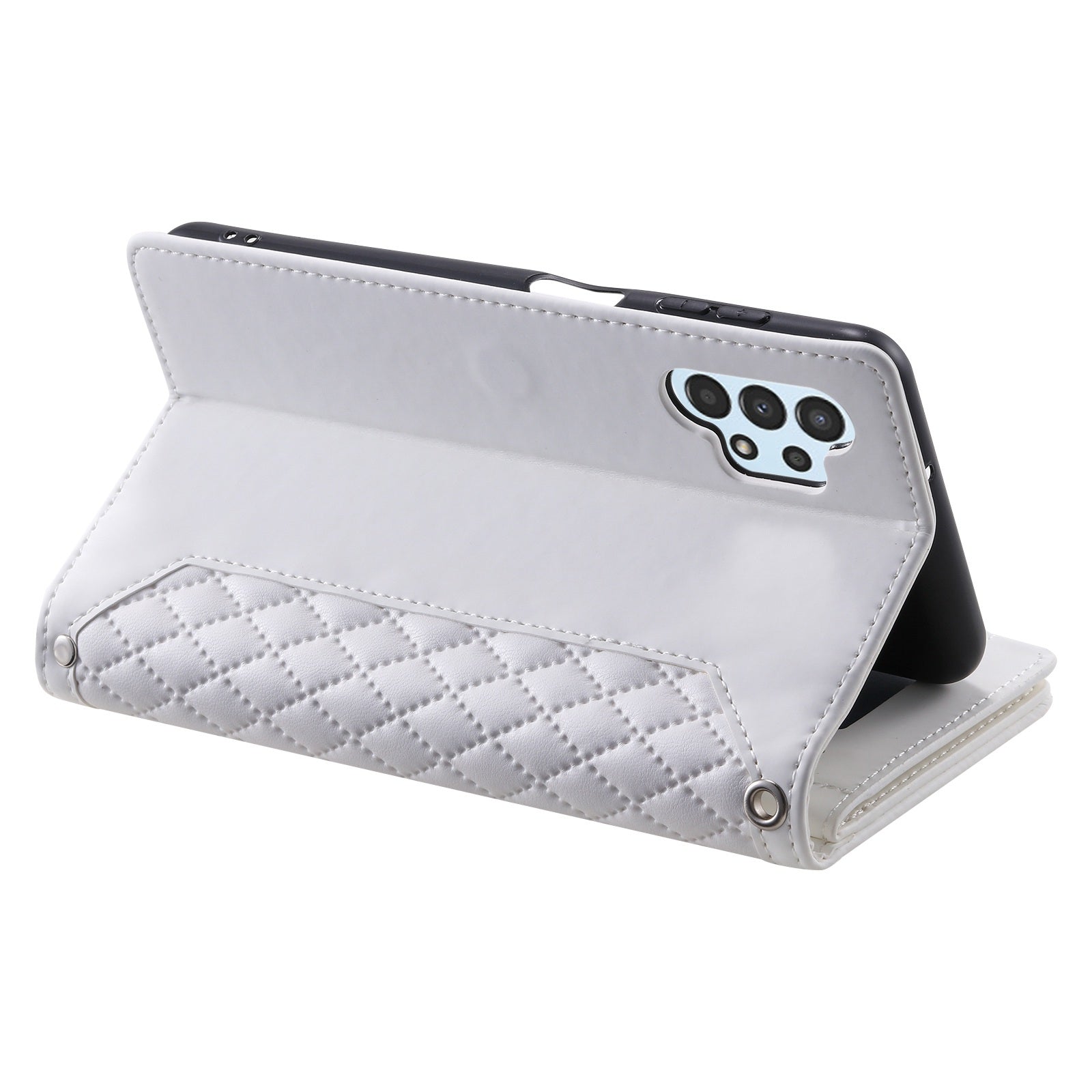 005 Style for Samsung Galaxy A32 4G (EU Version) Rhombus Texture PU Leather Phone Shockproof Cover Zipper Pocket Stand Wallet Case with Wrist Strap