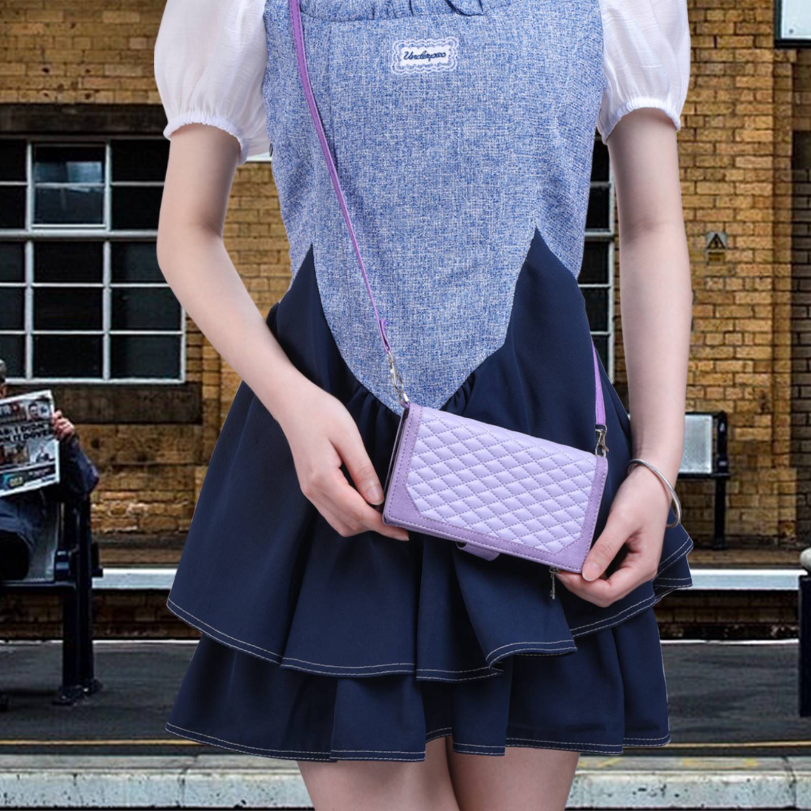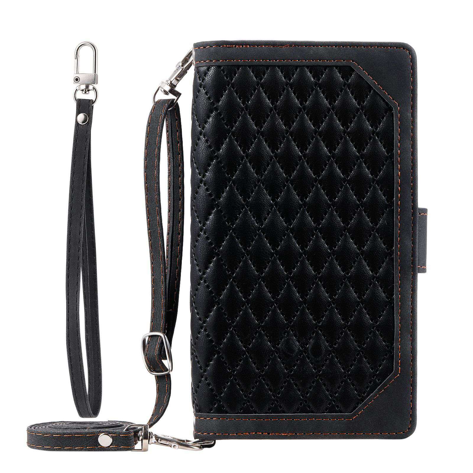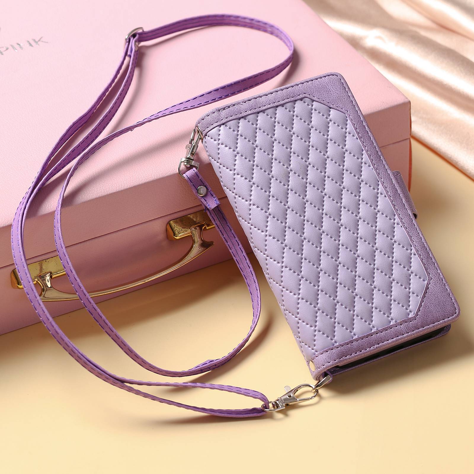 005 Style For Samsung Galaxy S21 FE 5G, Anti-scratch Zipper Pocket Phone Cover Rhombus Texture PU Leather Anti-fall Wallet Case Stand with Strap Card Holder
