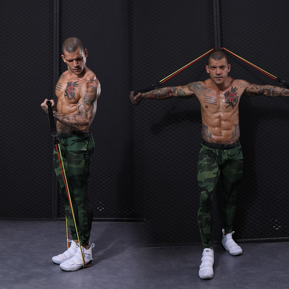 - 11pcs Fitness Bands Set consists of 5 diferent Tube Bands,2 Cushioned Handles,1 Door Anchor,2 Ankle Straps and 1 Carry Bag