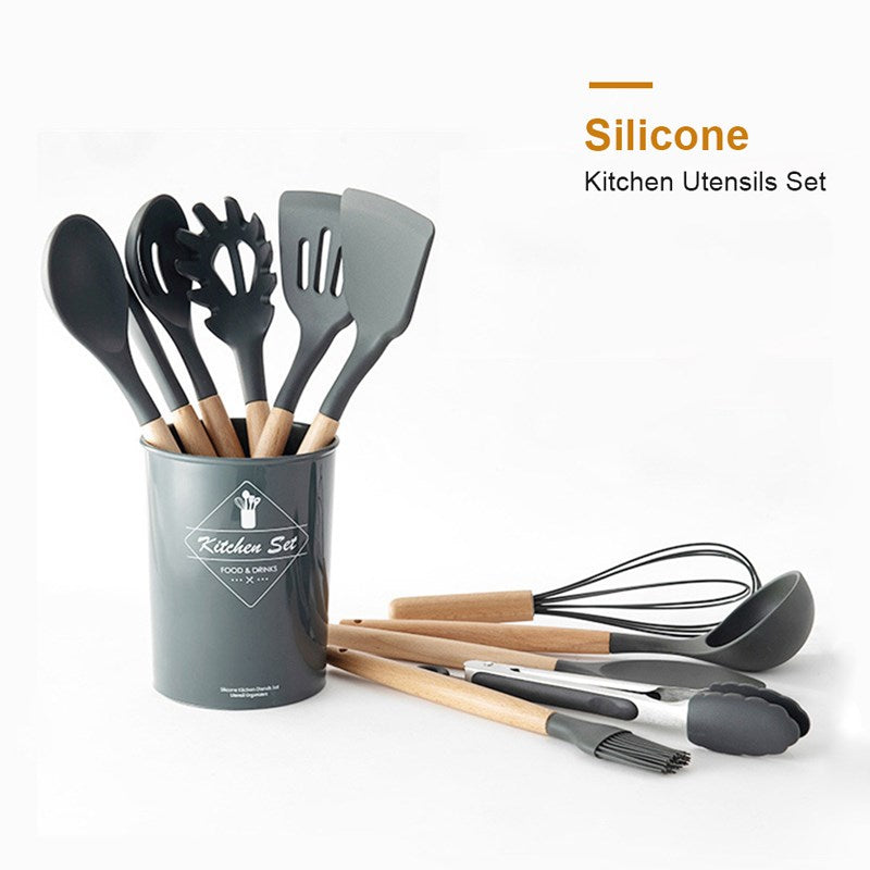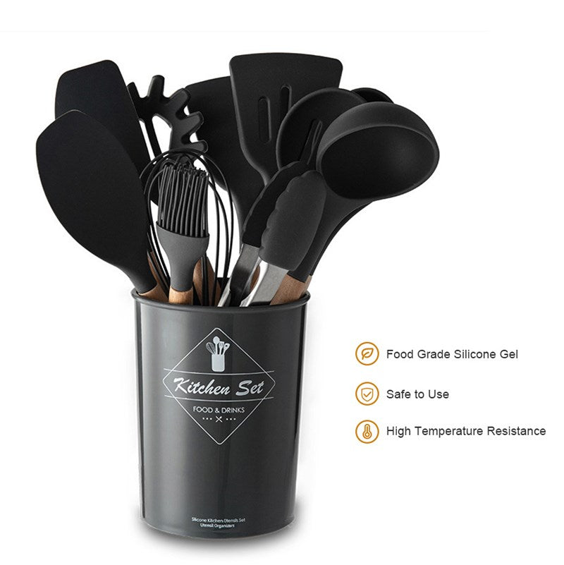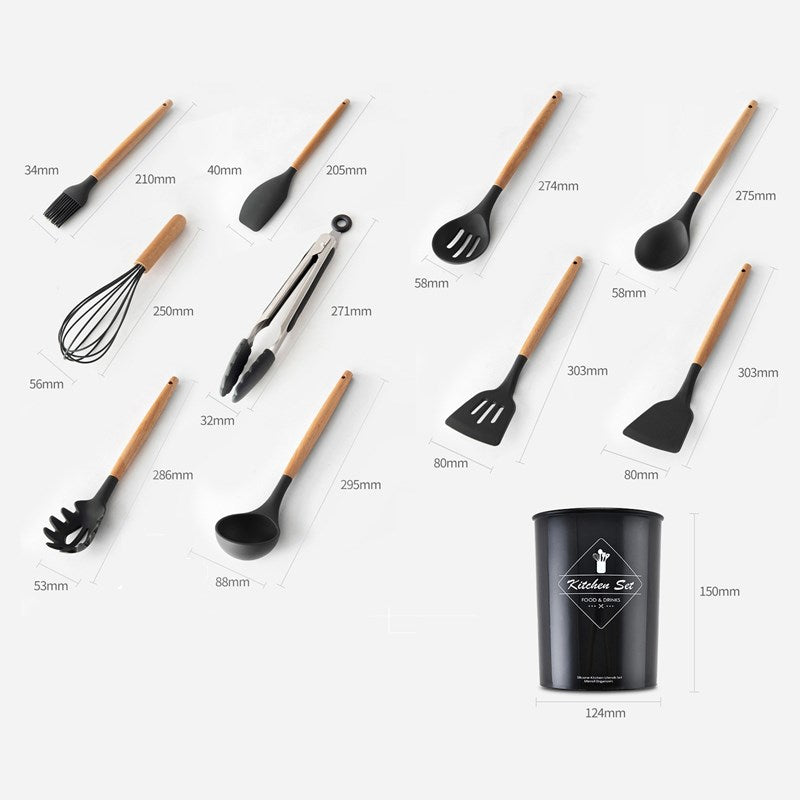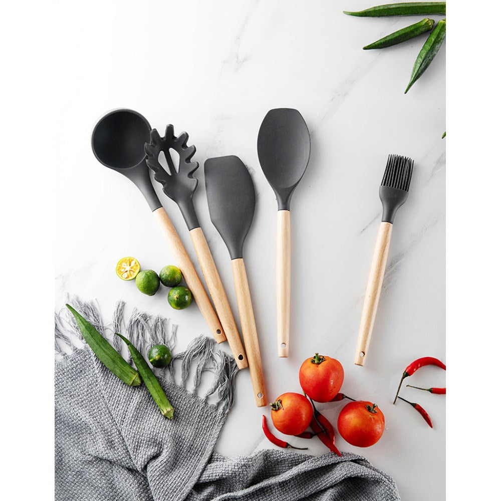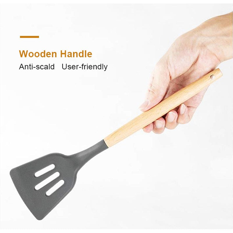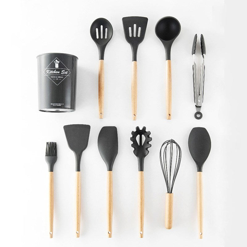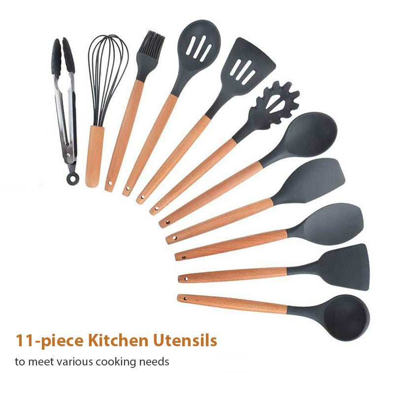 11Pcs/Set BPA Free Wooden Handle Silicone Kitchenware Cooking Tool Accessories Kitchen Utensils Set (FDA Certified Material)