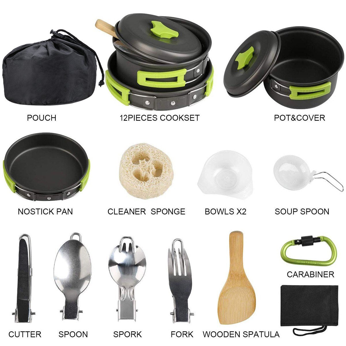 - 15Pcs Cookware: Our Cookware Kit Came with 12Pcs/Set, includes Anodized Aluminum Nonstick Pot + Pot Cover + Nonstick Pan + 2 BPA Free Bowls + BPA Free Soup Spoon + Folding Stainless Steel Spork + Wooden Spoon Spatula + Drawstring Bag + 2 Serving Spoon + 1 Fork + 1 Cutter + 1 Carabiner + 1 Carrying Bag