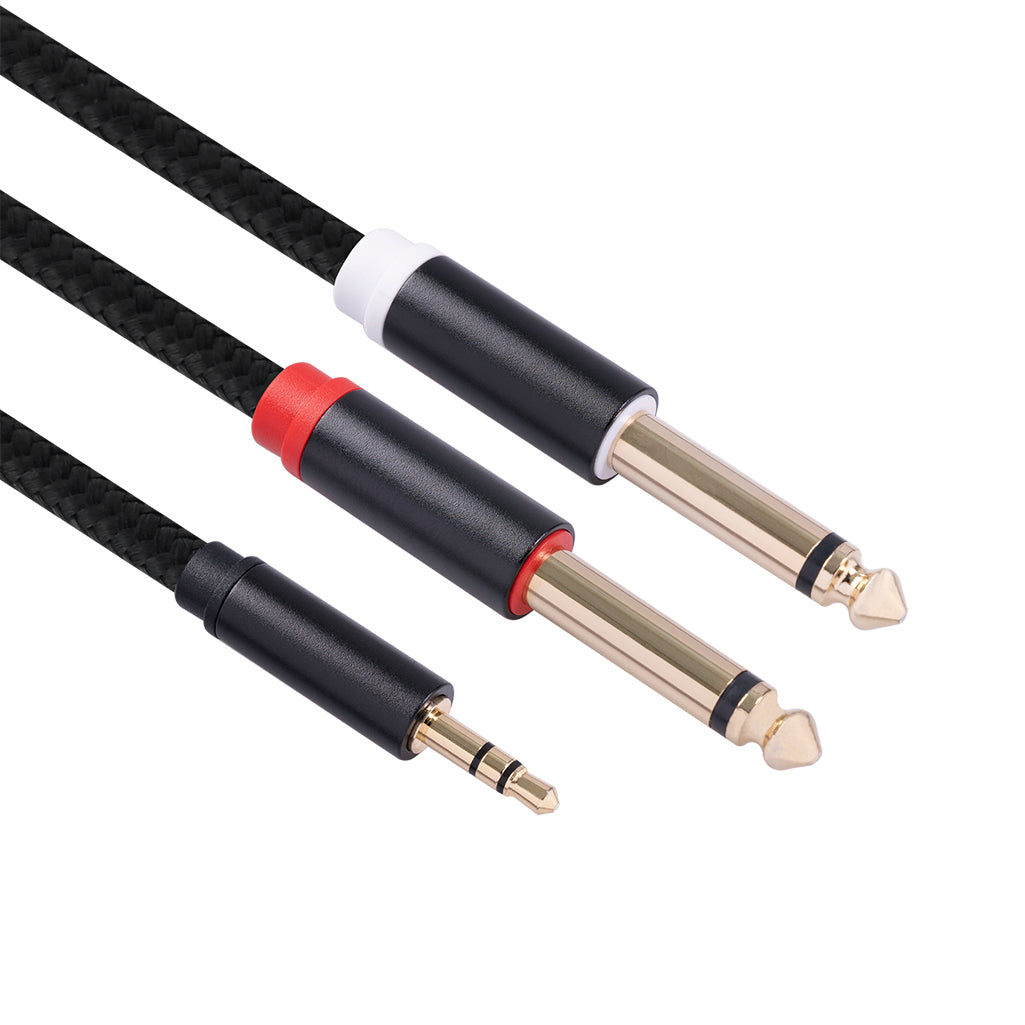 3.5 stereo to dual 6.35 mono cable, this cable is used to connect your smartphone, portable media player, laptop/PC or other device with 3.5mm interface jack output to 2 x 6.35mm jack Input devices, such as speakers, mixing consoles, etc. This cable can be used to split a 3.5mm unbalanced stereo signal into two 6.35 TS (left/right) unbalanced mono signals, or combine two 6.3 mono signals (left/right) into a single 3.5mm stereo signal. Its bifurcation is closer to the 6.35 end, and the bifurcation point is about 35cm away from the 6.35 interface.
