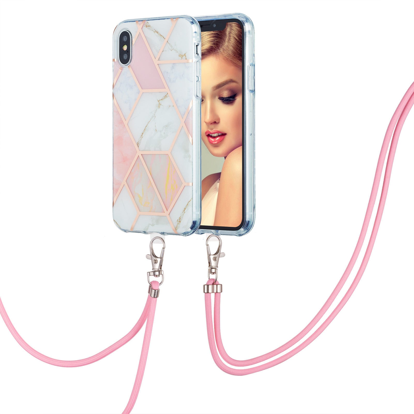 2.0mm IMD TPU Phone Cover + Lanyard Splicing Marble Pattern Electroplating Ultra Slim Case for iPhone X/XS 5.8 inch