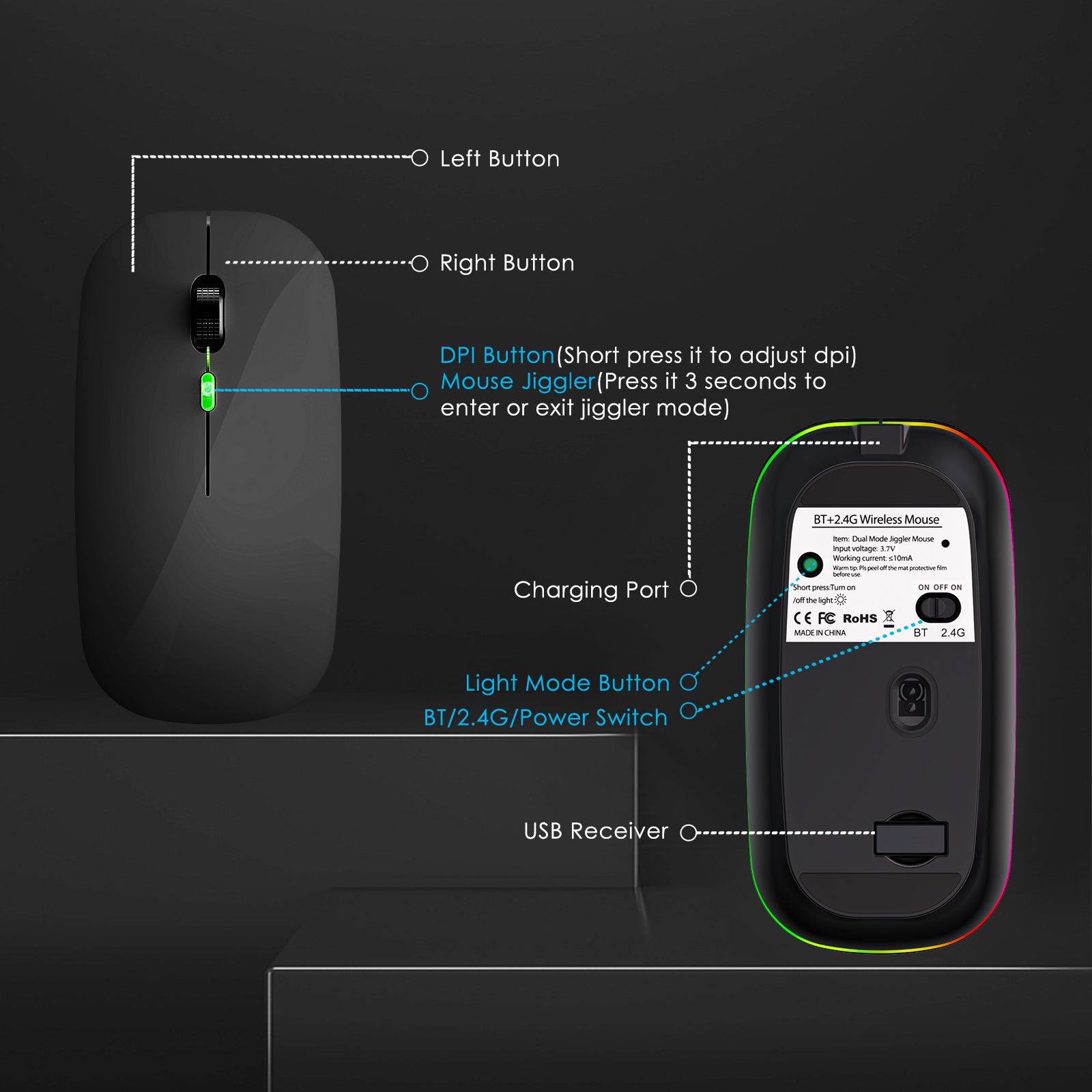 - Wireless Mouse with Jiggler: This is not only an external wireless mouse but also a mouse jiggler that helps to keep your computer alive. Press the DPI key for about 5 seconds to enter or exit the Jiggler feature
