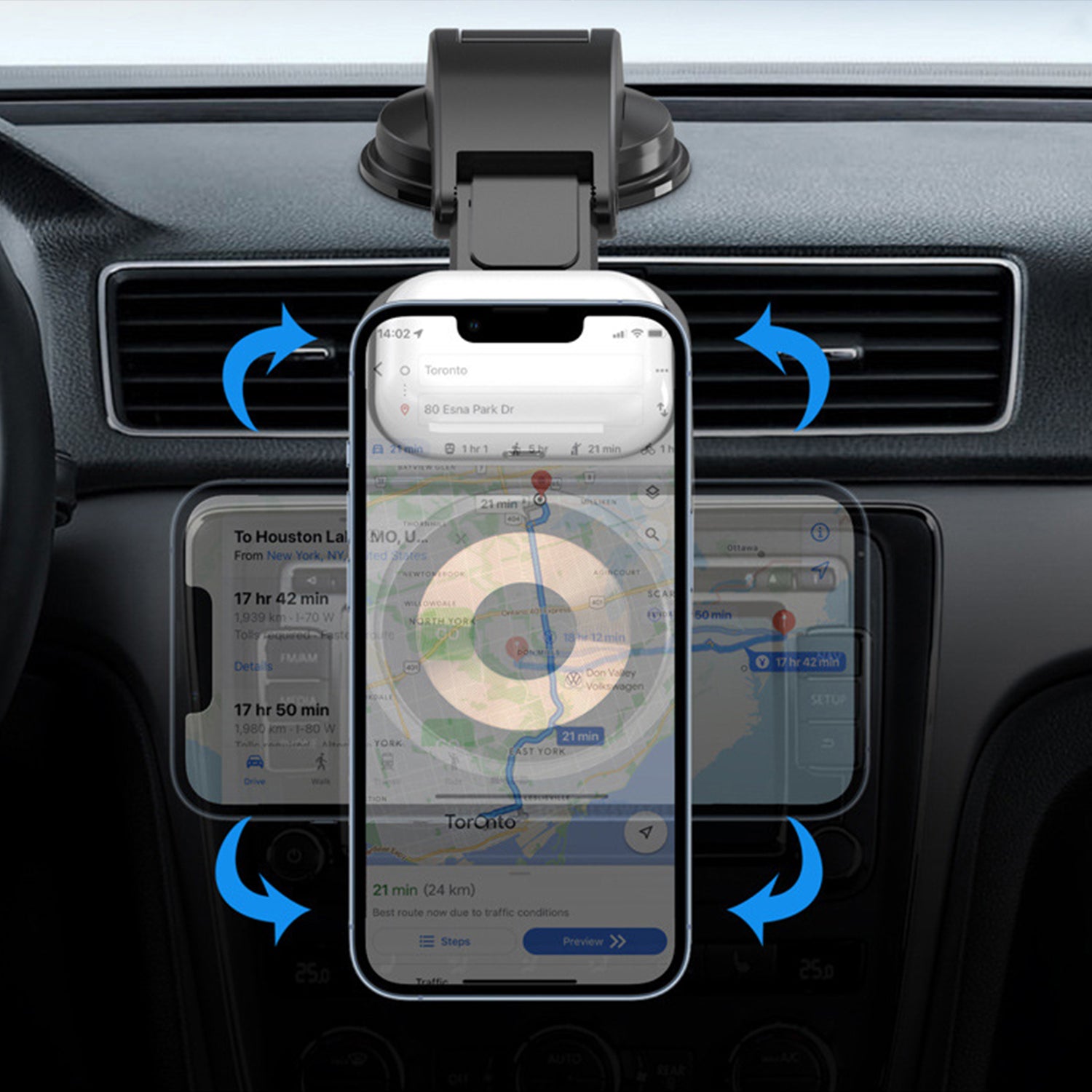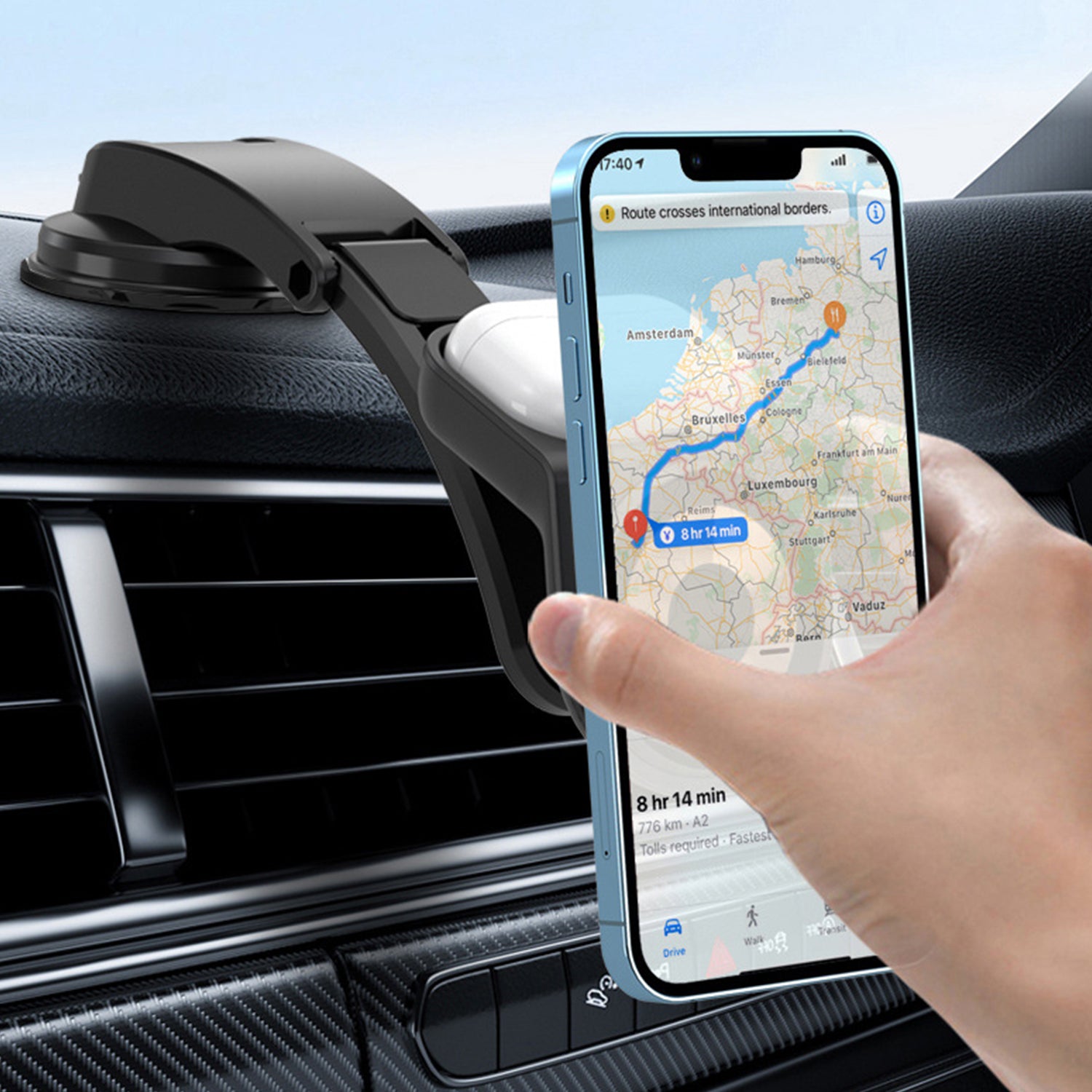 - Suction cup base, sticks to the dashboard firmly