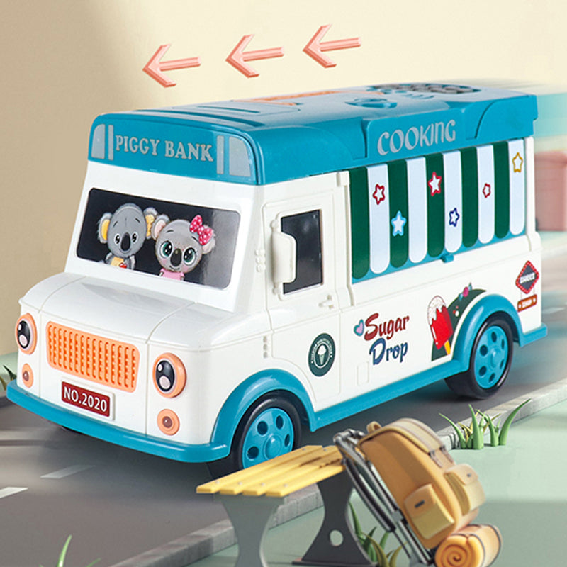 - The design of the Piggy Bank is combined with a bus shape, which is loved by either boys or girls. it's a fun and interactive toy that will keep them entertained for hours