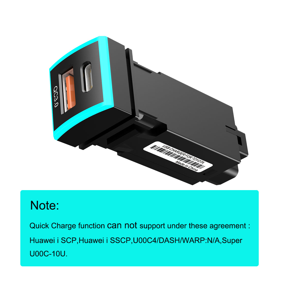- Car modified special charger socket for Toyota 2018-1019, support PD+QC3.0 fast charge standard, input voltage 12-24V, output voltage 5V 3.1A/9V 2A/12V 1.5A