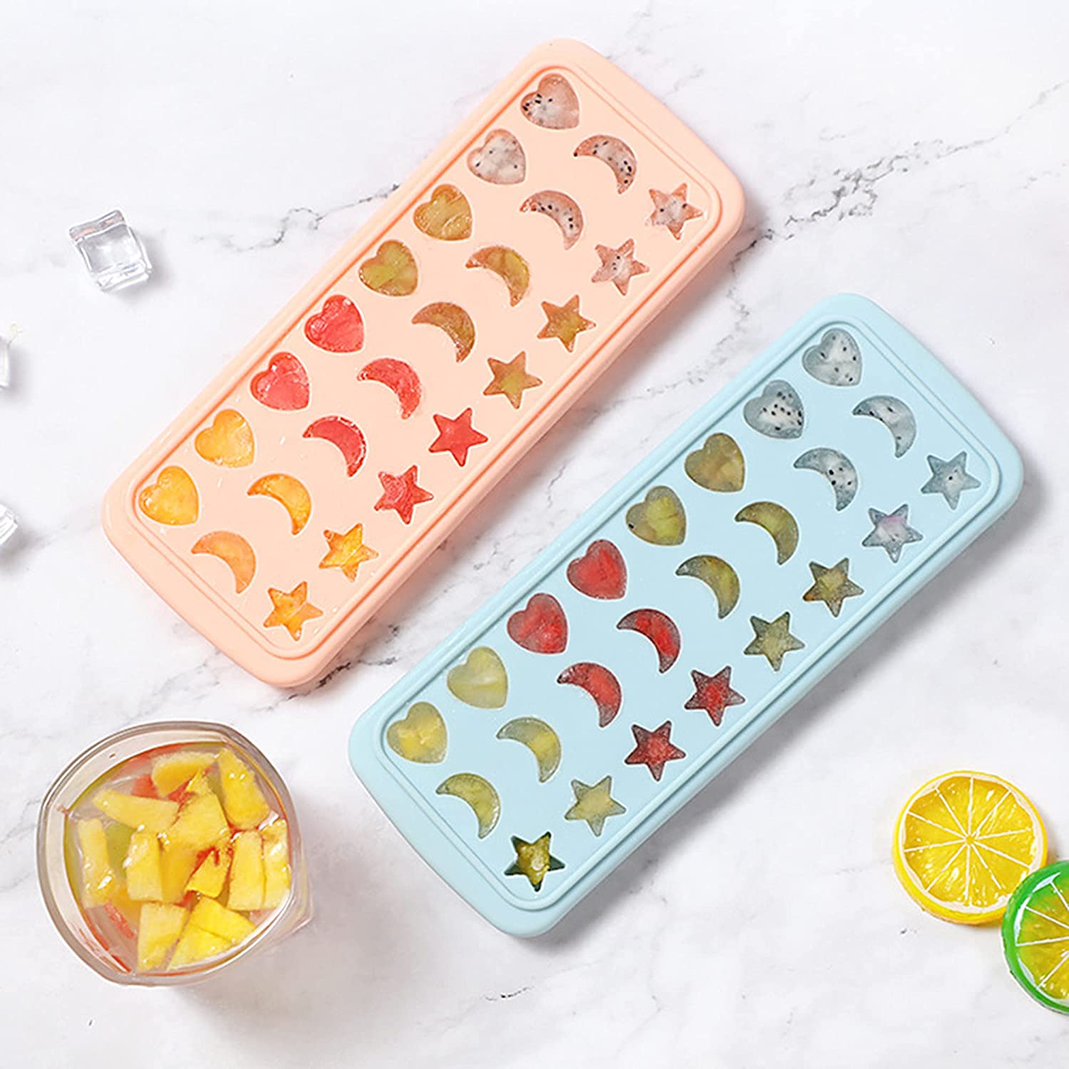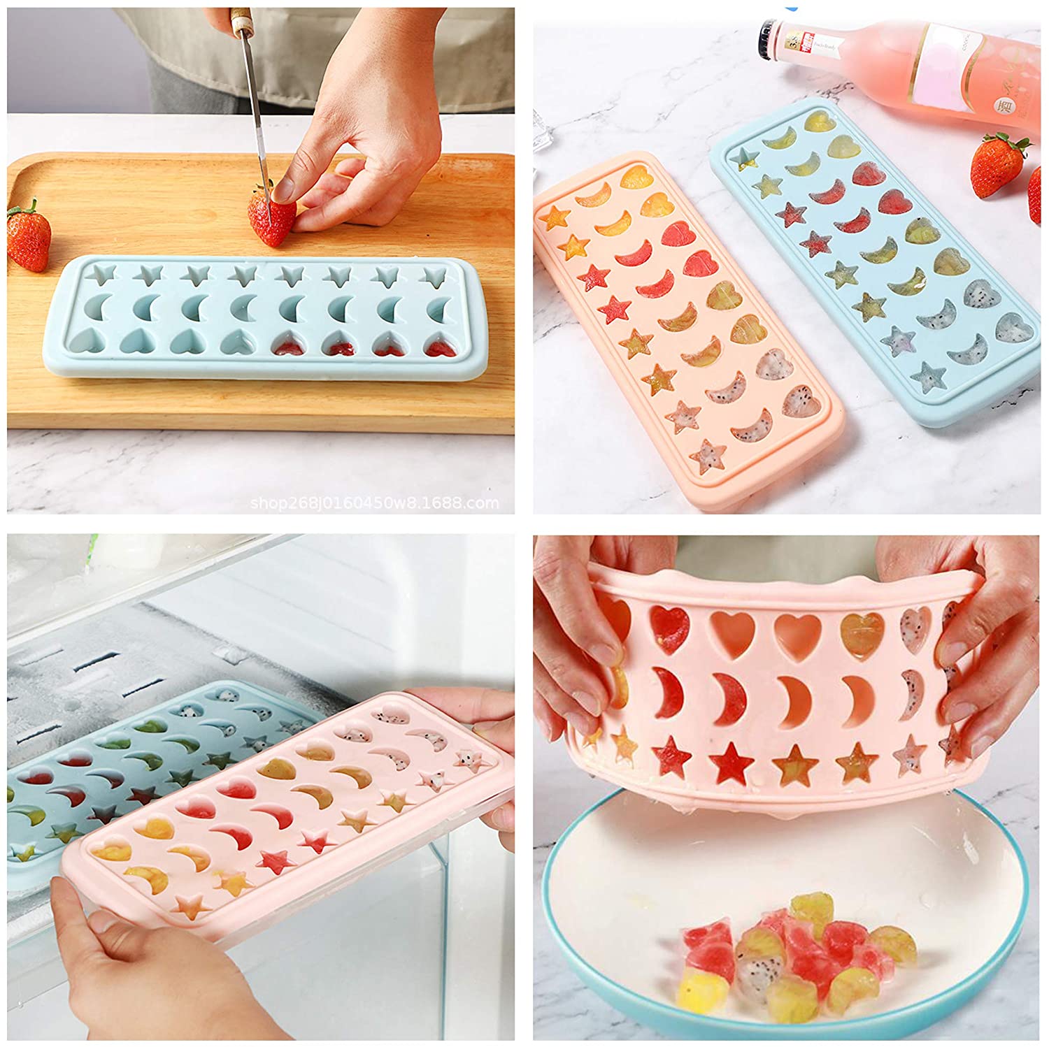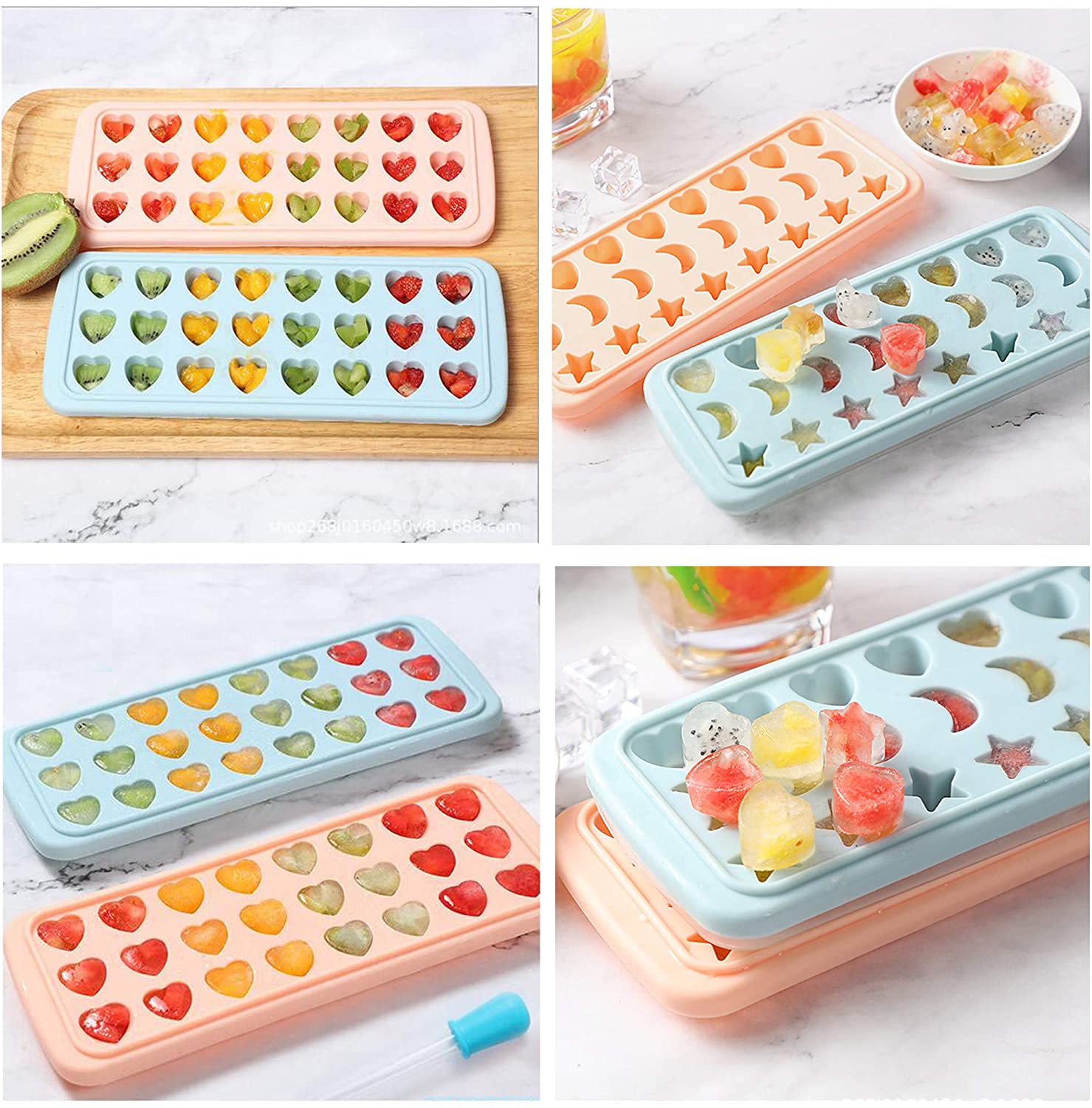 - Cute heart shape + moon shape + star shape candy molds. You can make 24 candies or nice ice blocks at a time, save time and save money