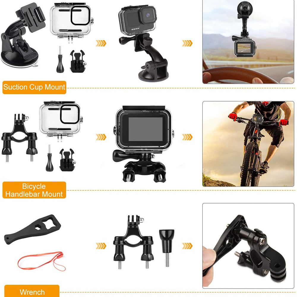 - This complete accessories set contains all the basic and useful mounts to make you expending the camera fun