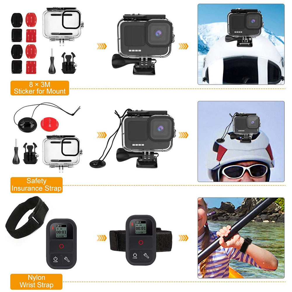 - This accessory kit additionally contains a large storage bag, tripod holder, straps, stickers, etc.