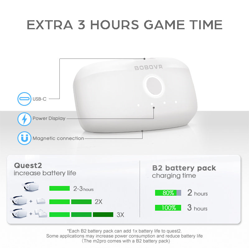 - Using the magnetic suction battery design introduced by BOBOVR, the B2 battery pack can be hot-swapped and charged, and can be charged at any time without removing from the VR glasses