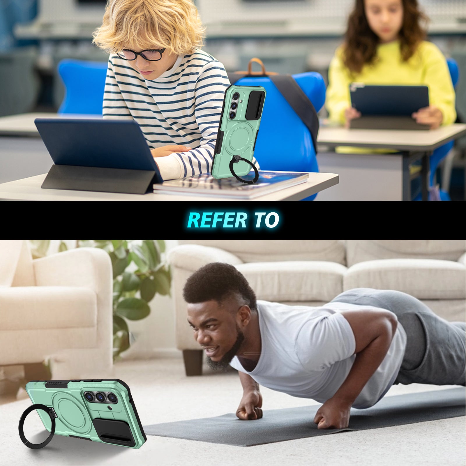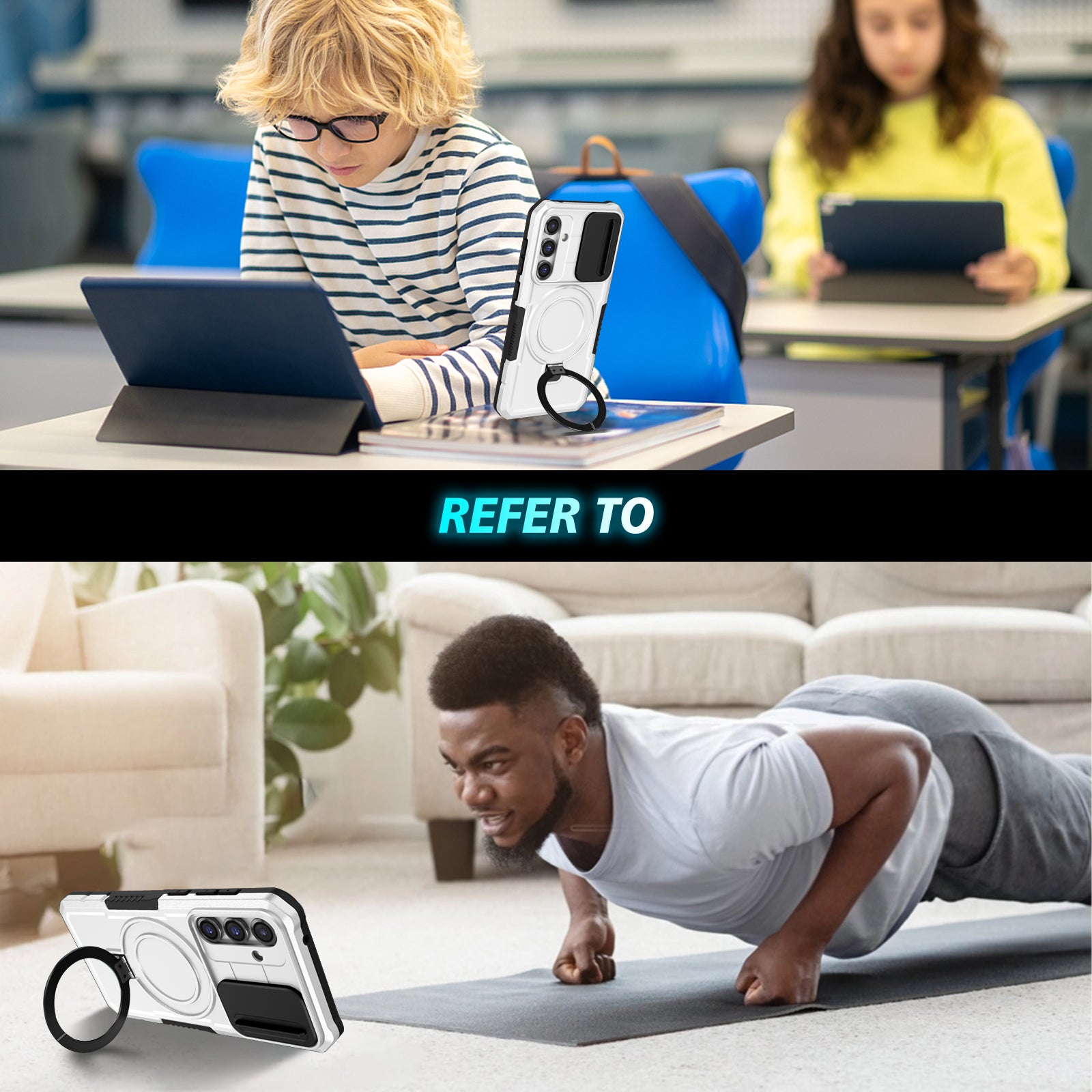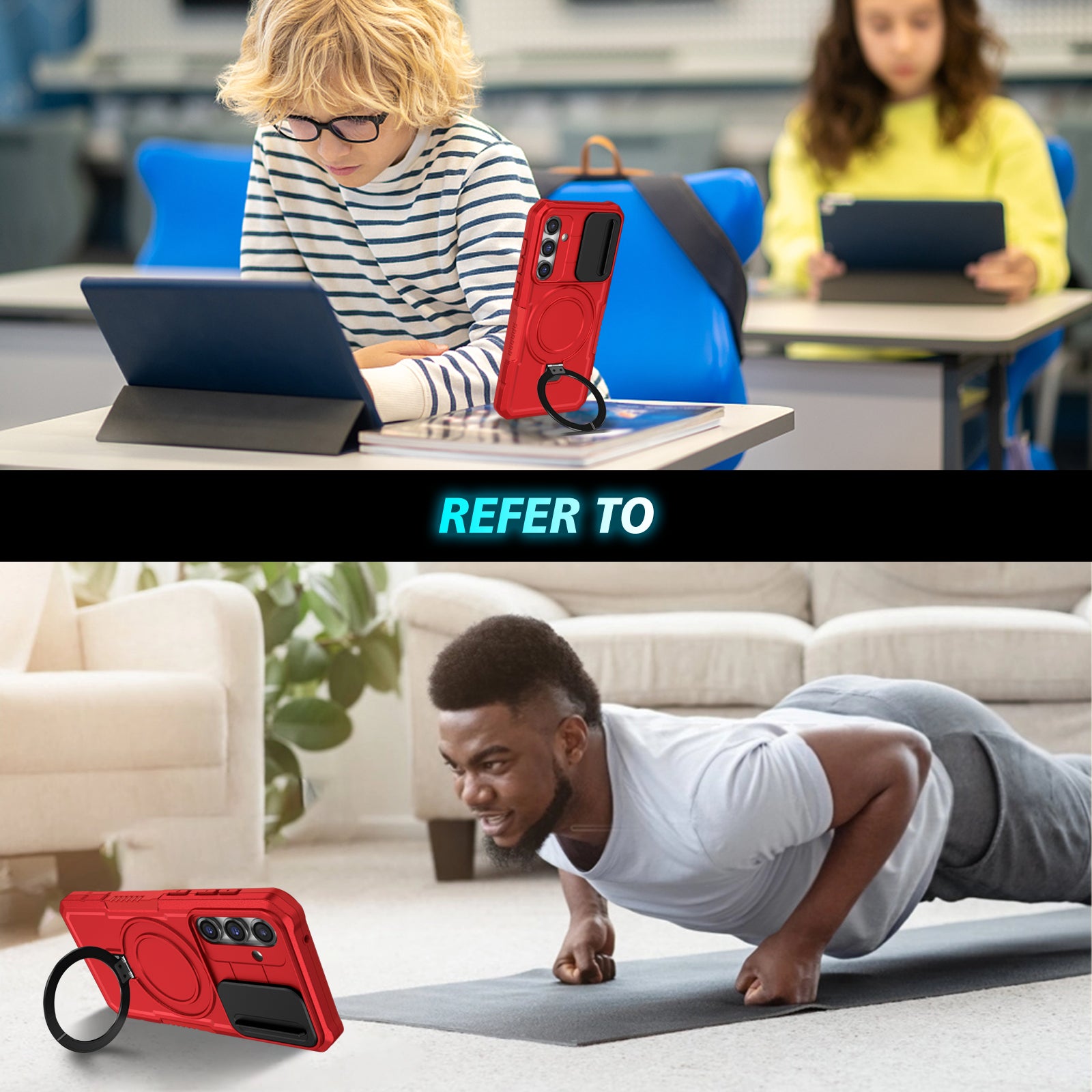 - The ring kickstand can support your phone at a comfortable viewing angle for free your hands watching TV