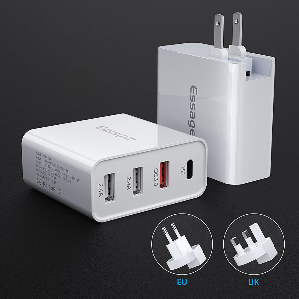 ESSAGER 4 Ports Quick Charge (PD+QC3.0+Dual U2.4A) Phone Charger US Plug + EU and UK Adapters