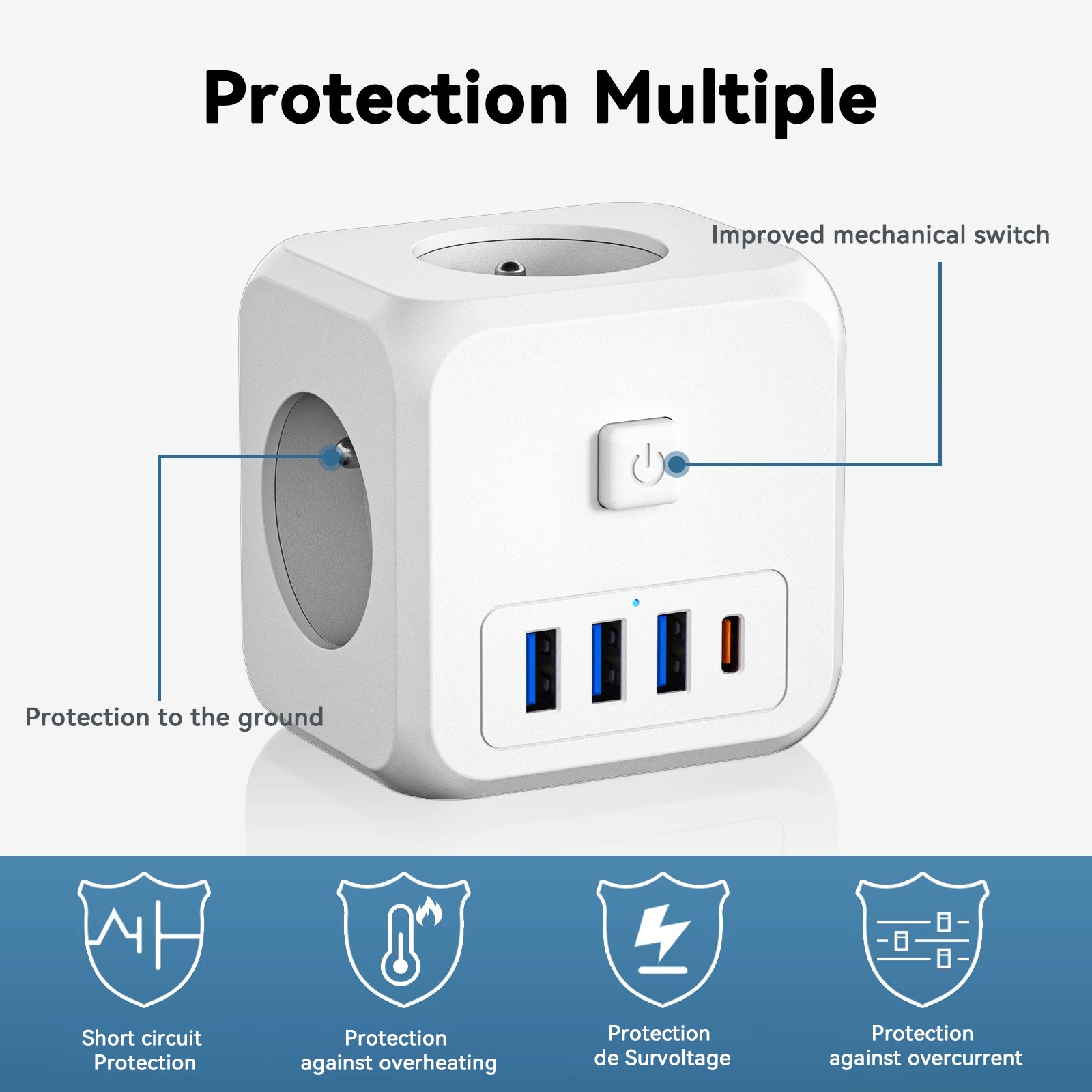 - Unique plug socket design allows you to connect 3 large sockets, 3 USB ports and 1 Type-C port at the same time without hindering the use of neighboring sockets