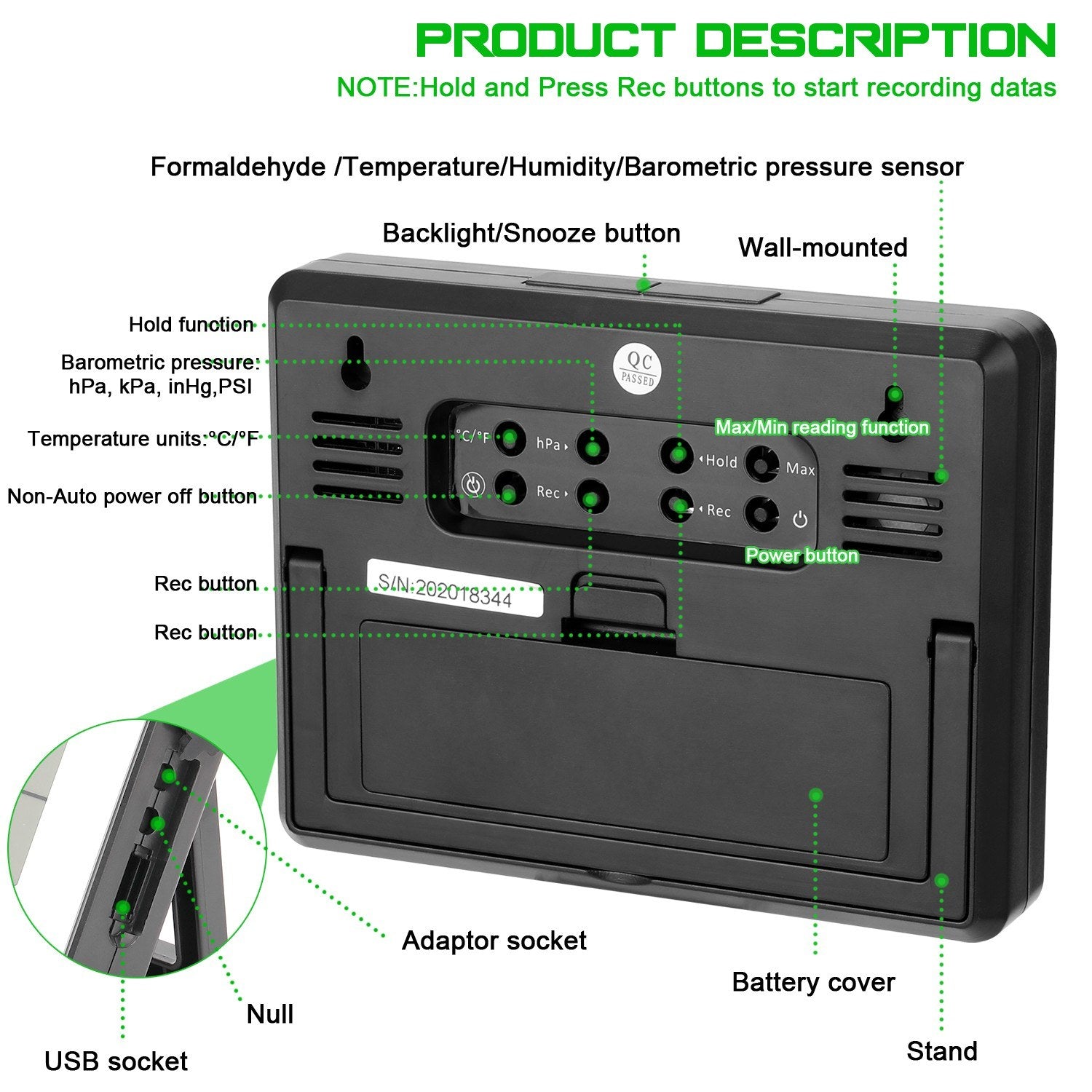 - The perpetual calendar, min reading, USB connecting symbol, date recording symbol, time display, hold mode, max reading, low battery warning symbol, power off symbol(non-auto power off), date recording full caption, formaldehyde measuring reading, air temperature reading, humidity reading, barometric pressure reading will be displayed on LCD screen