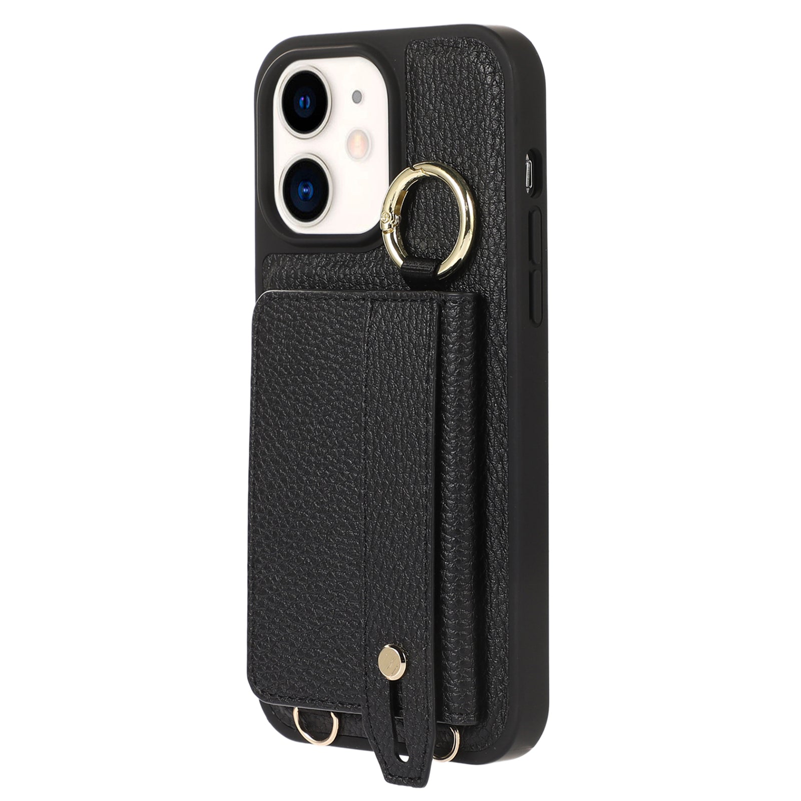 Fall-proof Cover for iPhone 11 6.1 inch Card Holder Hand Strap Leather+TPU Phone Kickstand Case with Shoulder Strap