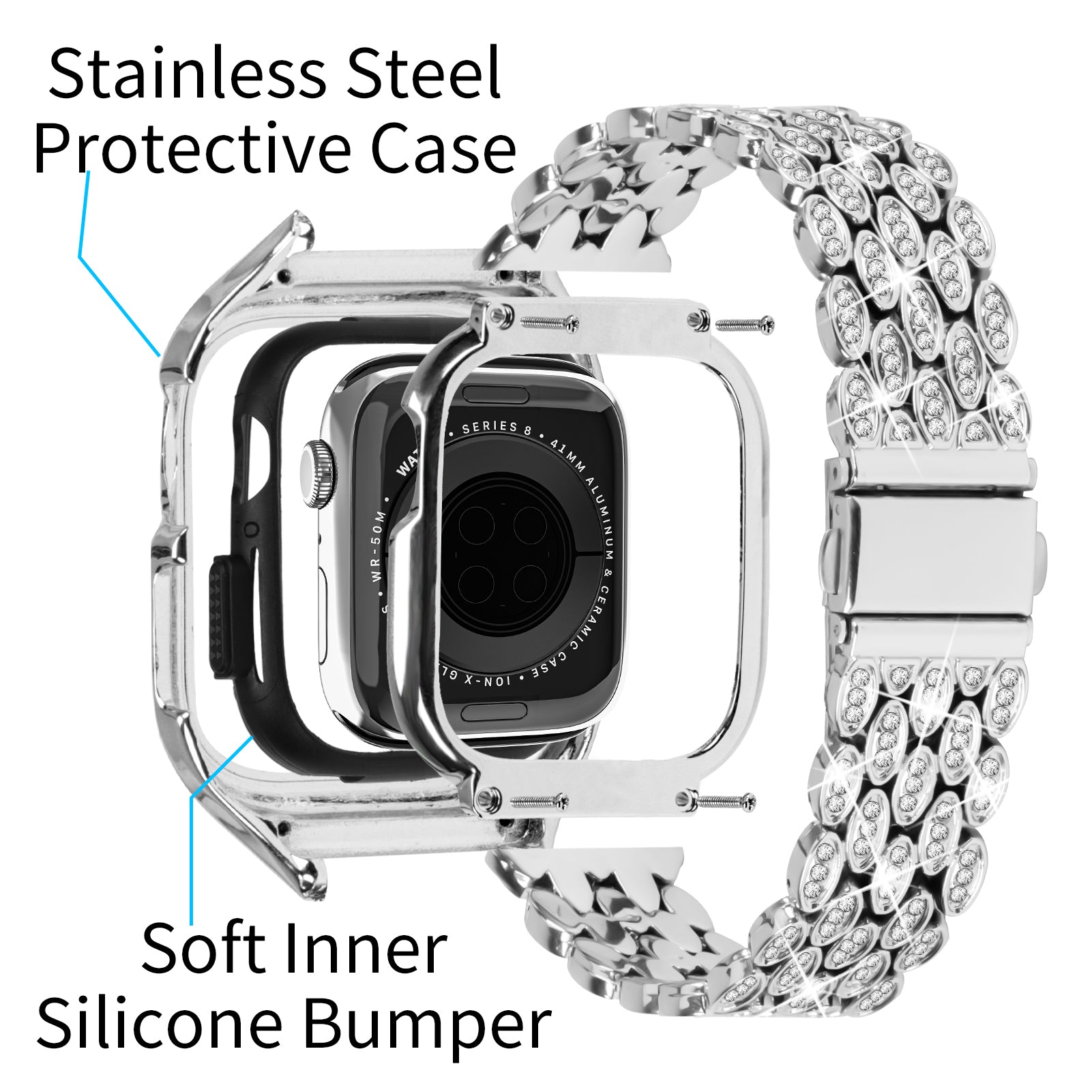 For Apple Watch Series 8 7 41mm Stainless Steel Watch Band Rhinestone Decor Strap with Protective Case