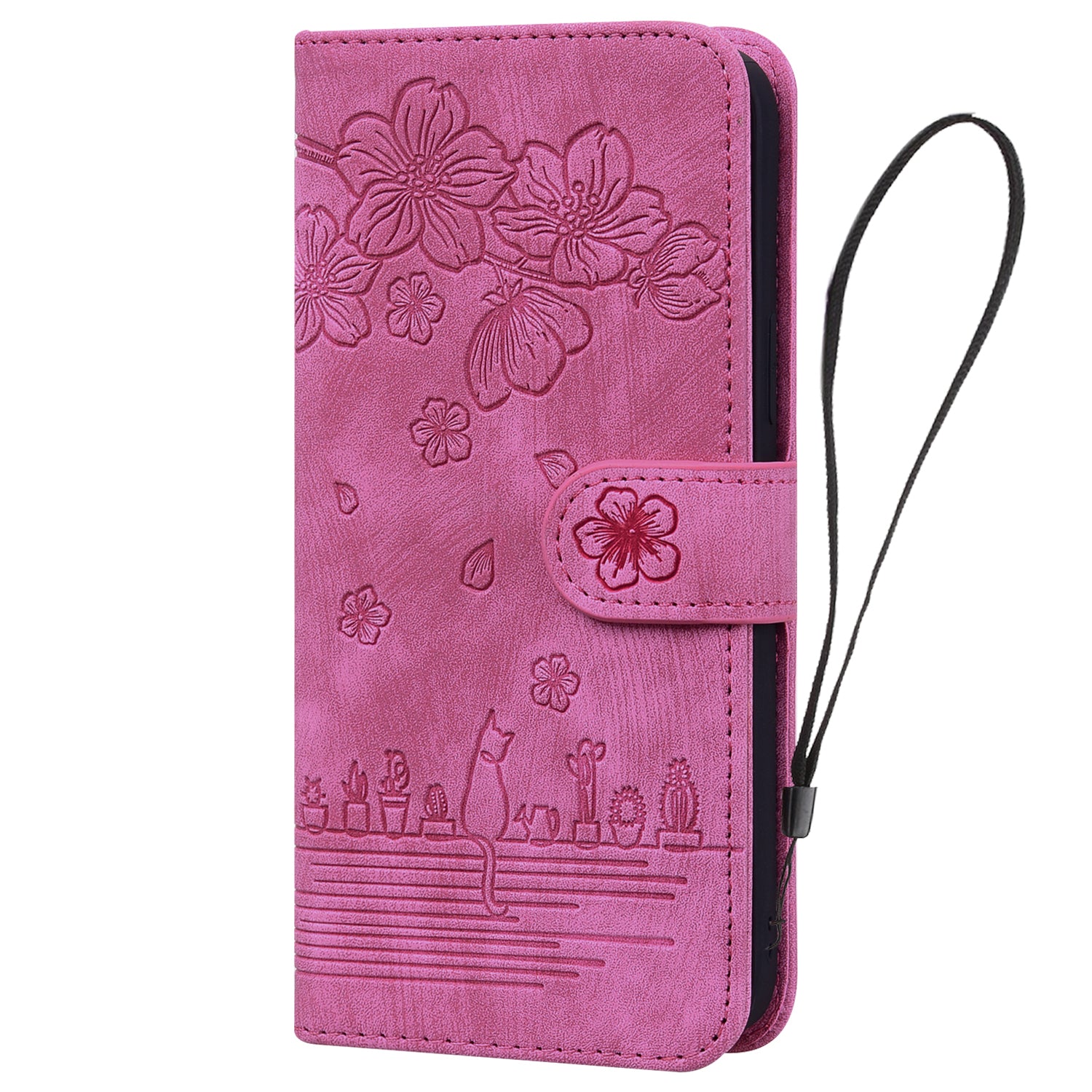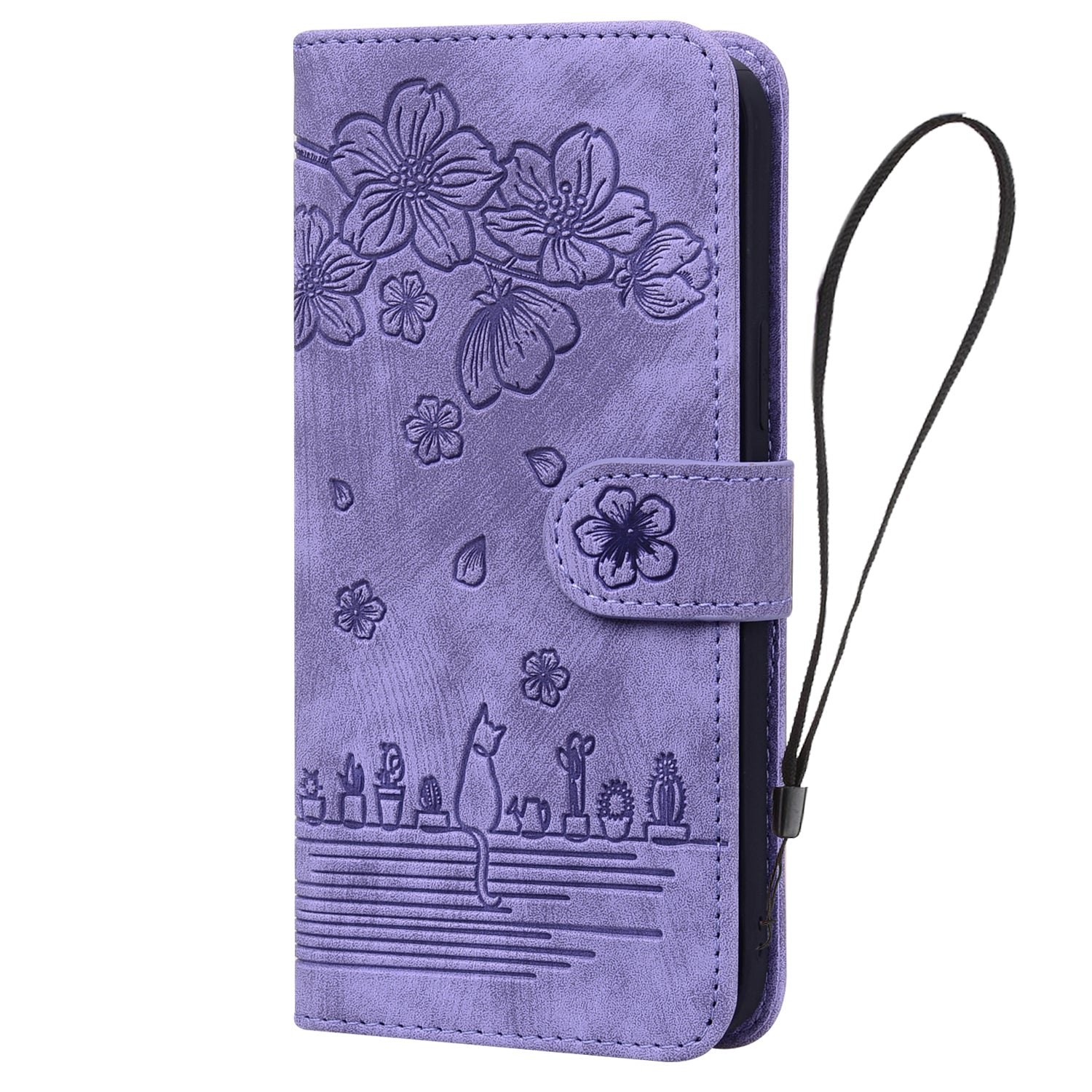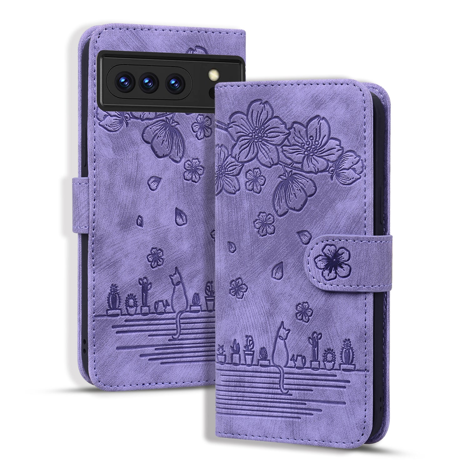 For Google Pixel 8 Pro PU Leather Wallet Stand Case Imprinted Flower Cat Phone Cover with Strap