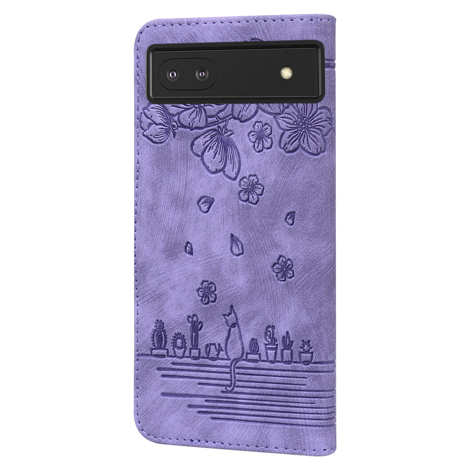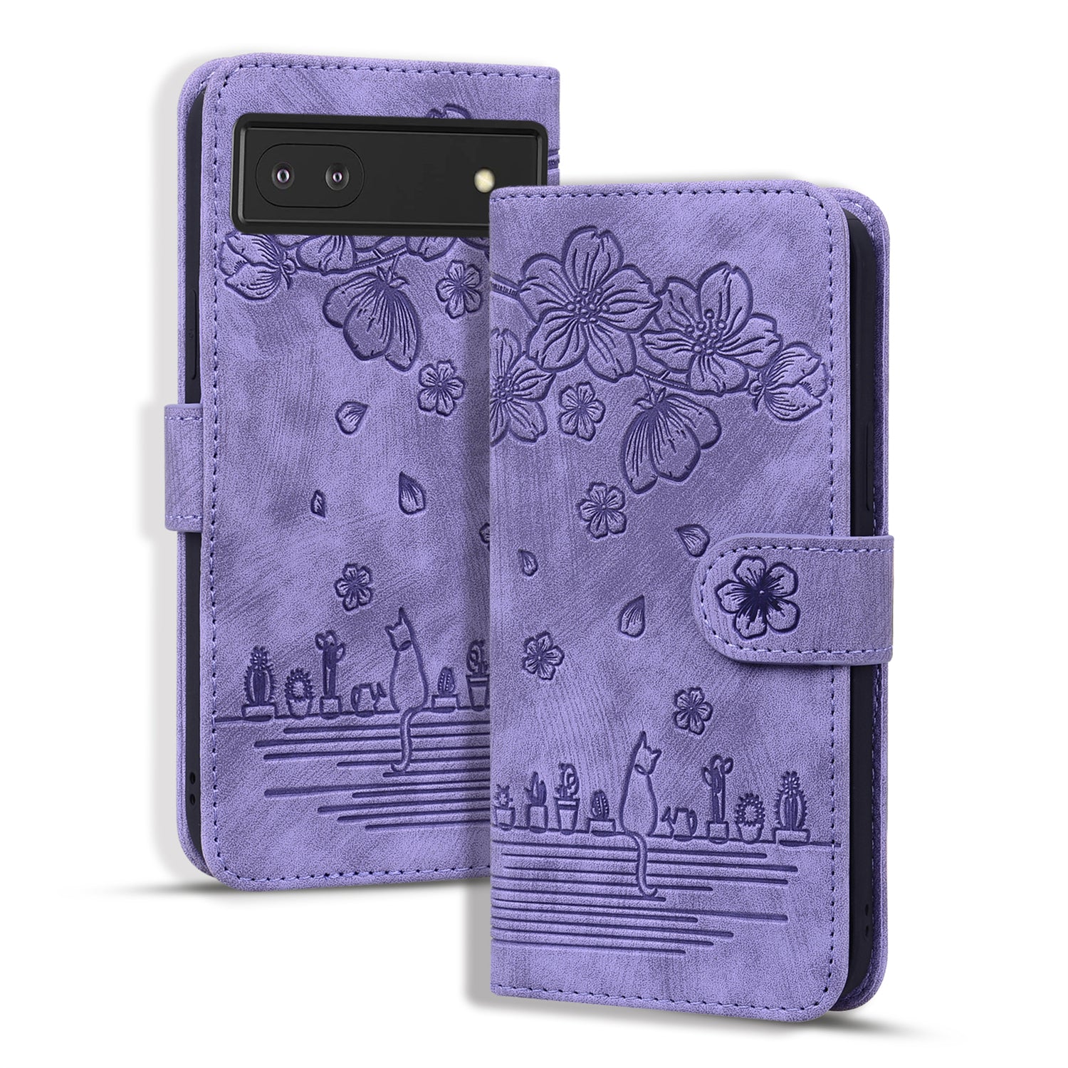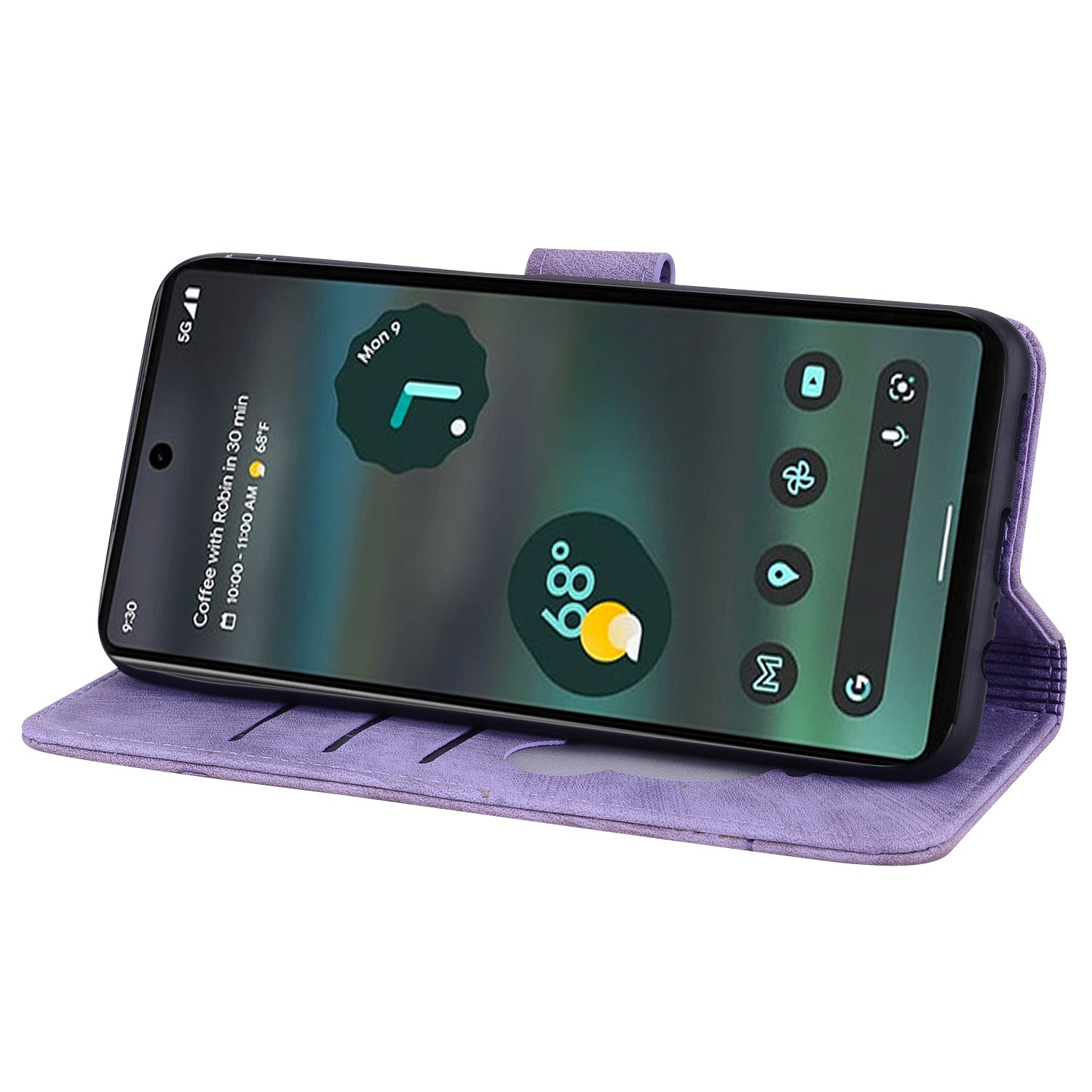 For Google Pixel 8 PU Leather Wallet Case Imprinted Flower Cat Stand Phone Cover with Strap