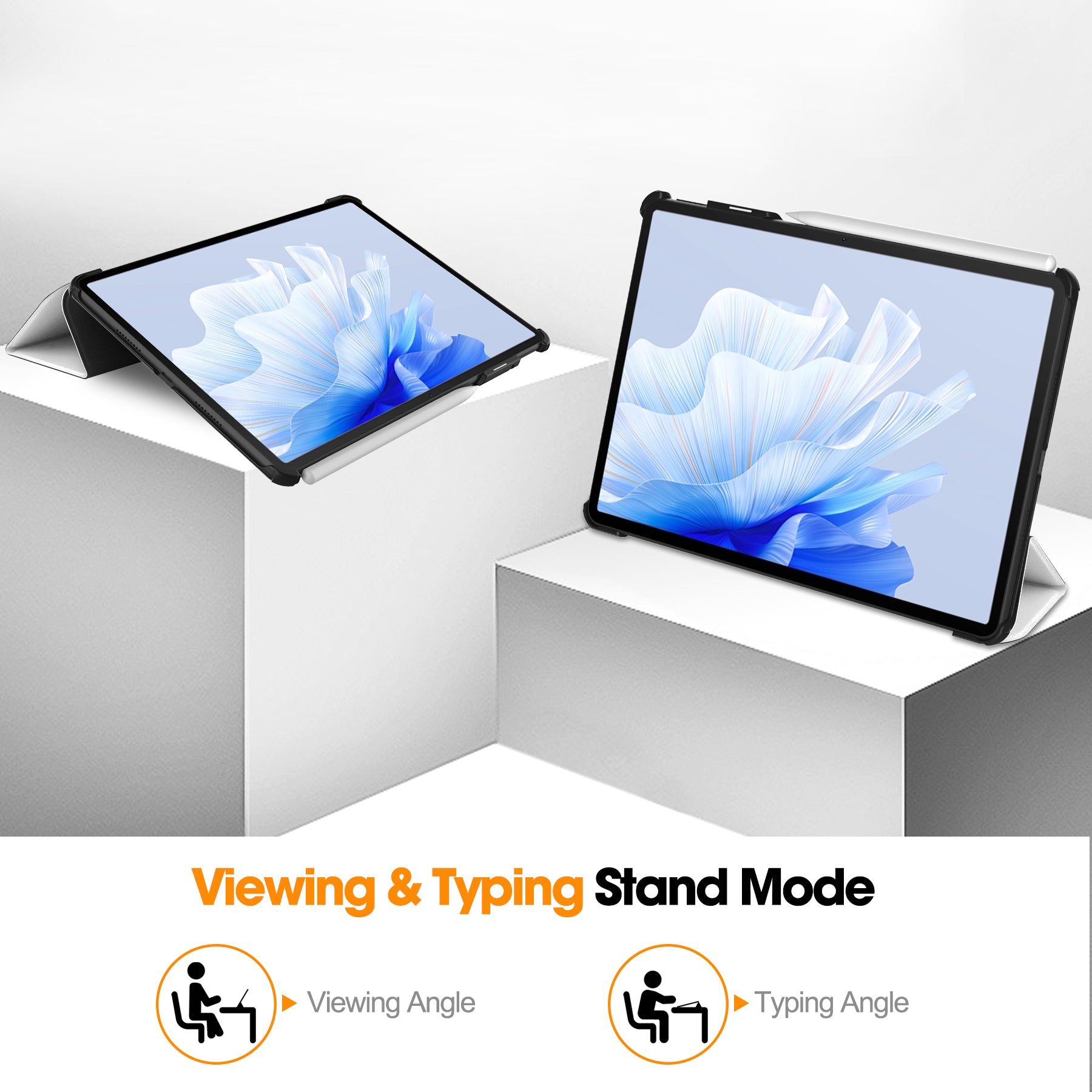 This tablet case adopts high-quality PU leather + PC with fine details, making it feel soft and delicate to the touch. The tri-fold cover with dual angles support offers a sturdy and versatile stand for viewing and typing.