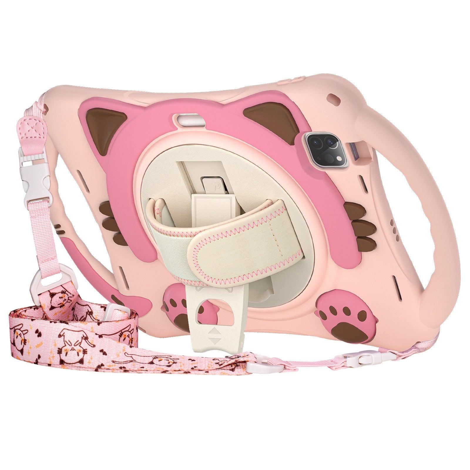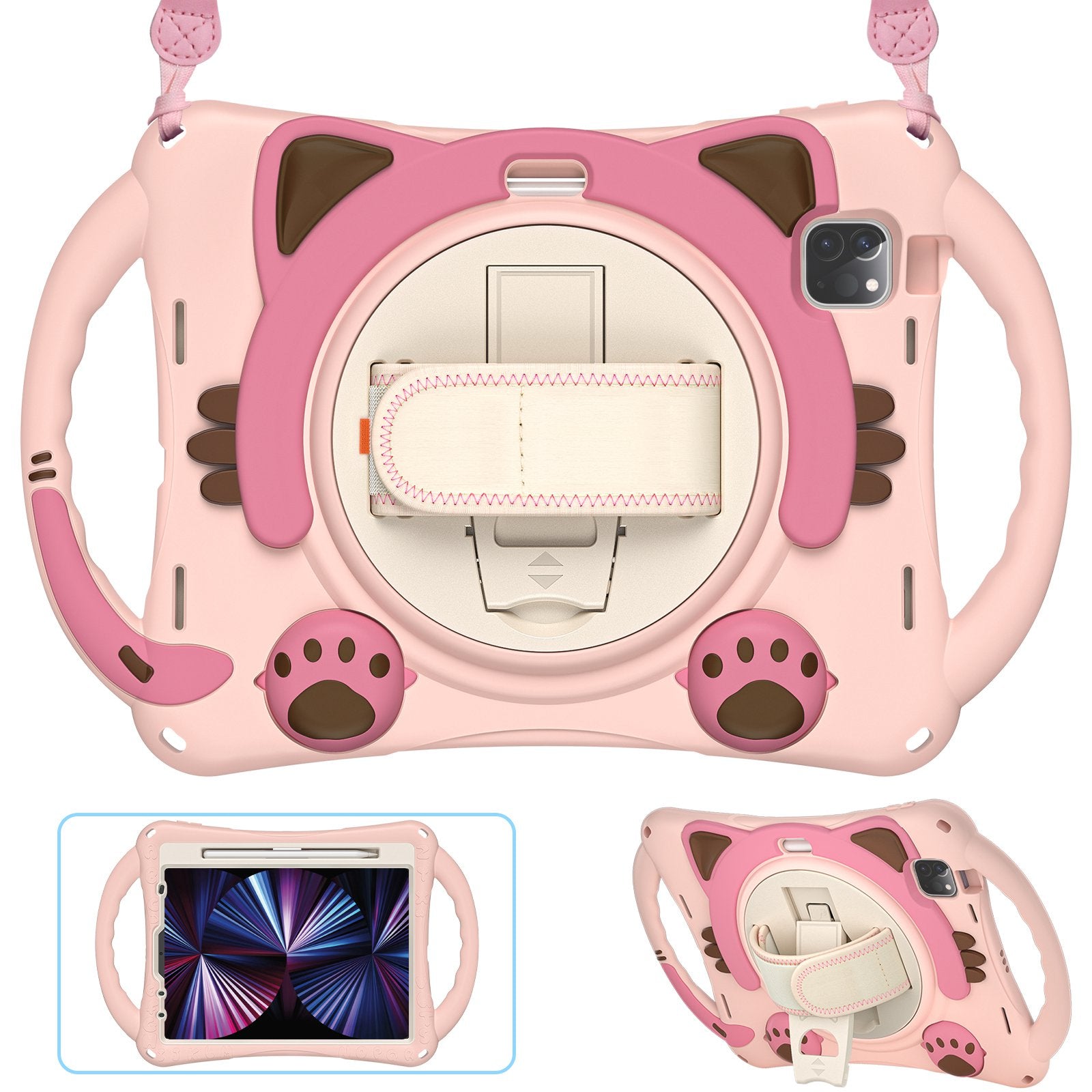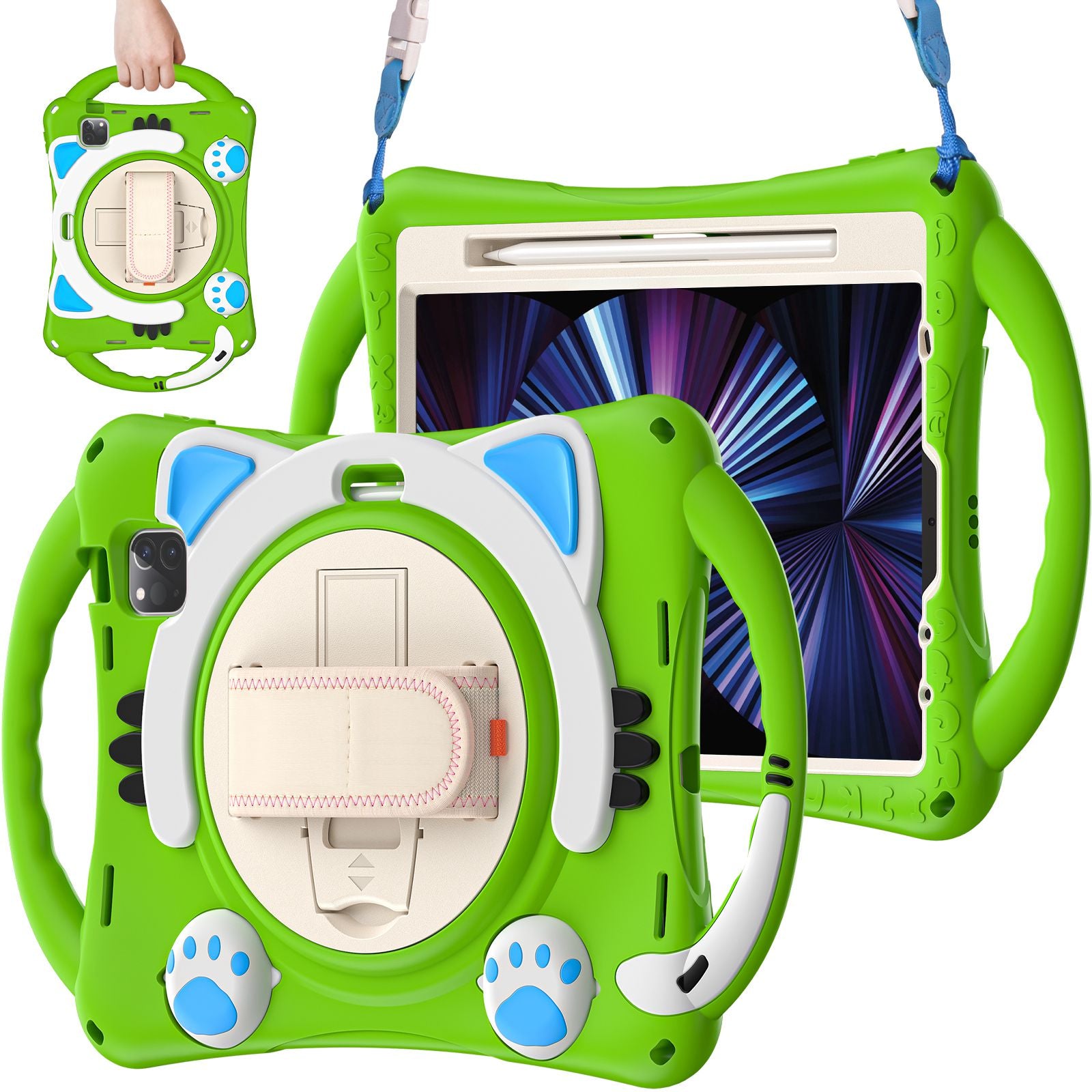 For iPad Air (2022)/(2020)/iPad Pro 11-inch (2021)/(2020)/(2018) Hand Strap Holder Protective Case PC + Silicone Kickstand Cover with Shoulder Strap and Pencil Holder
