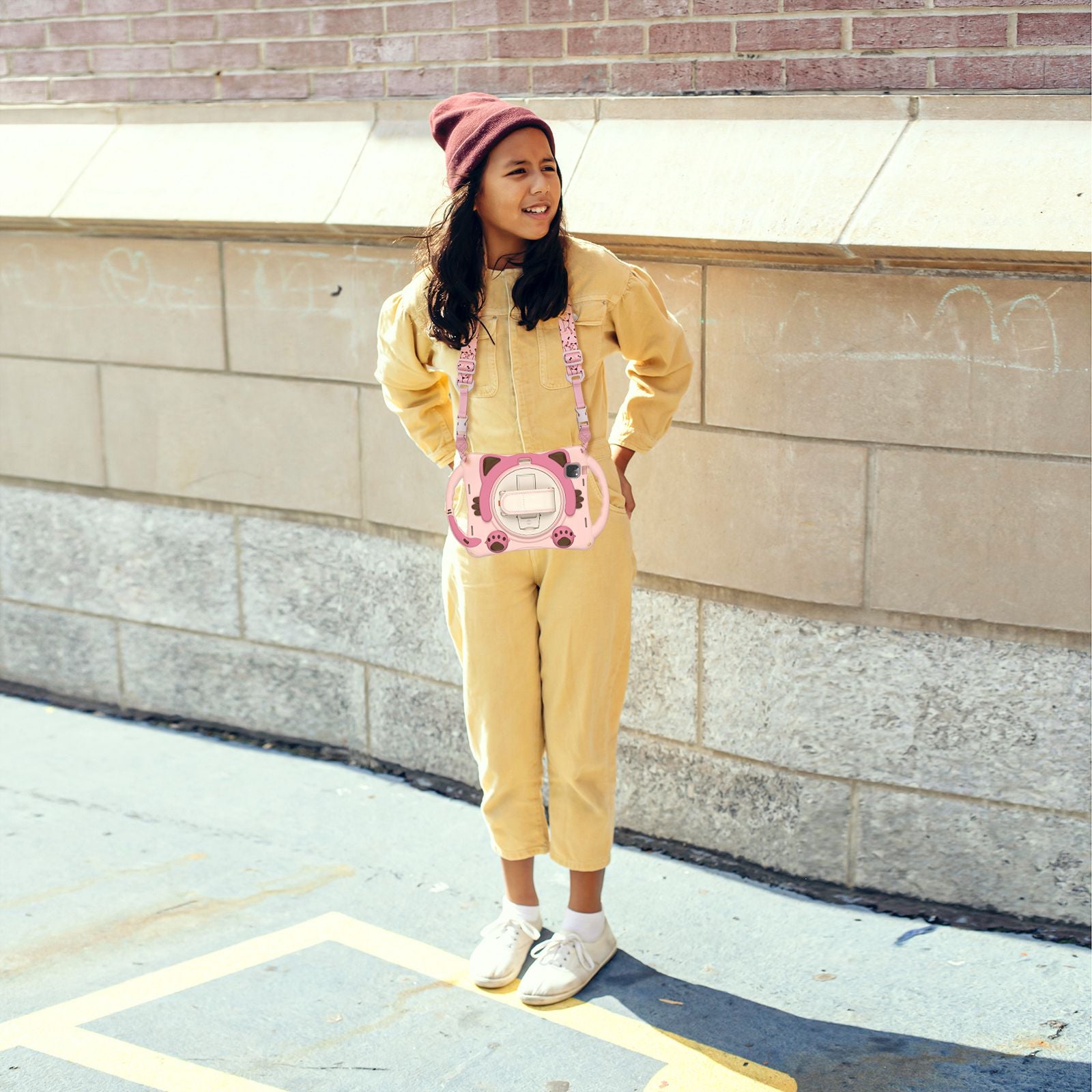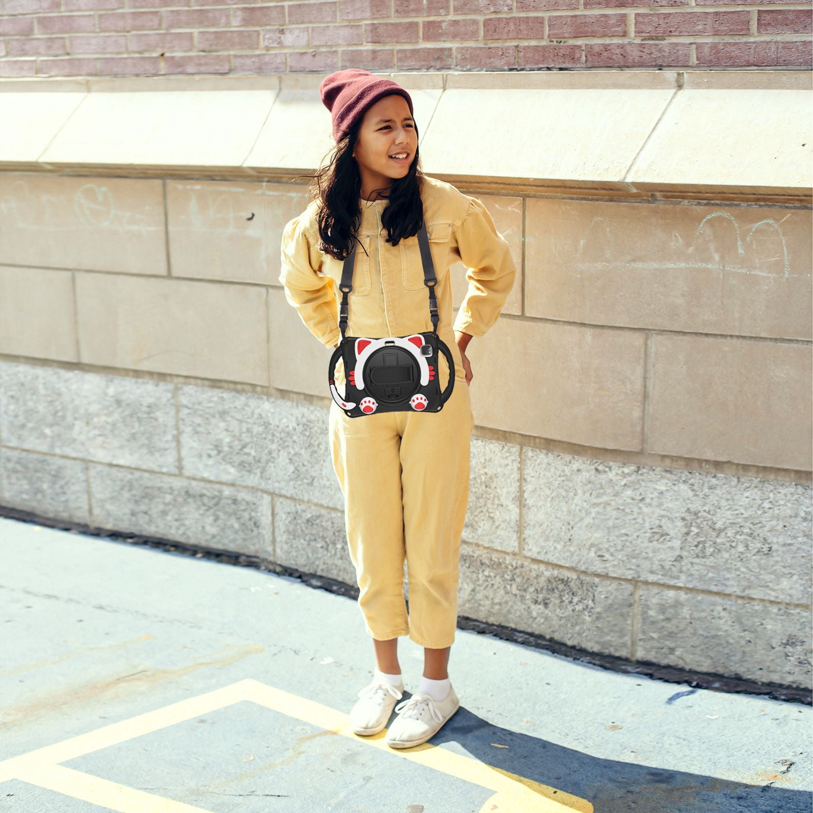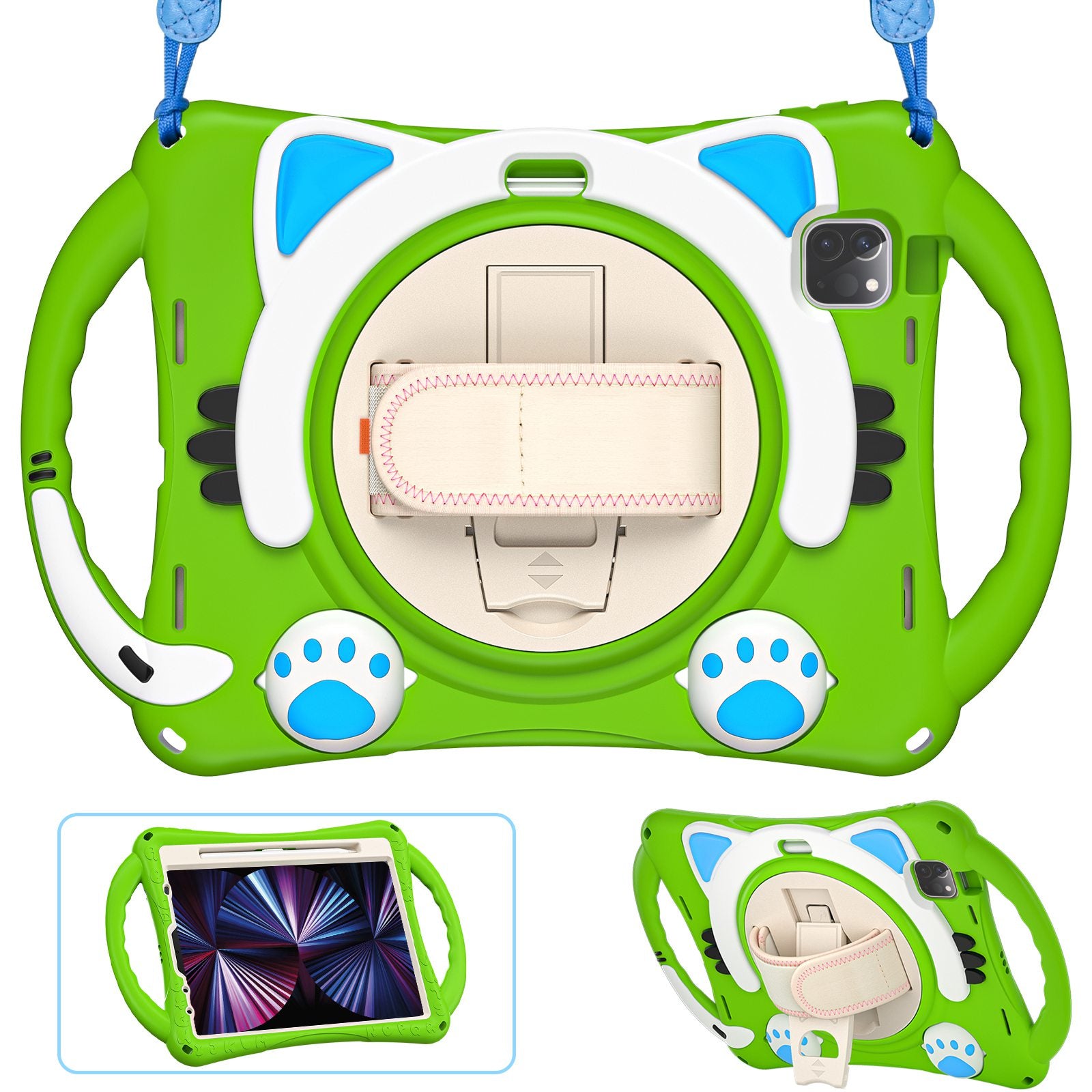 For iPad Air (2022)/(2020)/iPad Pro 11-inch (2021)/(2020)/(2018) Hand Strap Holder Protective Case PC + Silicone Kickstand Cover with Shoulder Strap and Pencil Holder