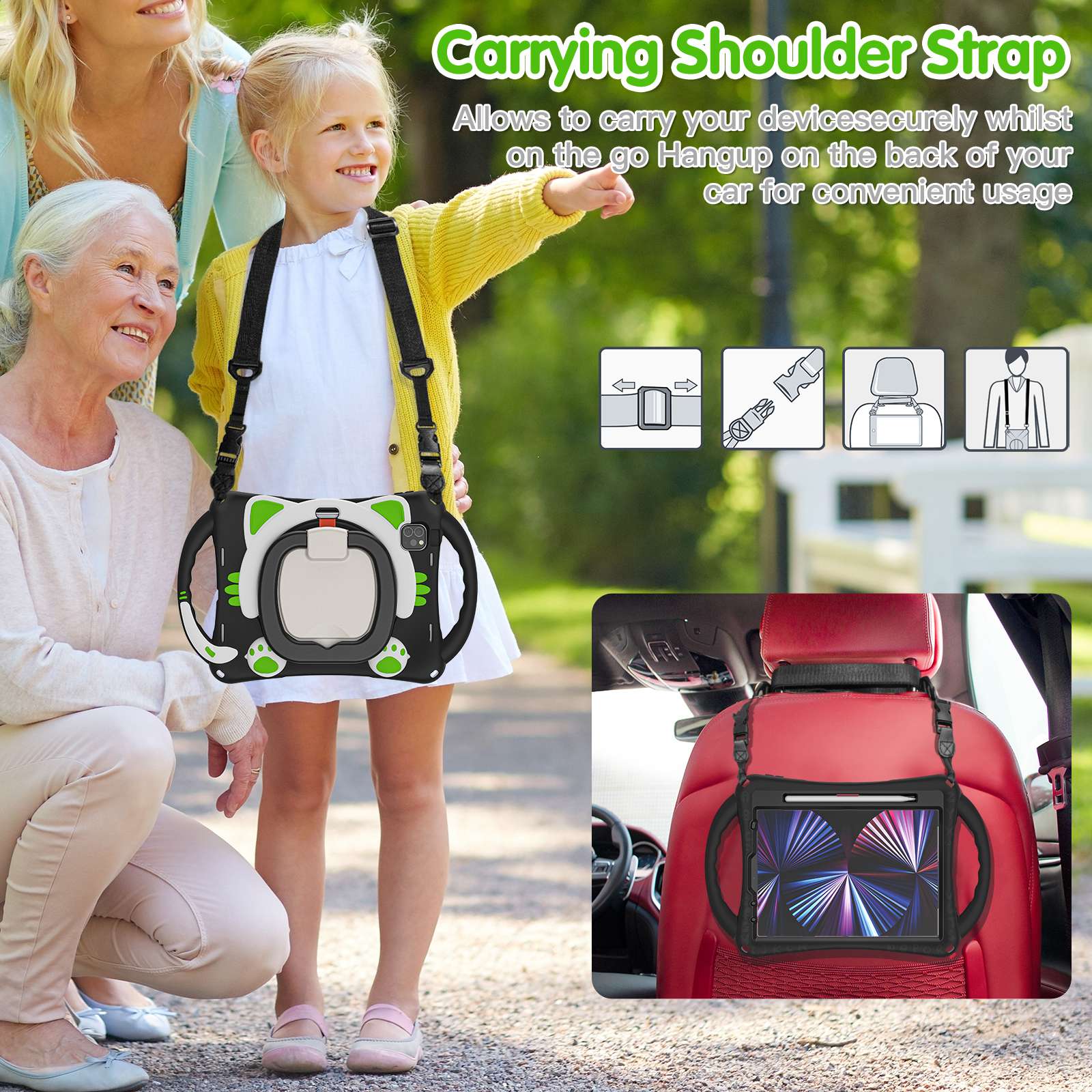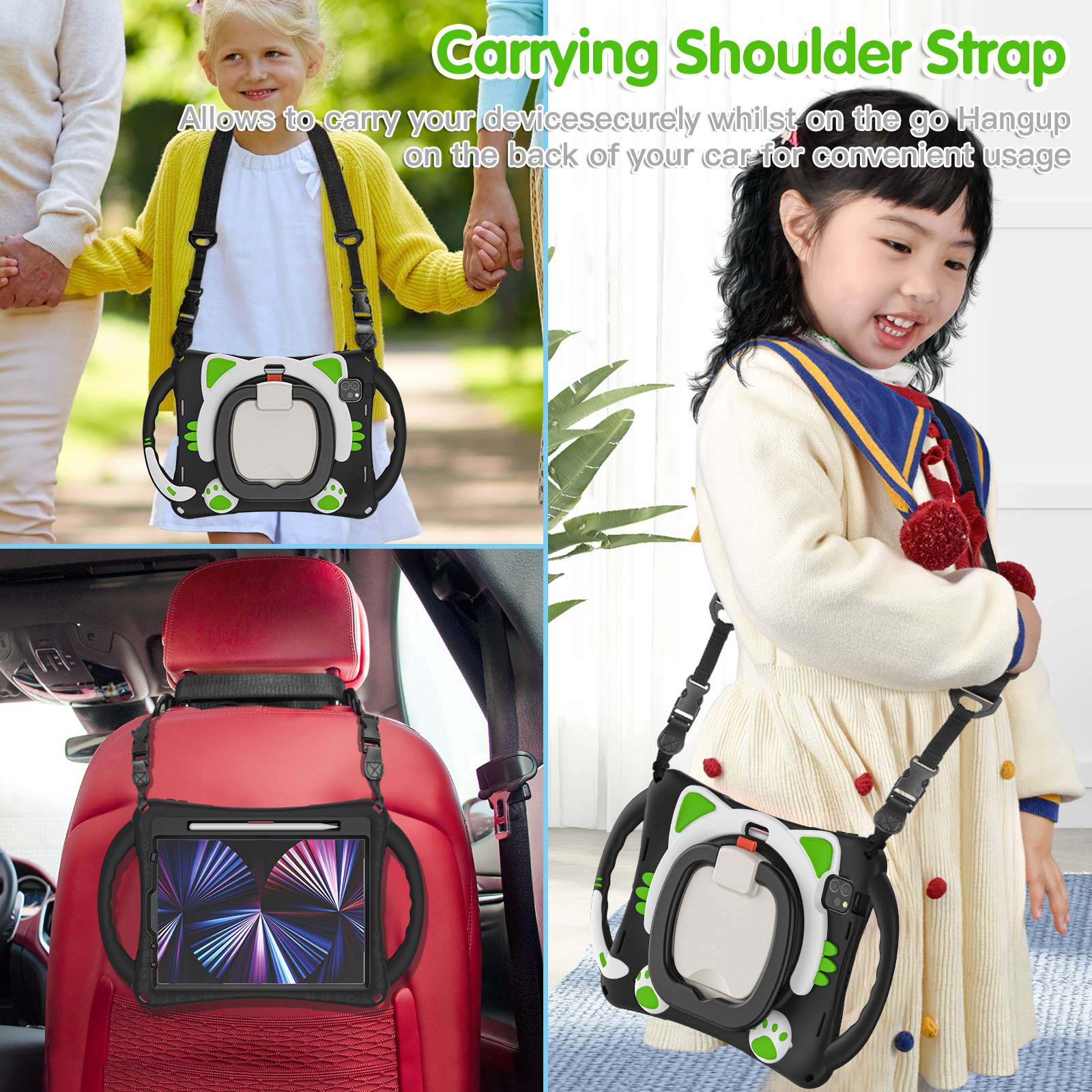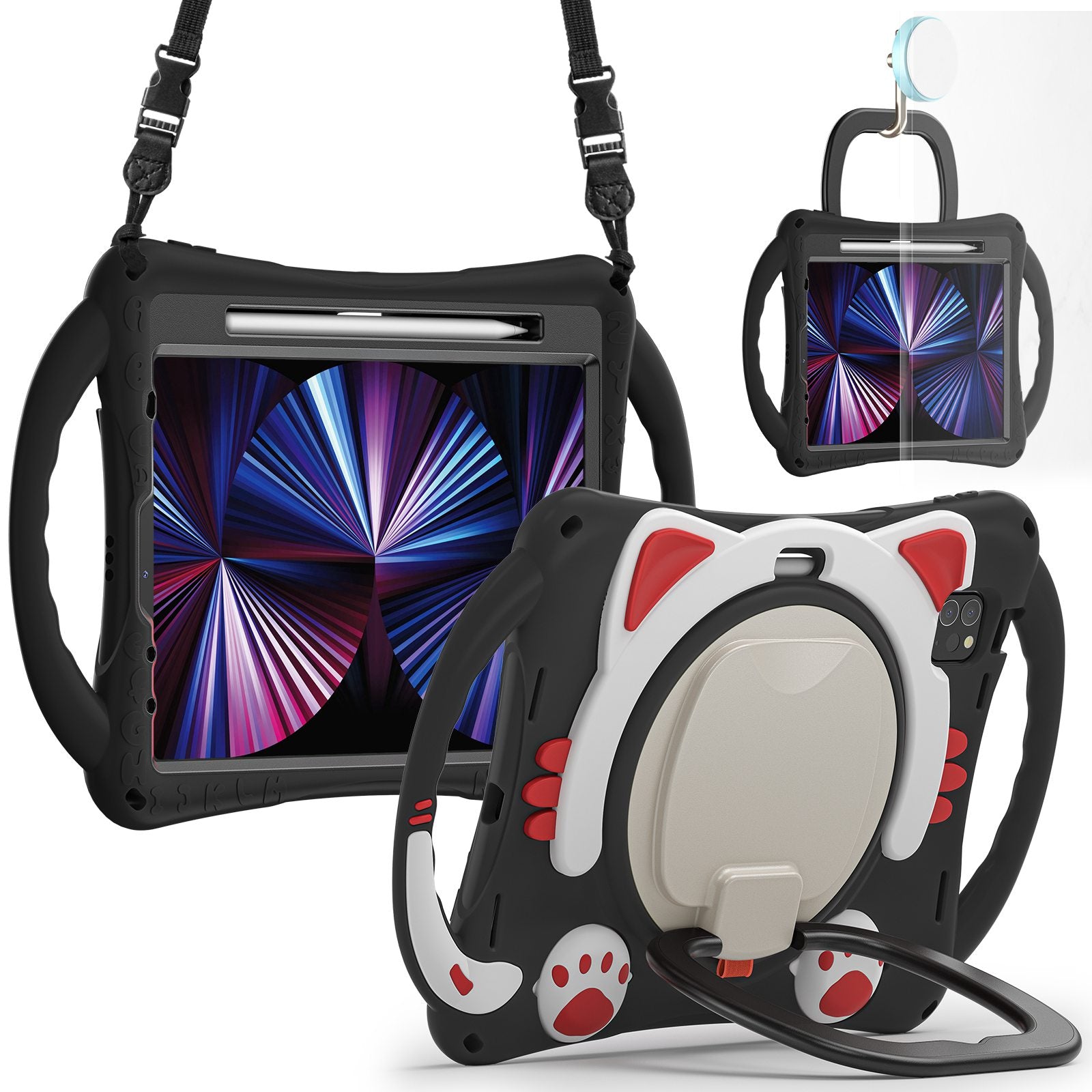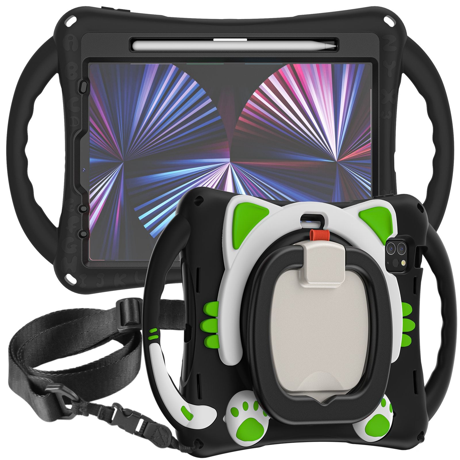 For iPad Air (2022)/(2020)/iPad Pro 11-inch (2021)/(2020)/(2018) Rotating Kickstand Design PC + Silicone Case Handle Grip Shockproof Cover with Shoulder Strap and Pencil Holder