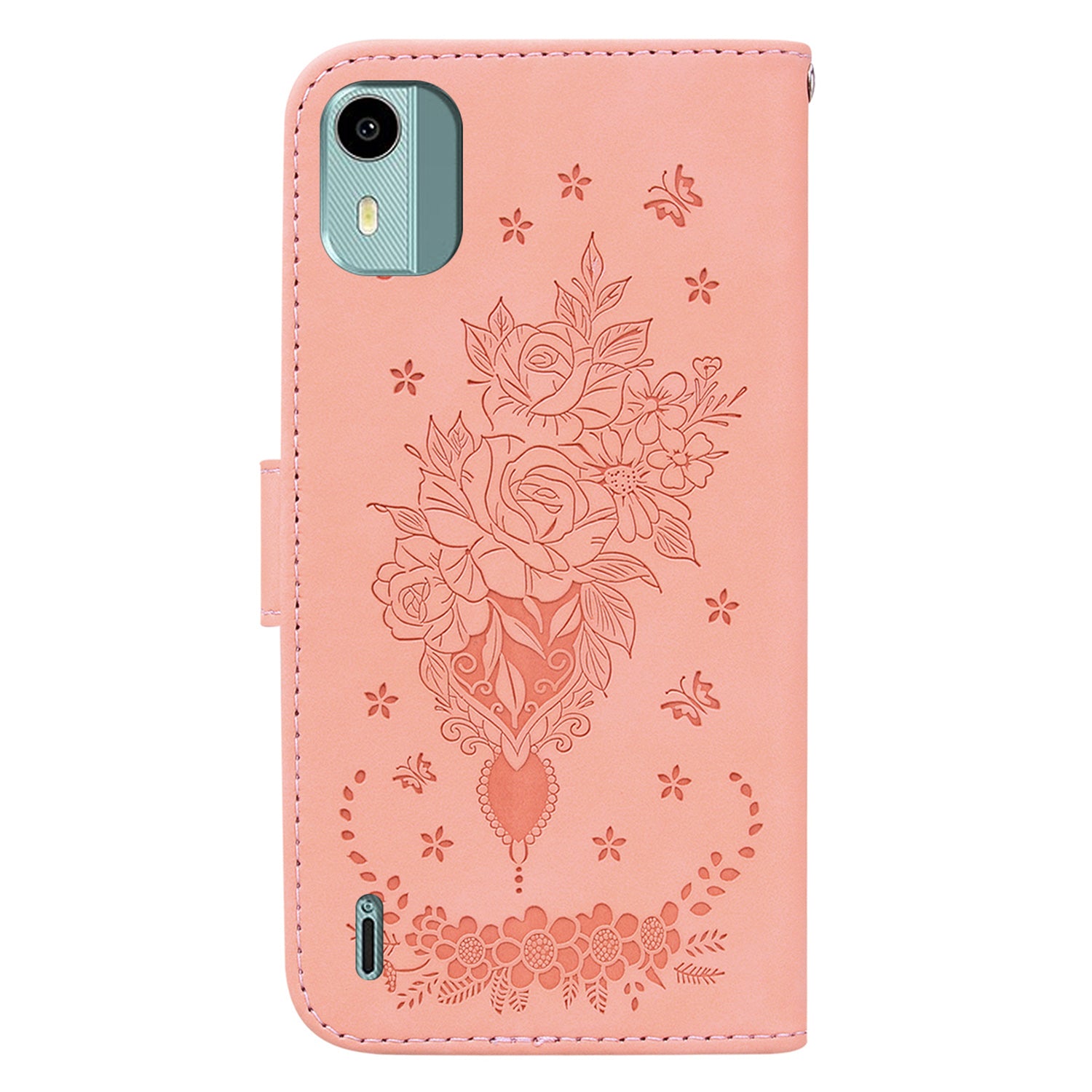 For Nokia C12 4G / C12 Plus / C12 Pro Phone Stand Case Rose Butterfly Imprinted PU Leather Wallet Shell