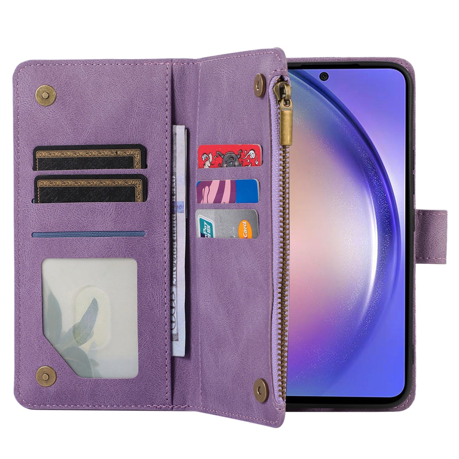 For Samsung Galaxy A24 4G Zipper Pocket Wallet Stand Phone Case 9 Card Slots Imprinted Leather Shell