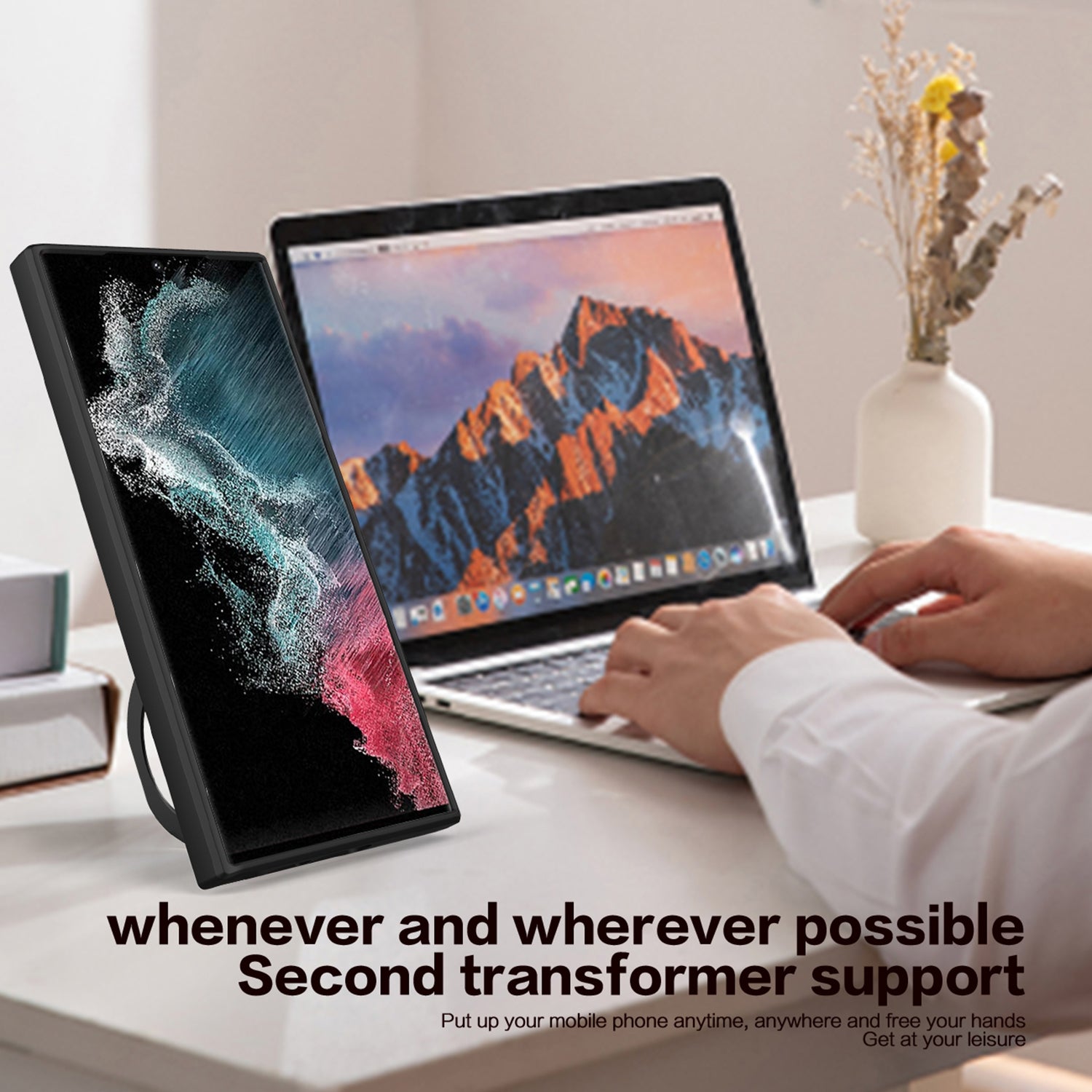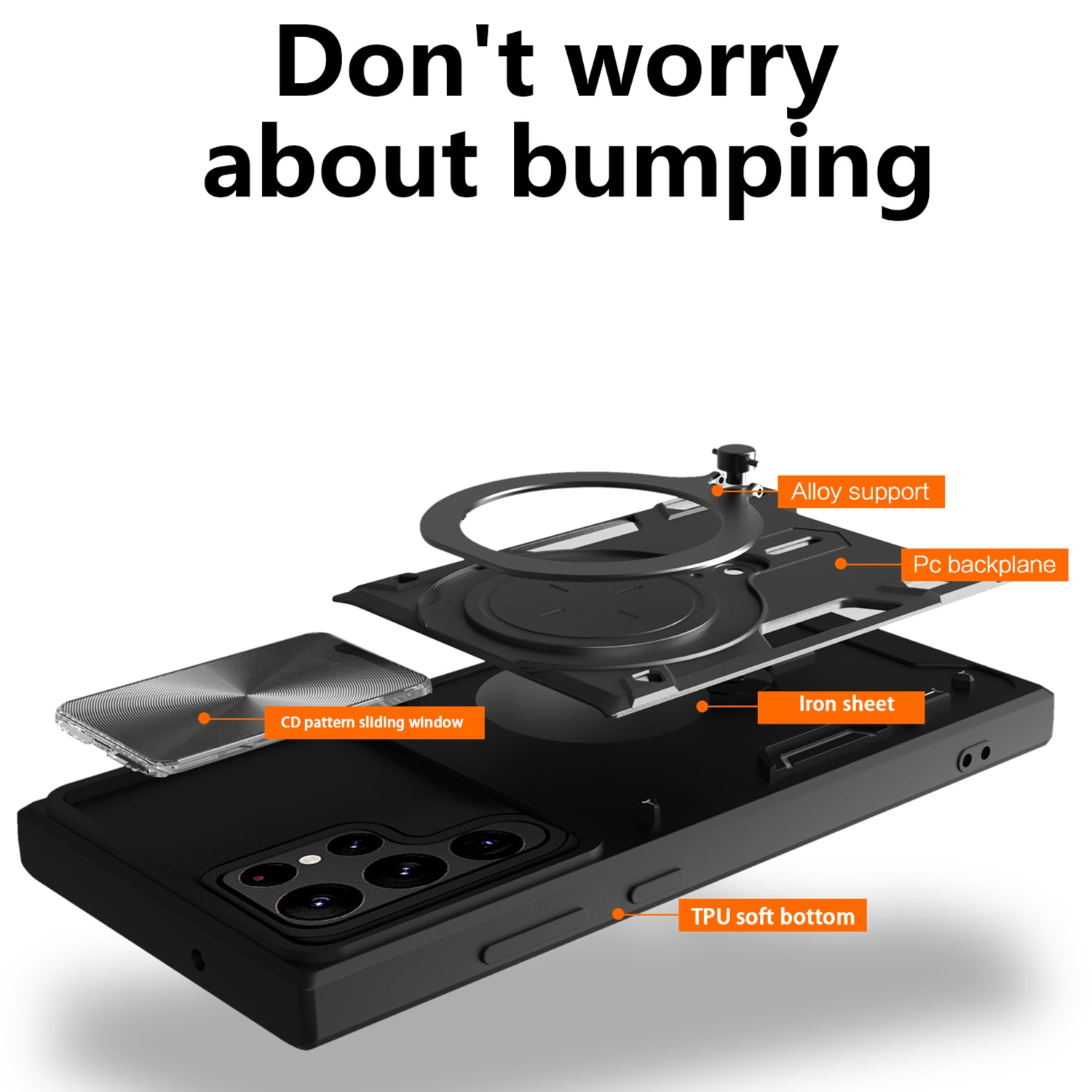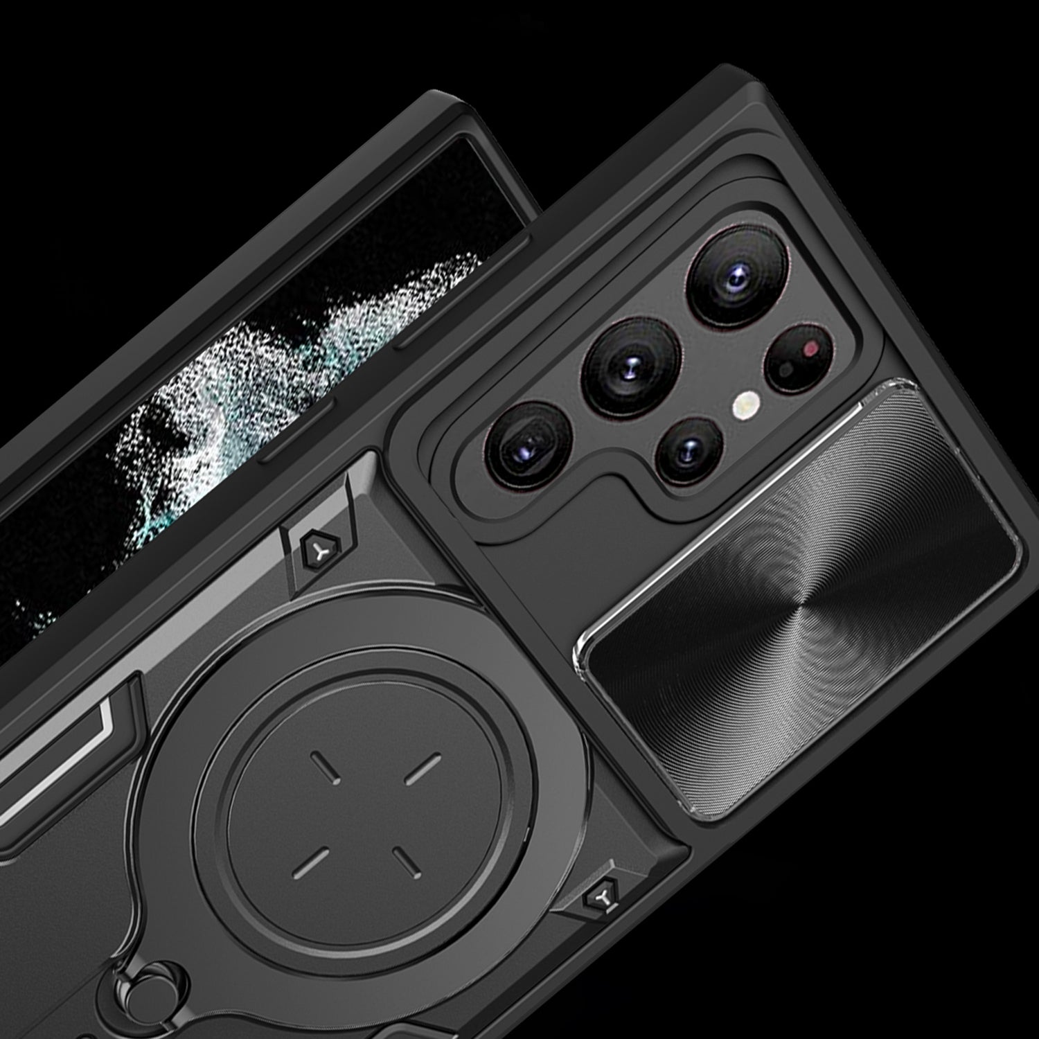 For Samsung Galaxy S22 Ultra 5G Rotatable Kickstand Phone Case Shockproof PC+TPU Cover with Slide Camera Lid