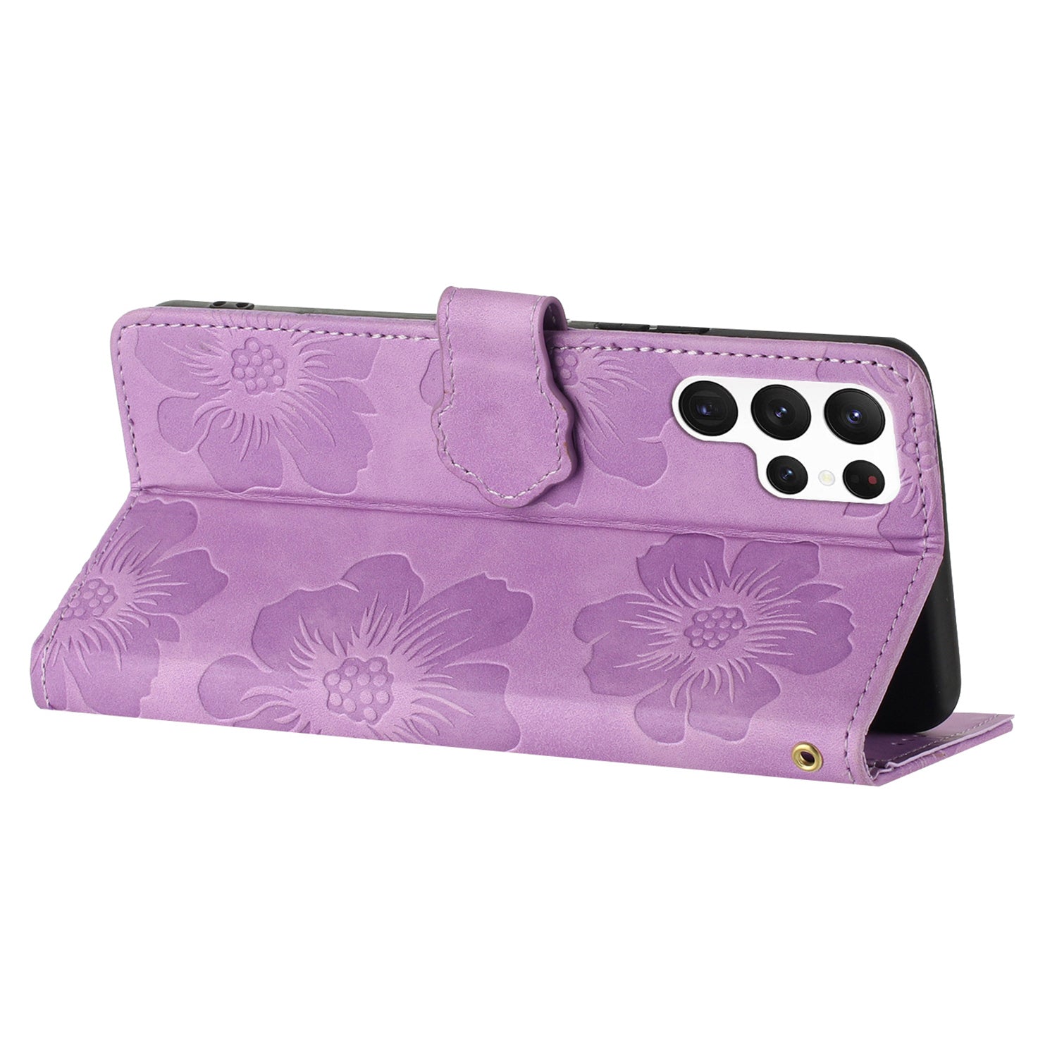 For Samsung Galaxy S23 Ultra Cell Phone Case Wallet Cover PU Leather Stand Imprinted Flower Pattern Shell