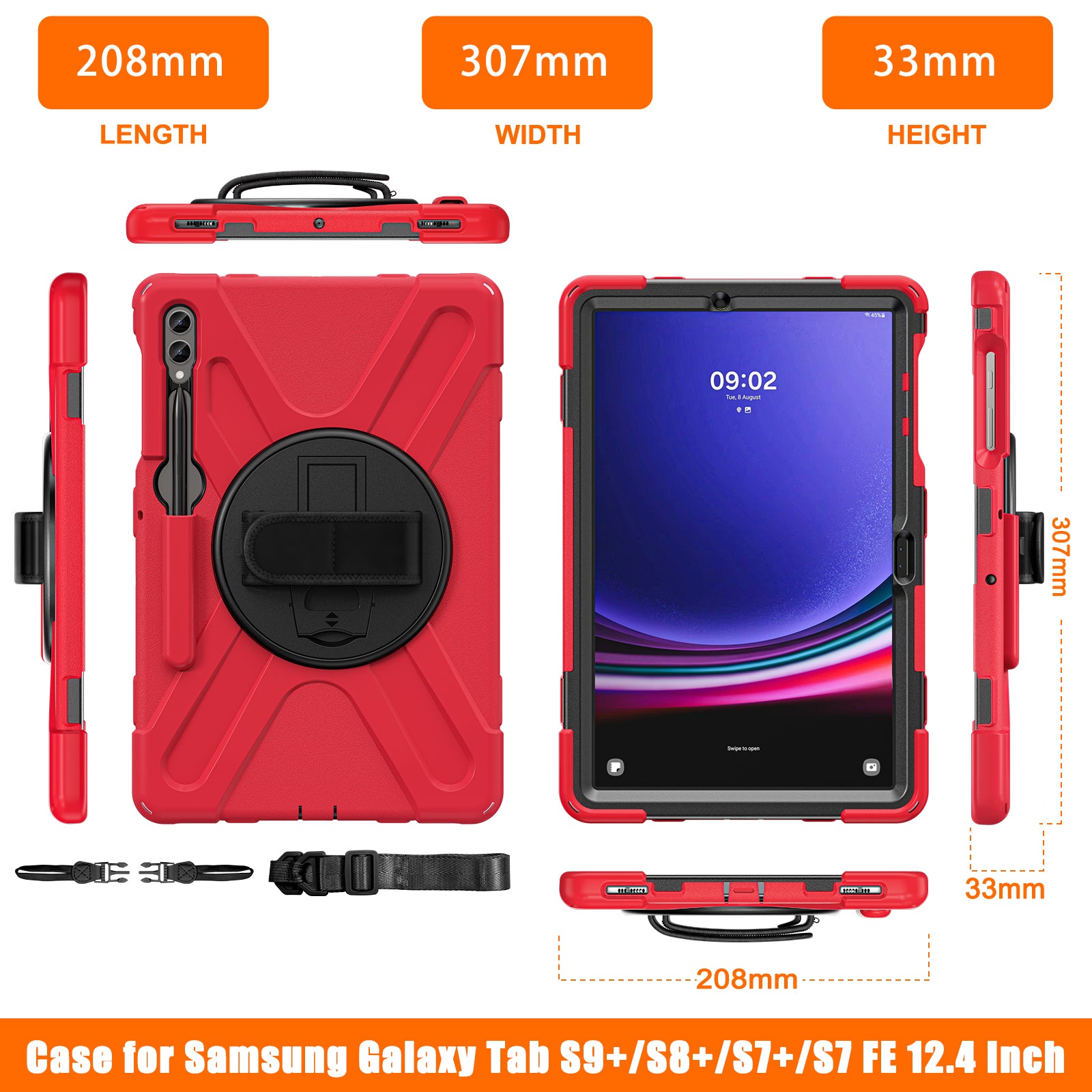 - Integrated 360-degree rotary kickstand with a magic tape hand band frees your hands for landscape or portrait viewing