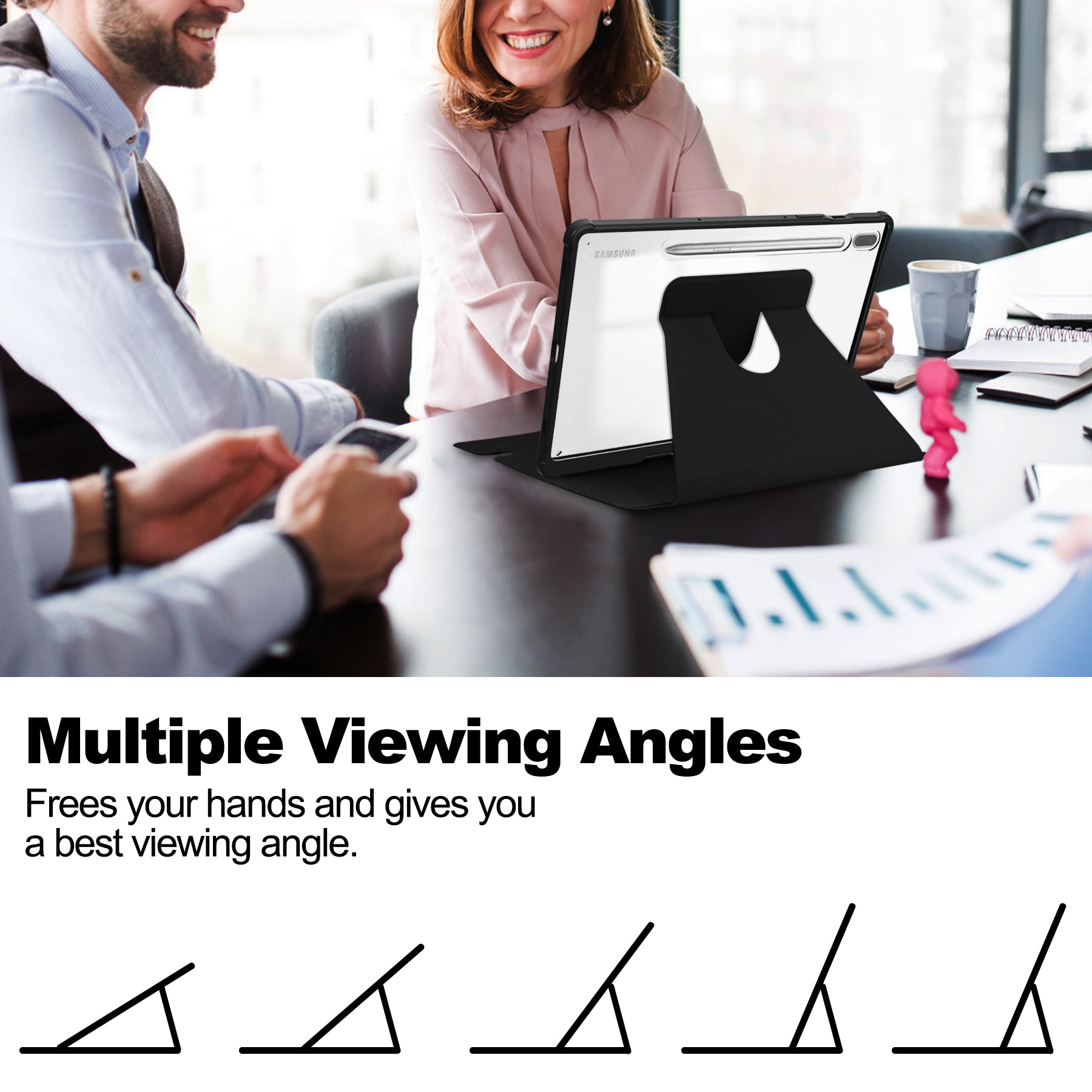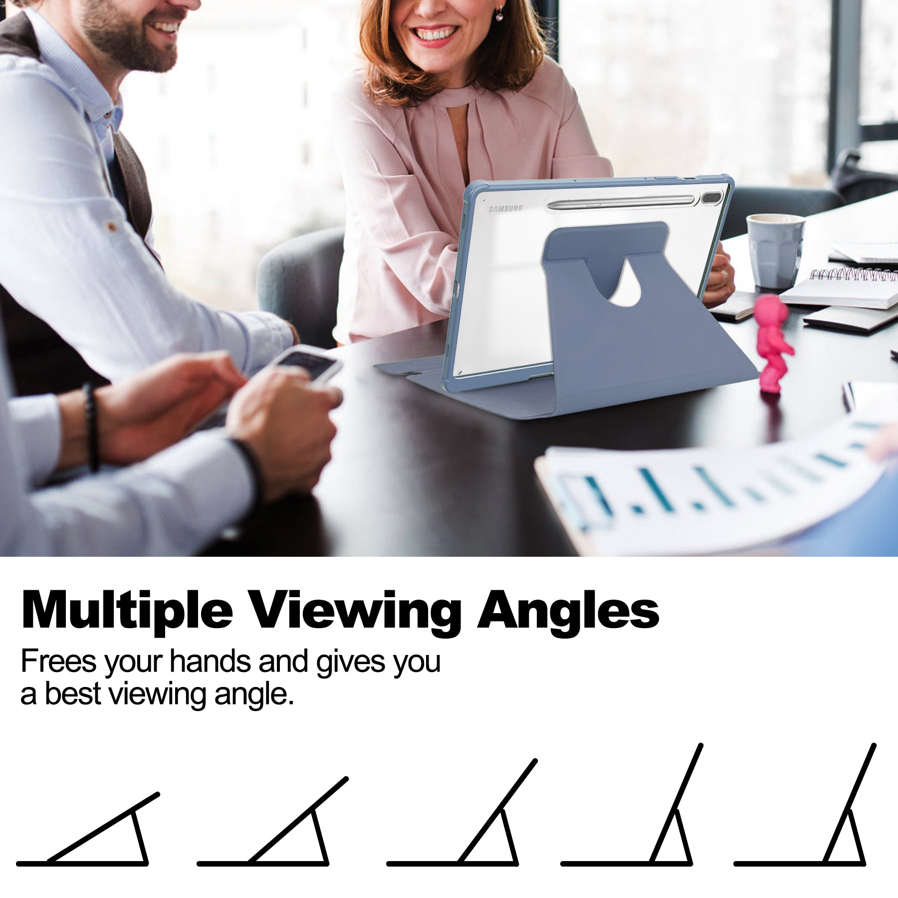 - The 360-degree rotating stand provides a comfortable angle for viewing and typing