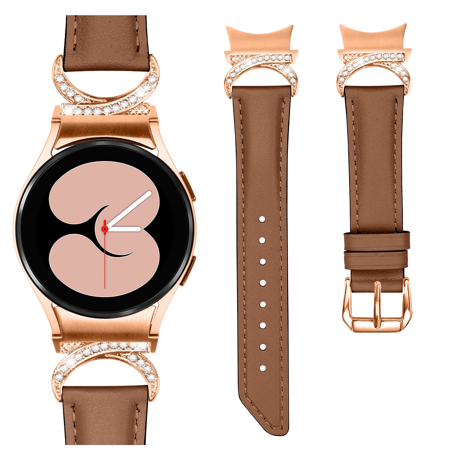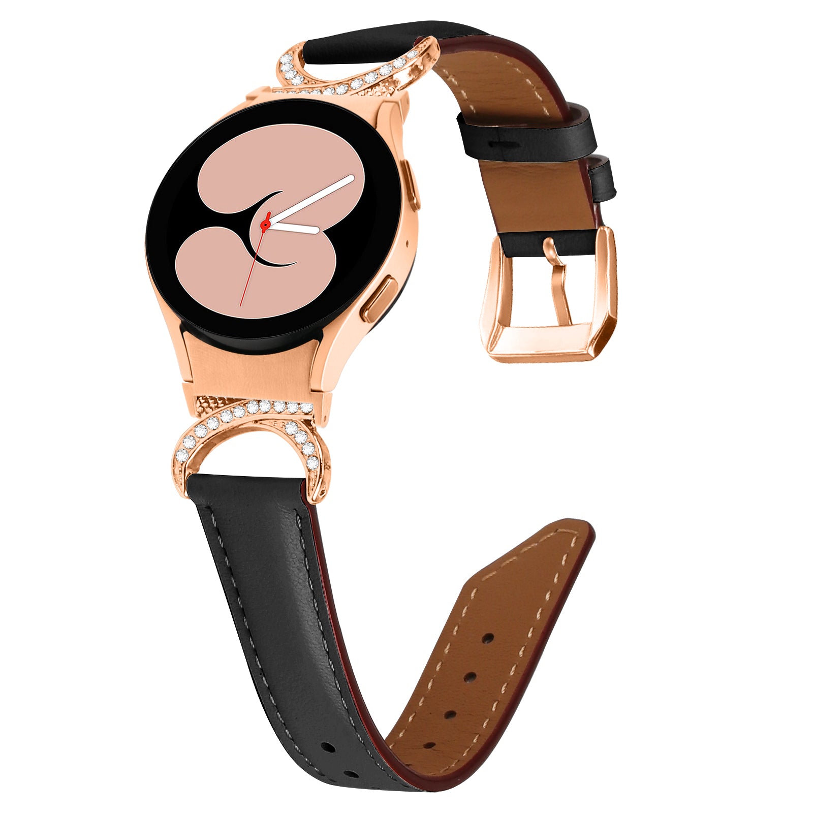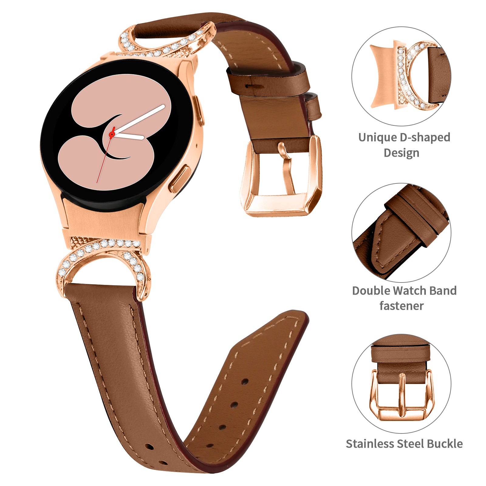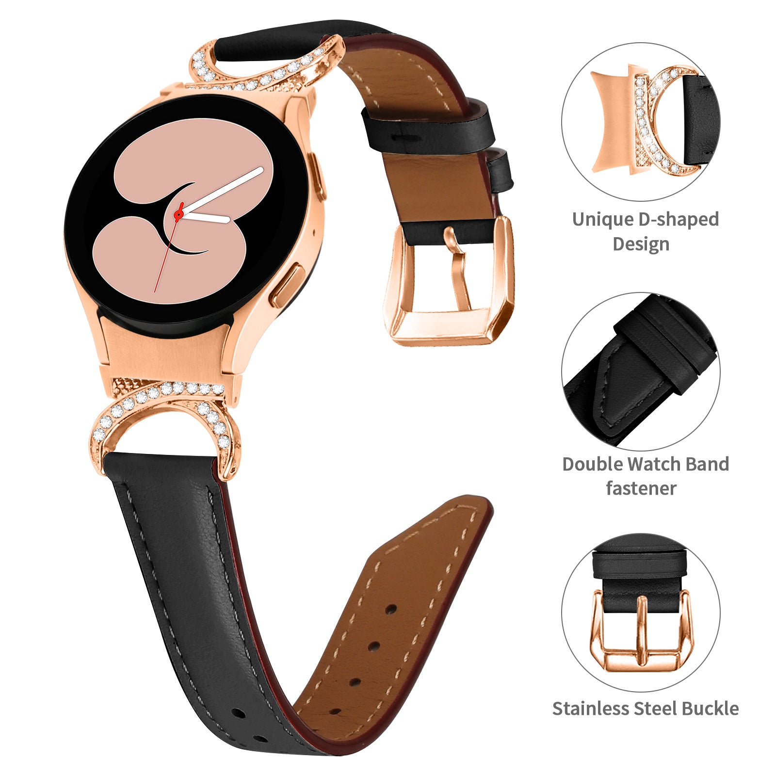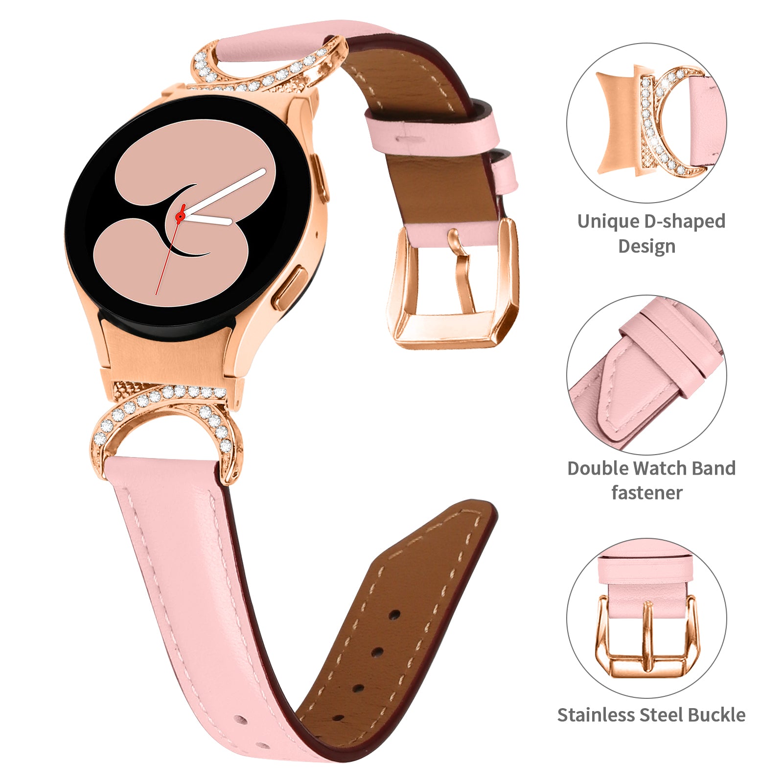For Samsung Galaxy Watch6 40mm 44mm / Watch6 Classic 43mm 47mm / Watch 5 40mm 44mm / Watch4 40mm 44mm Rhinestone D-shape Connector Wrist Band Adjustable Split Leather Strap with Rose Gold Buckle