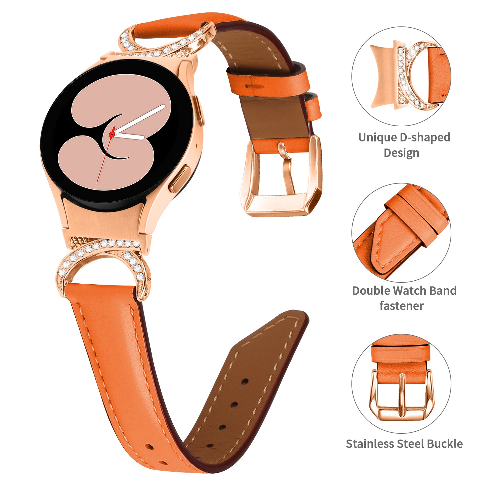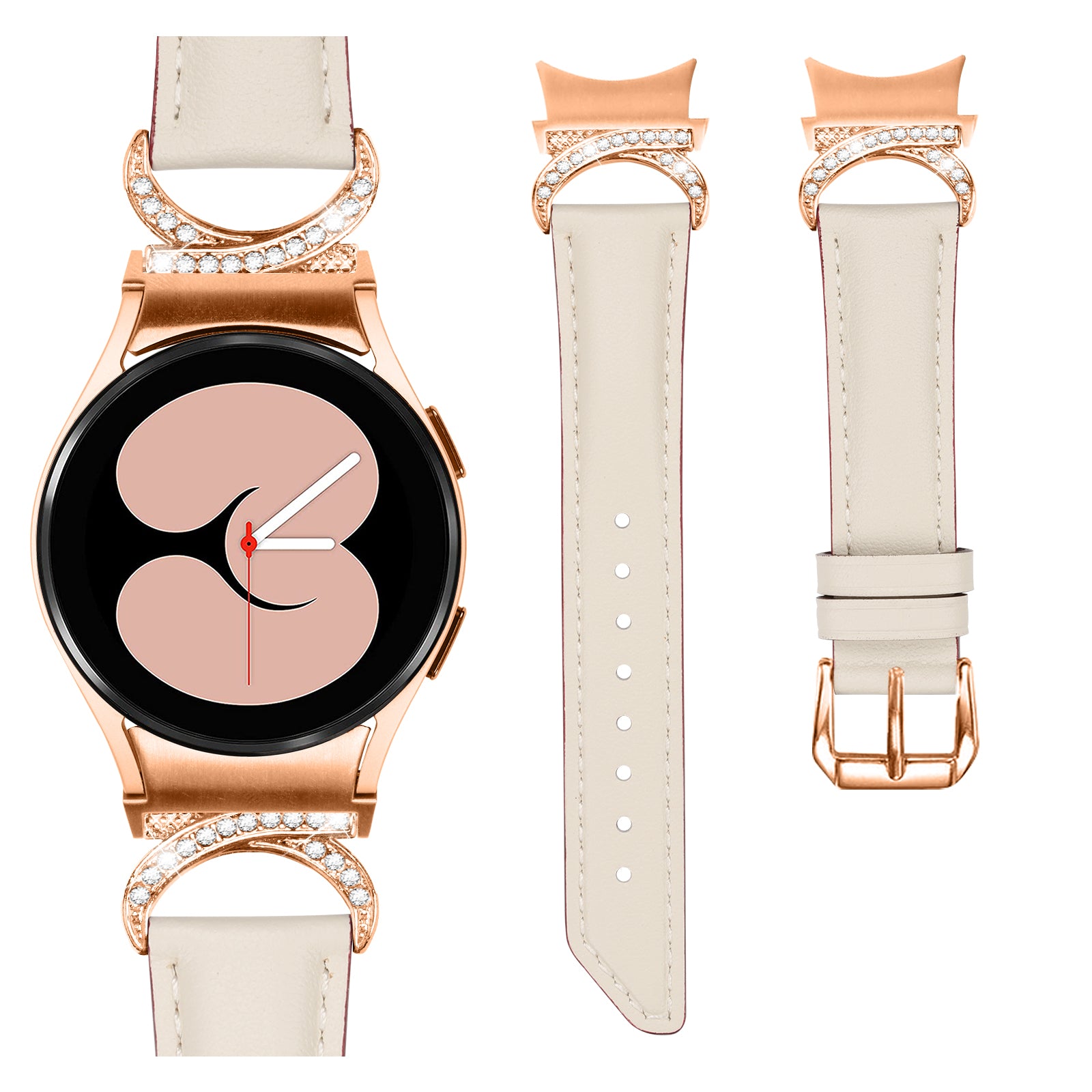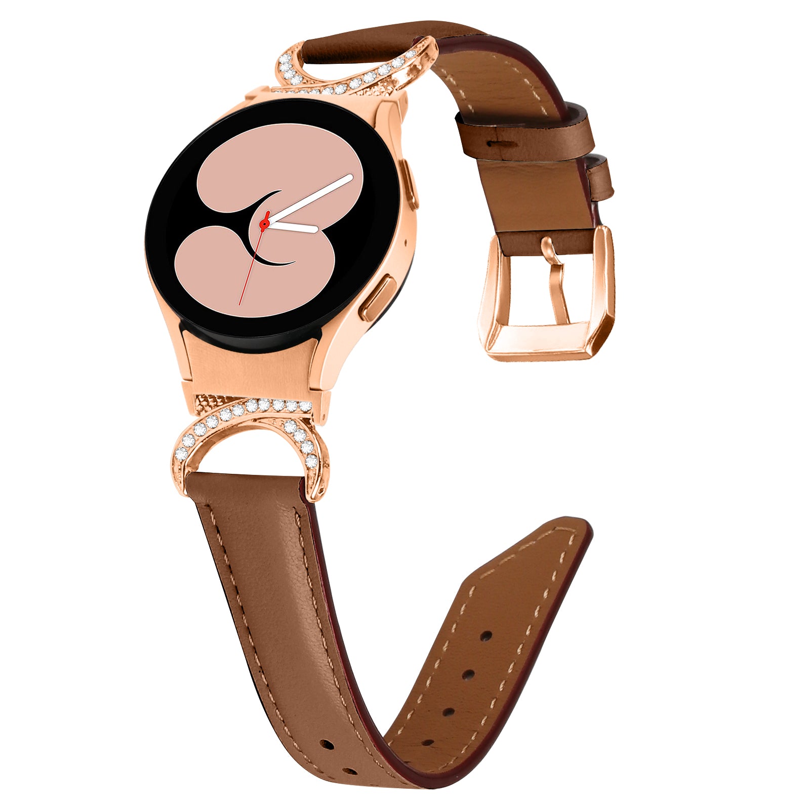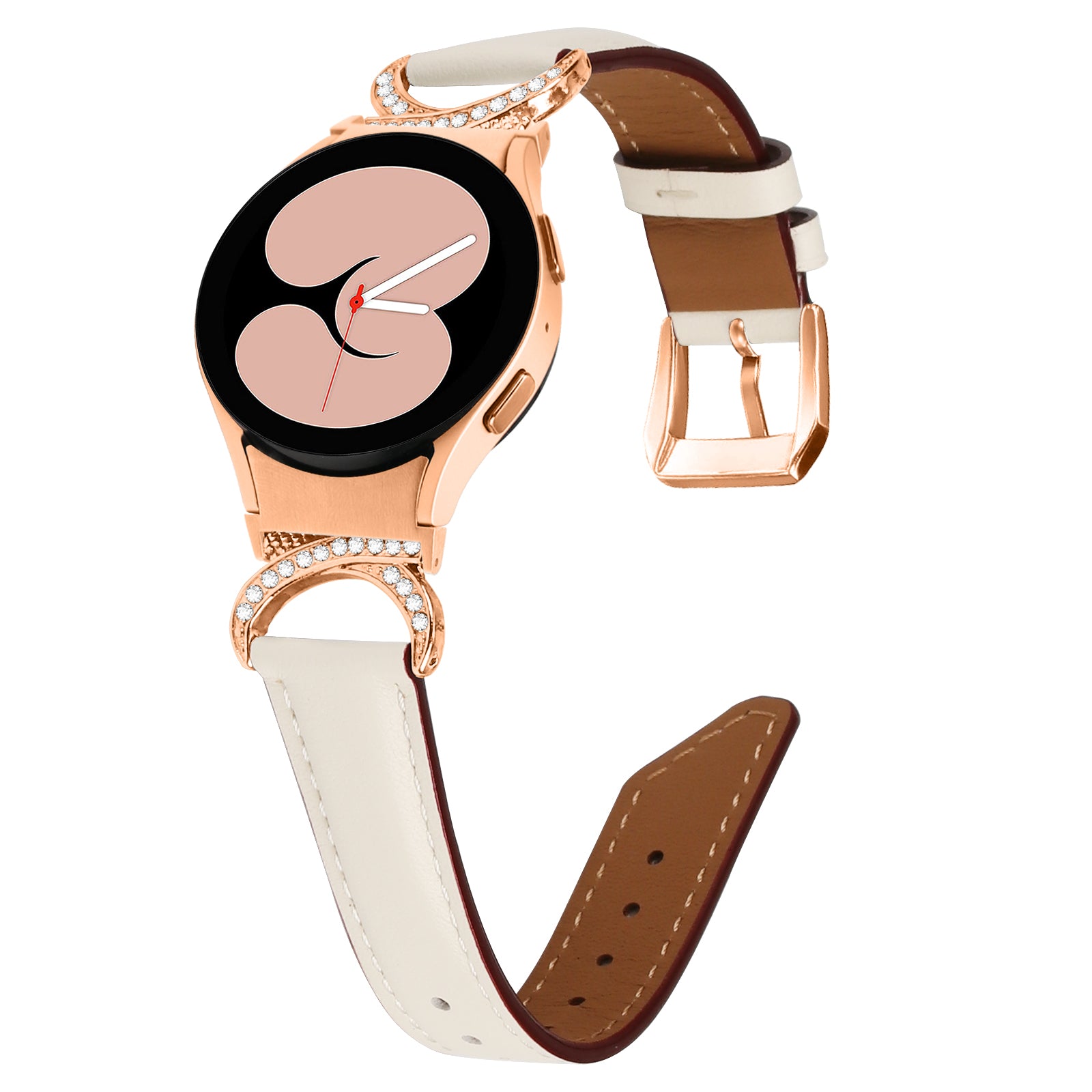 For Samsung Galaxy Watch6 40mm 44mm / Watch6 Classic 43mm 47mm / Watch 5 40mm 44mm / Watch4 40mm 44mm Rhinestone D-shape Connector Wrist Band Adjustable Split Leather Strap with Rose Gold Buckle