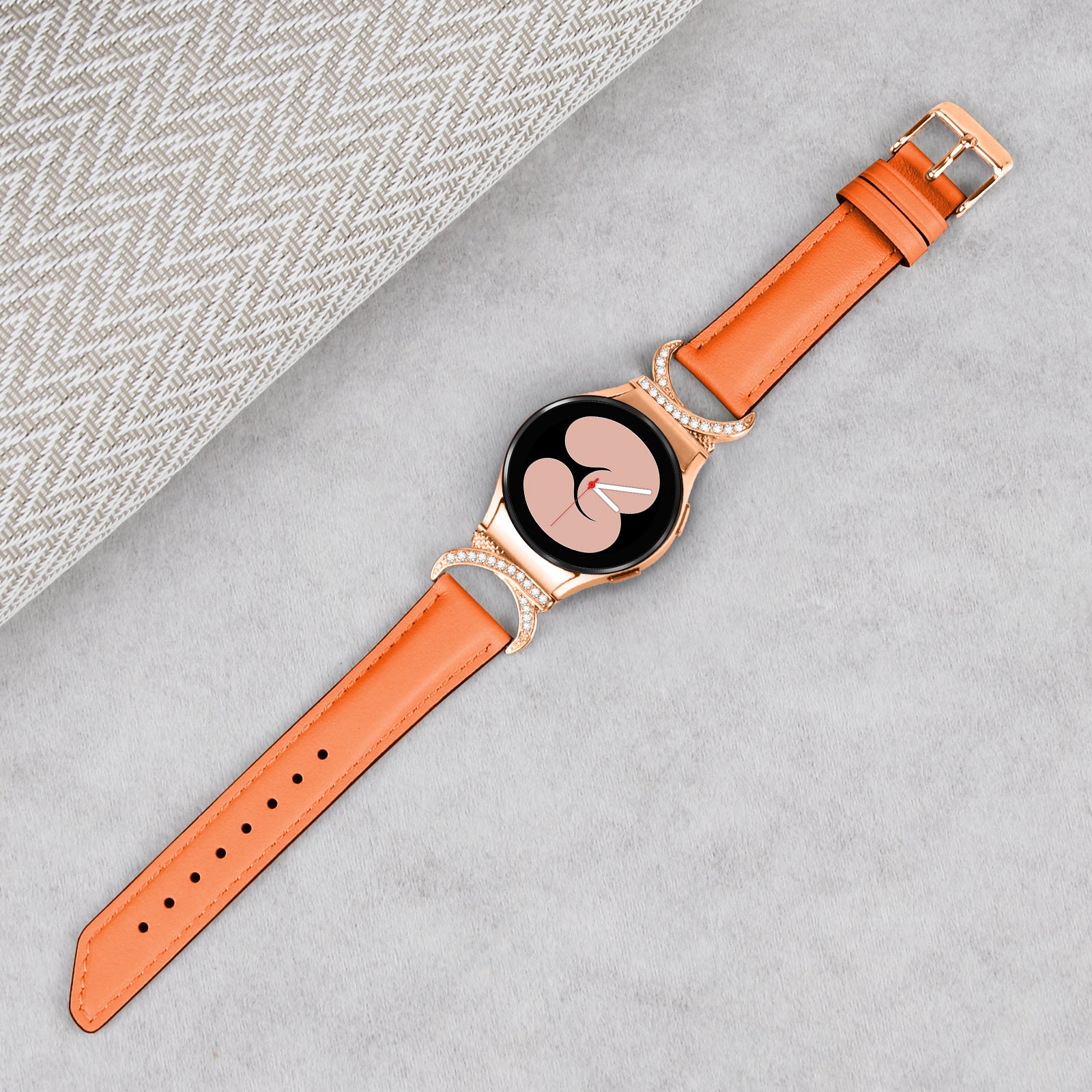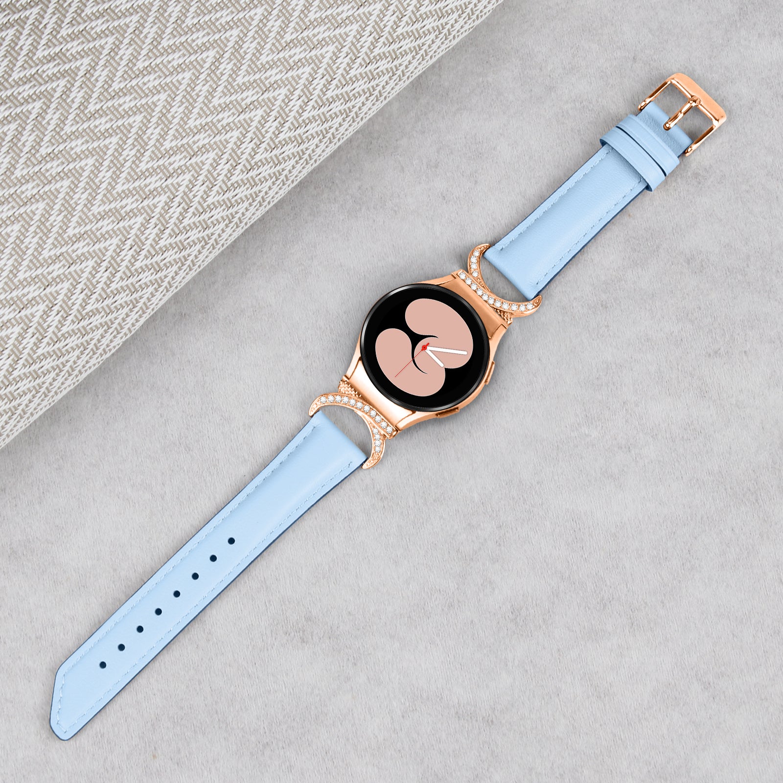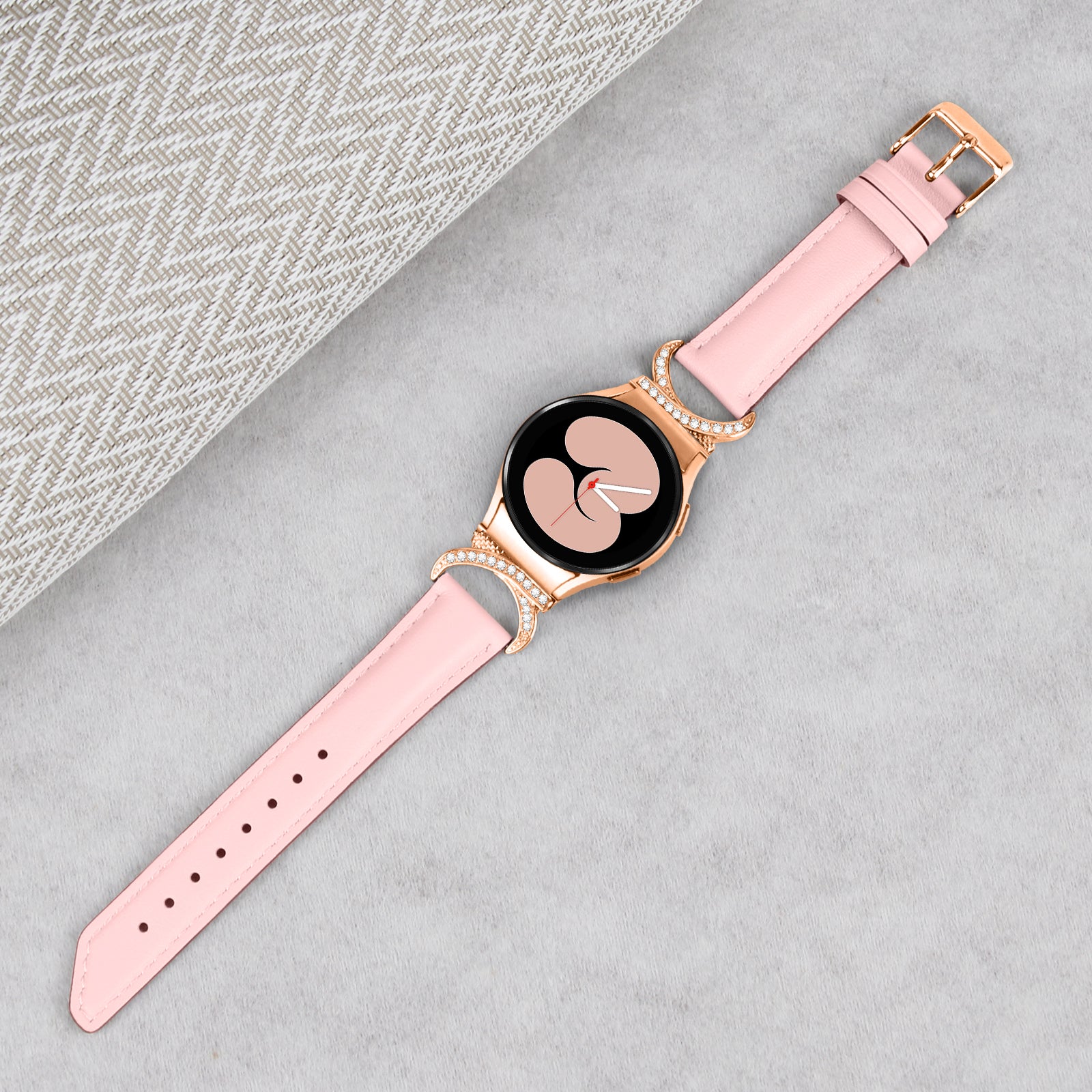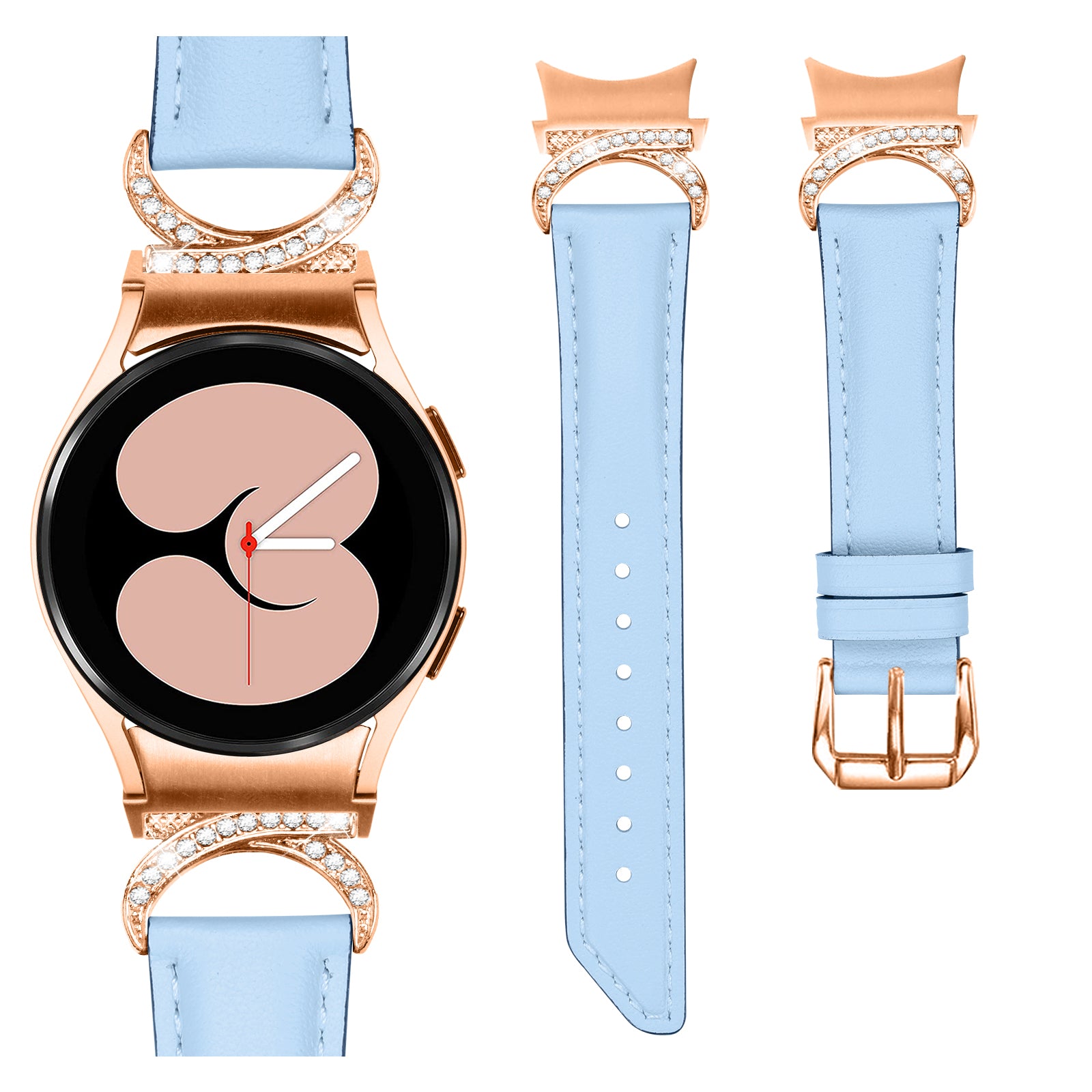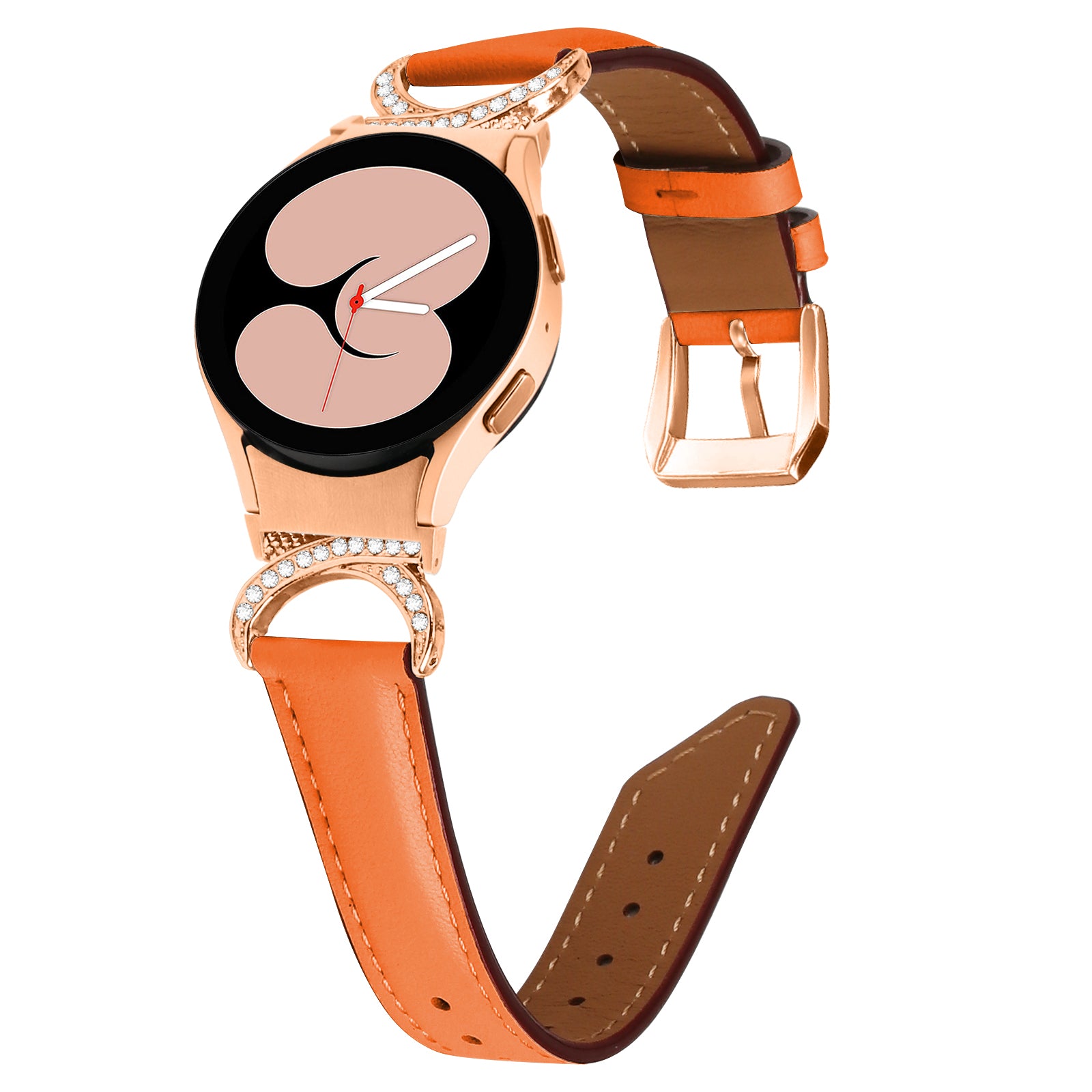 For Samsung Galaxy Watch6 40mm 44mm / Watch6 Classic 43mm 47mm / Watch 5 40mm 44mm / Watch4 40mm 44mm Rhinestone D-shape Connector Wrist Band Adjustable Split Leather Strap with Rose Gold Buckle