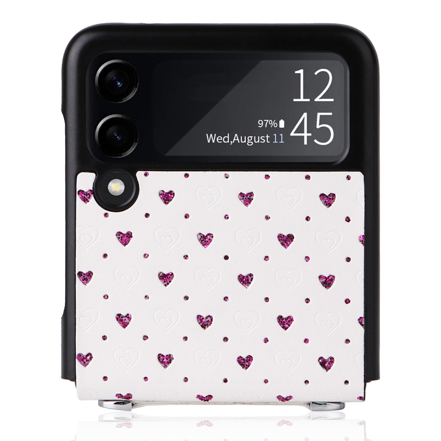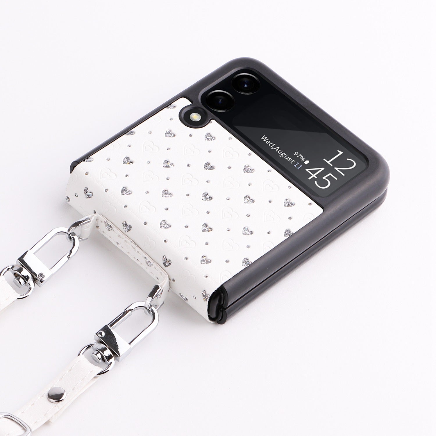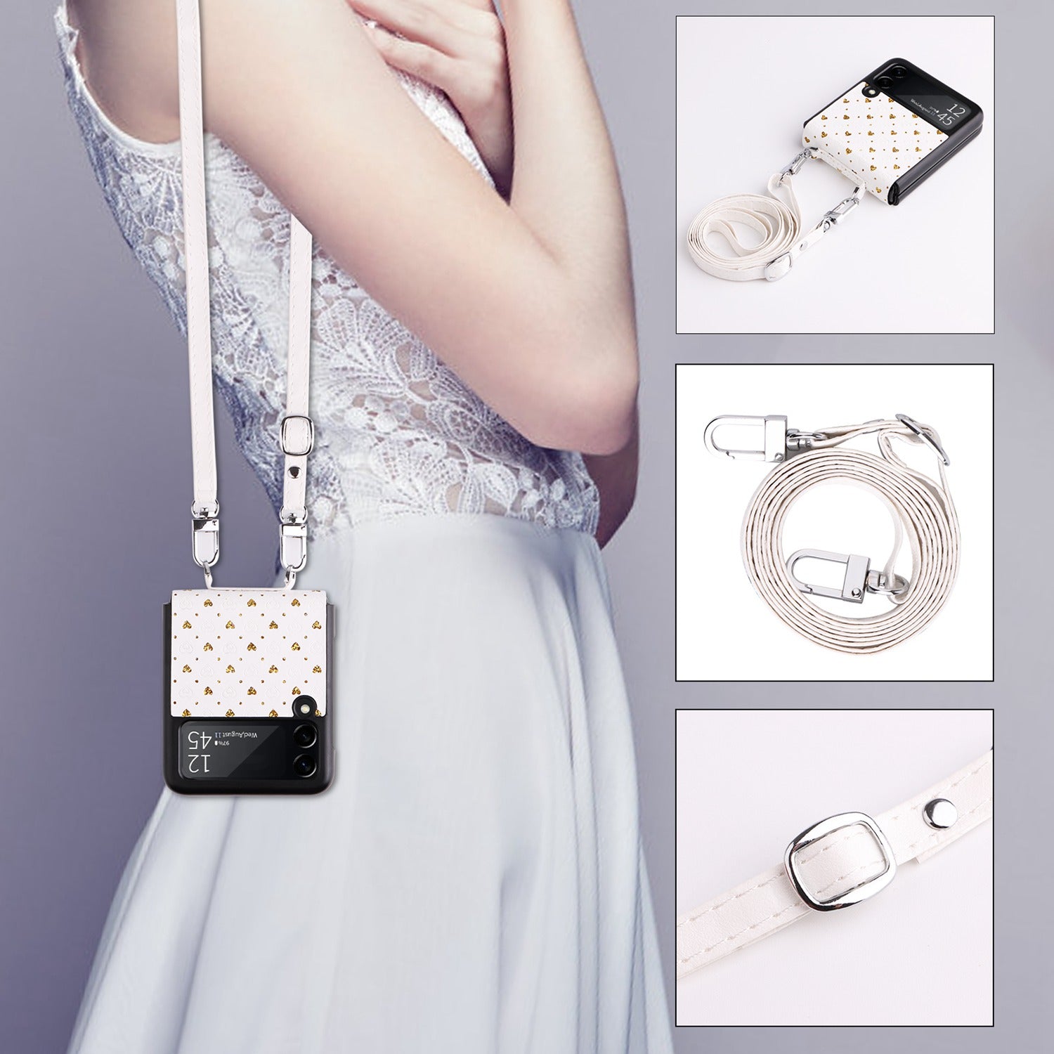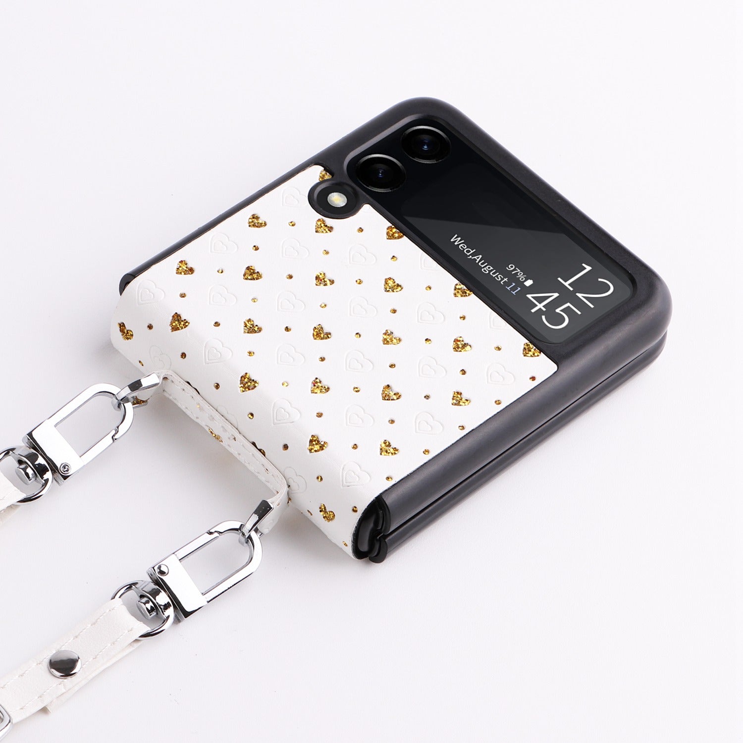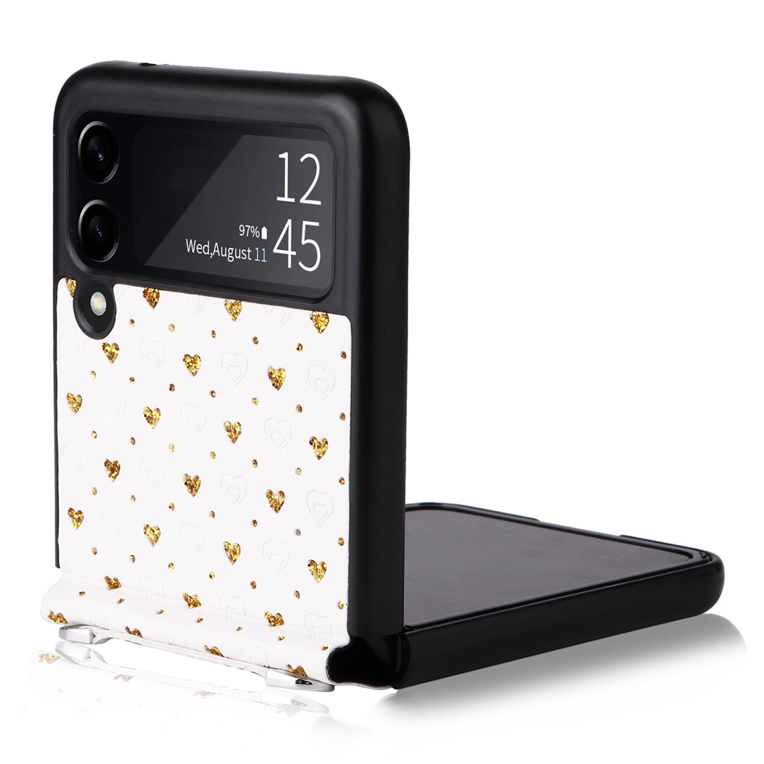 For Samsung Galaxy Z Flip3 5G PU Leather Coated PC Case Multiple Heart Shapes One-piece Phone Cover with Shoulder Strap