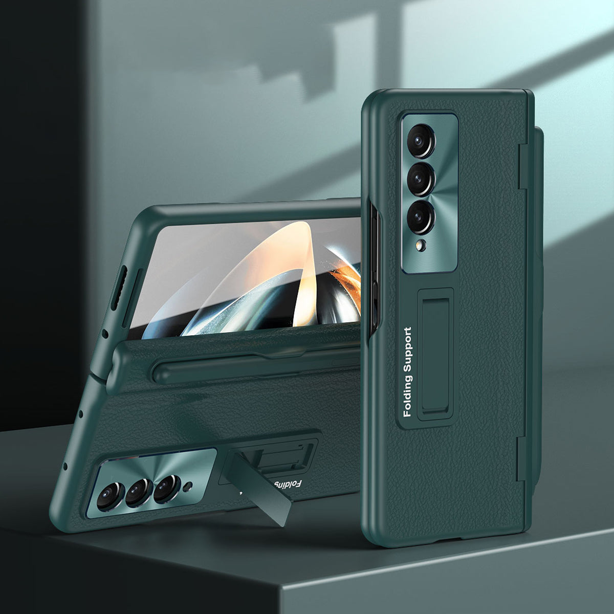For Samsung Galaxy Z Fold3 5G Hinged Kickstand Case PU Leather + PC Phone Cover with Stylus and Tempered Glass Film