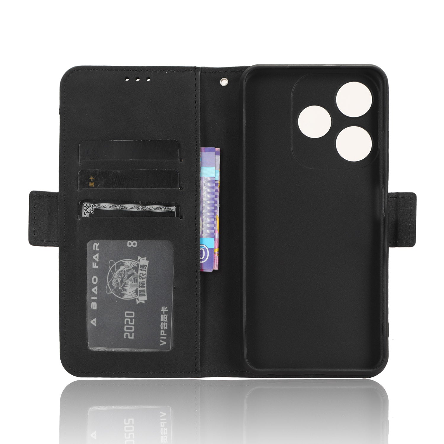 - Features 3 card slots and 1 cash pocket on the inside + separately taken-out card holder on the outside, really big capacity