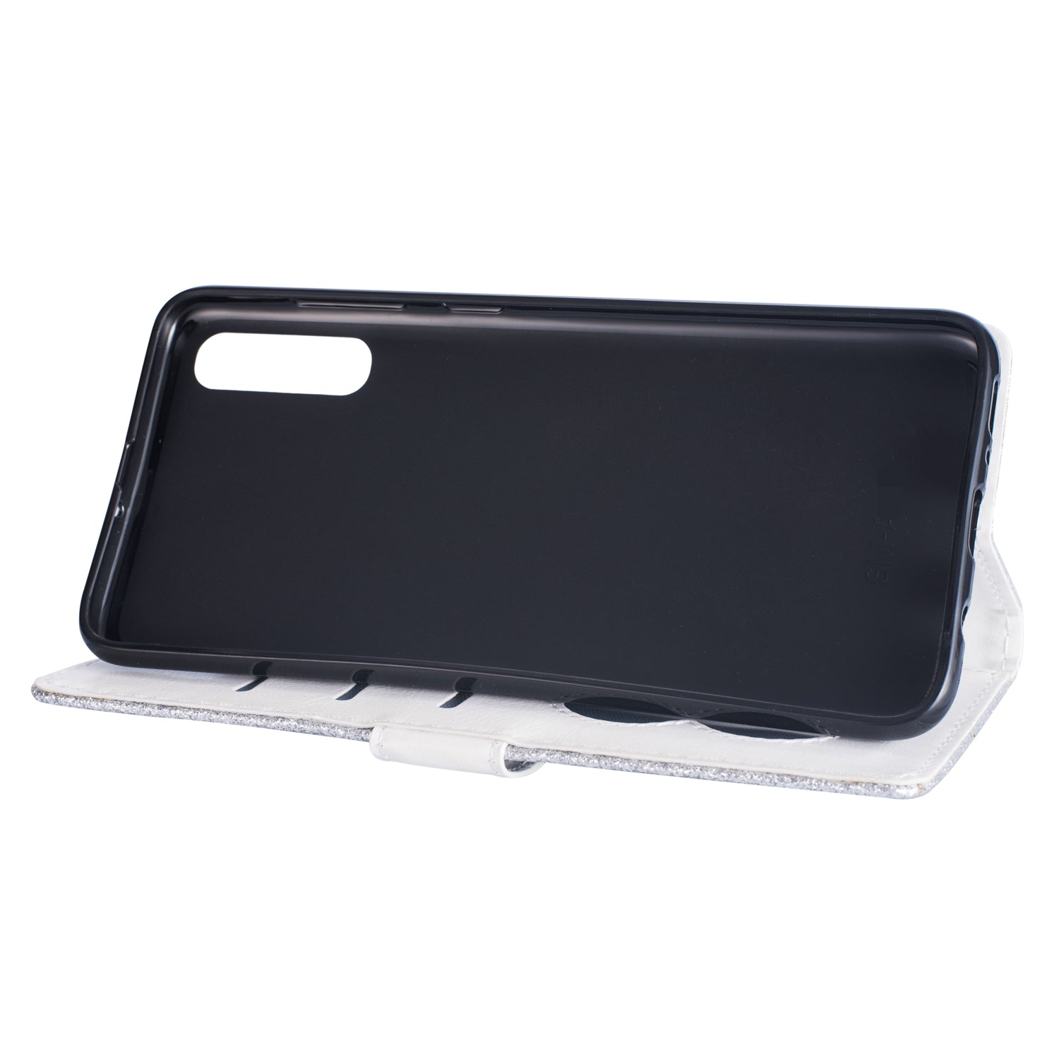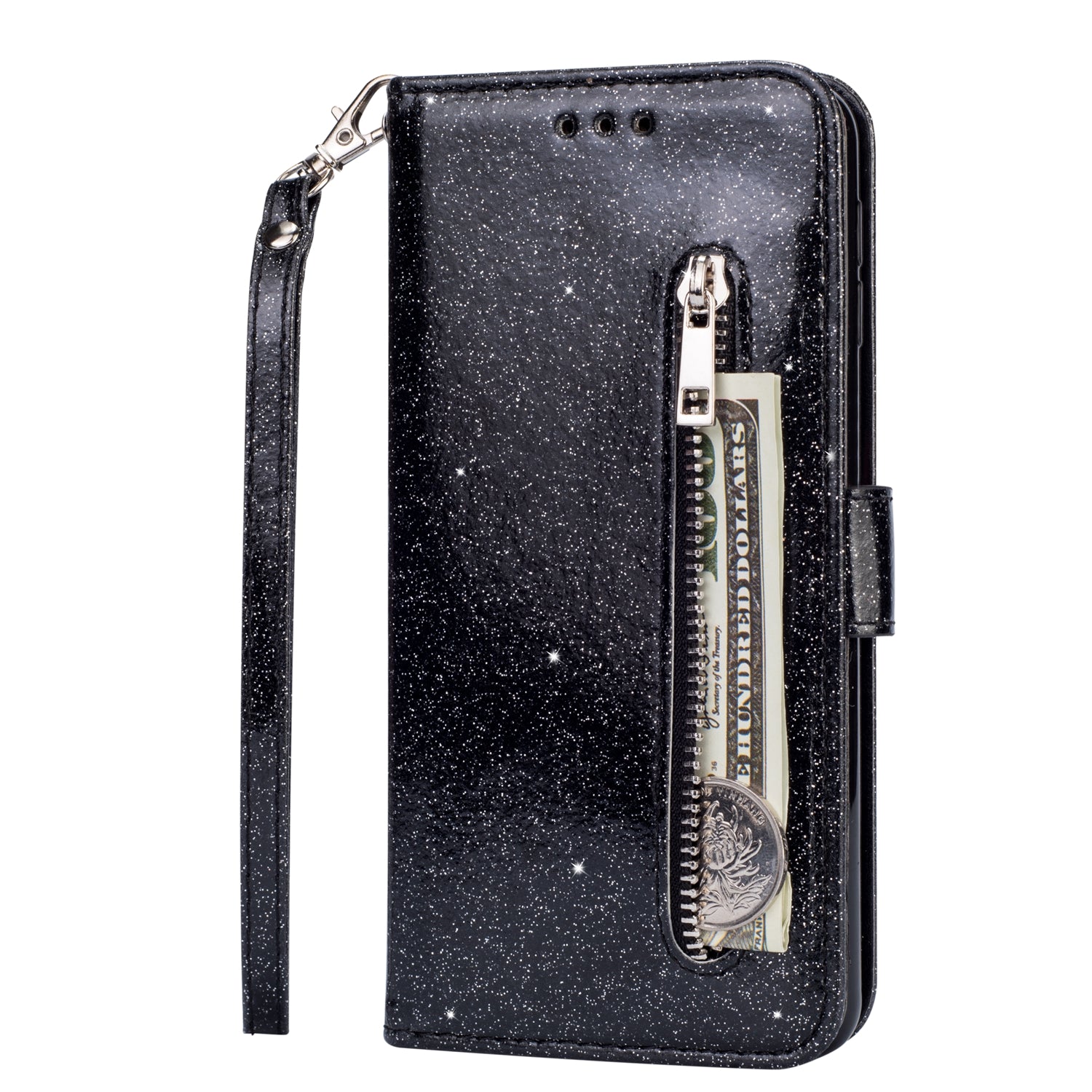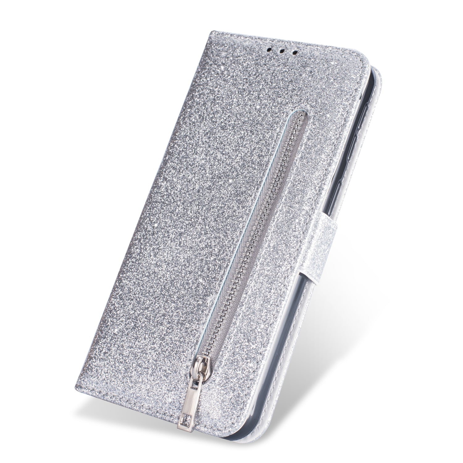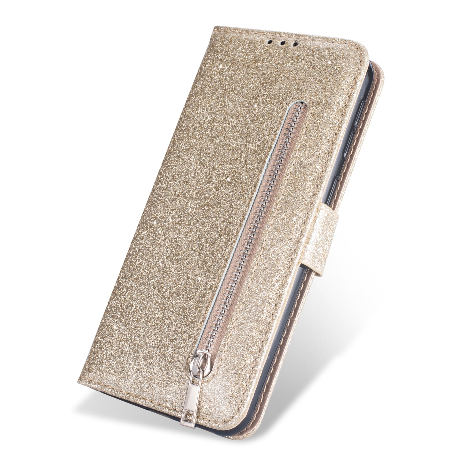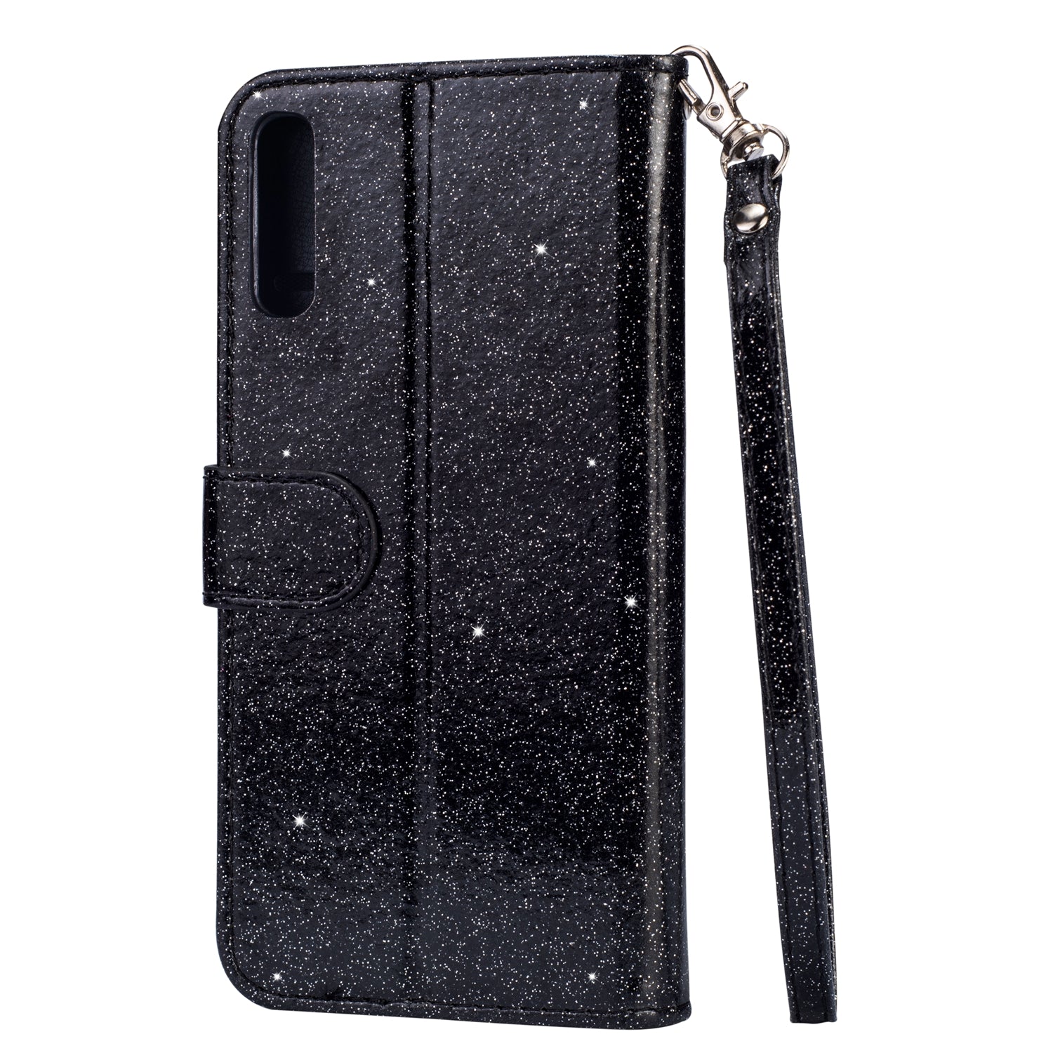 Glitter Powder Zippered Stand Leather Wallet Case with Strap for Samsung Galaxy A70