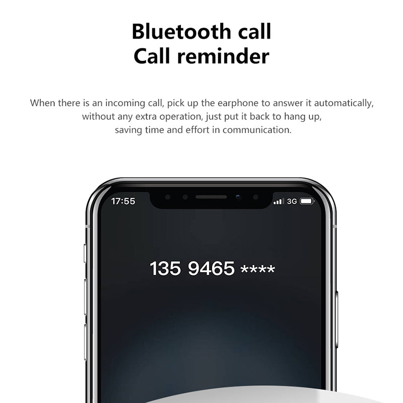- Bluetooth Call Reminder: When there is an incoming call, pick up the earphone to answer it automatically, without any extra operation, just put it back to hang up, saving time and effort in communication