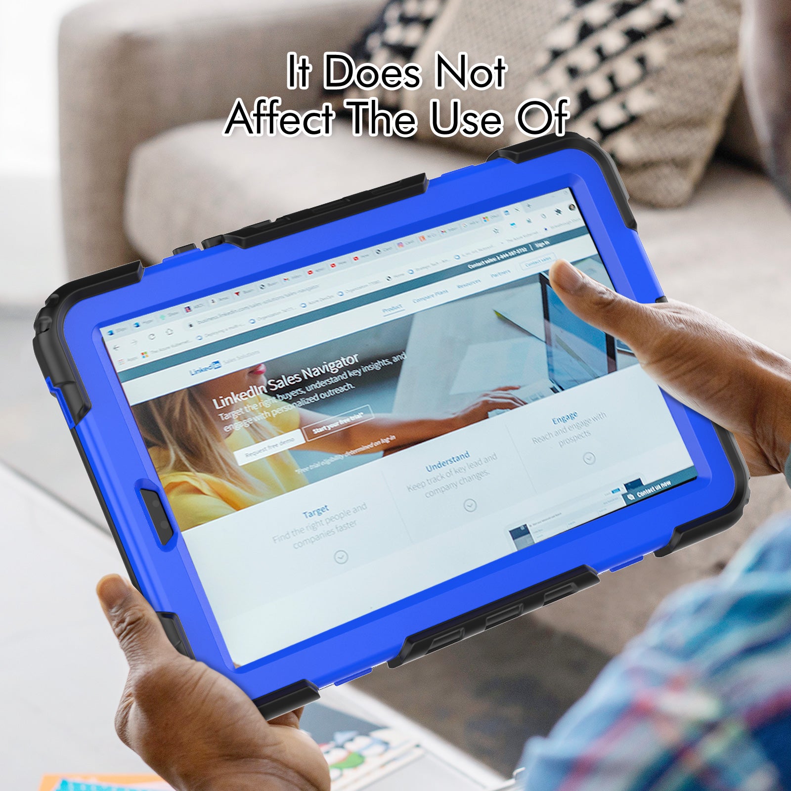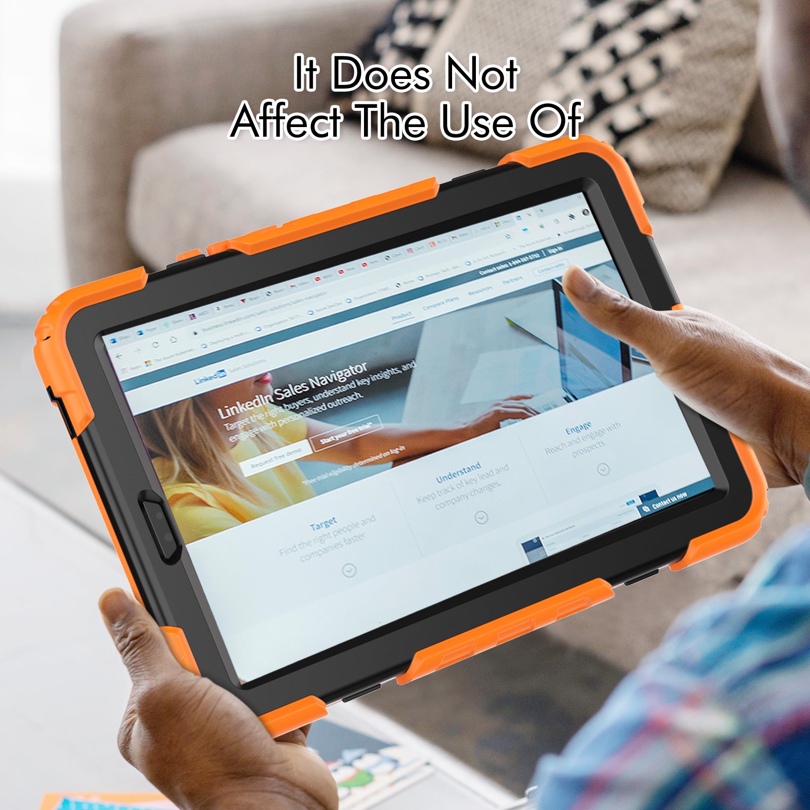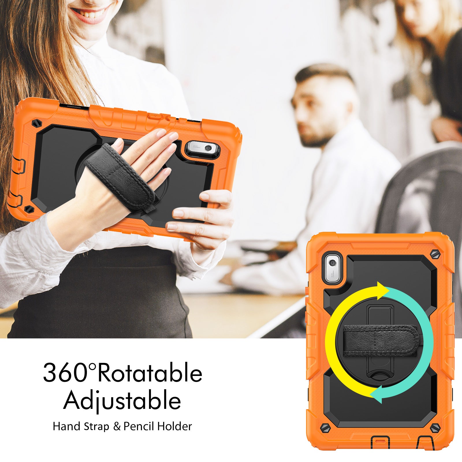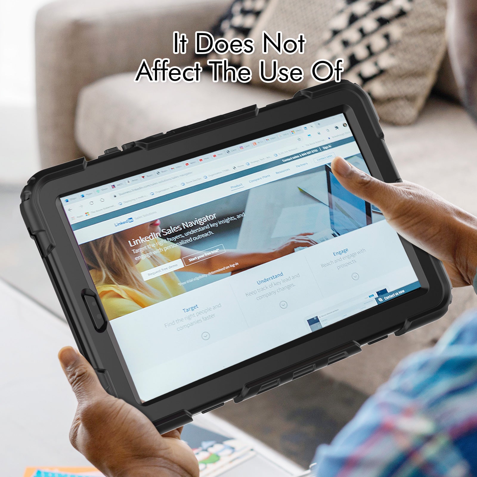 This 3-layers multifunction tablet case is combined with hard PC frame with built-in PET screen protector, hard PC inner layer with built-in kickstand hand strap, and outer silicone layer. Impact-resistant design and shock-absorbing silicone + PC materials fully cover the back and edges, protecting against accidental drops and falls.. The rotary kickstand can free your hands when you're reading, watching, and surfing the internet in your free time. The portable hand grip kickstand is designed for easy carrying.